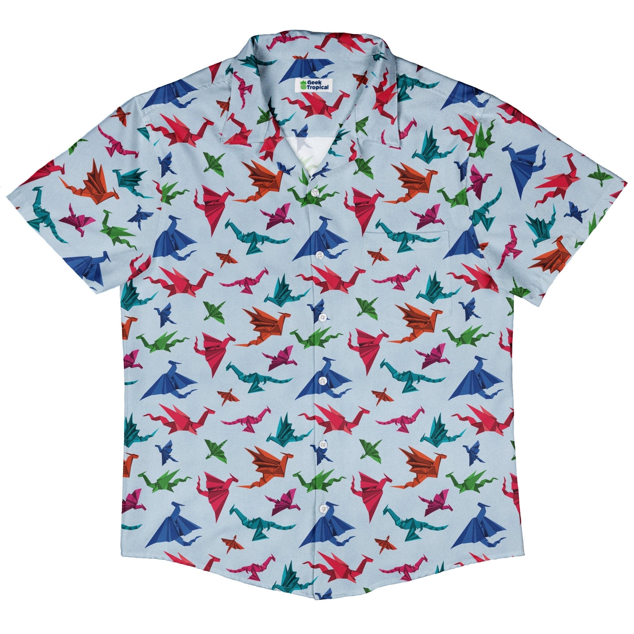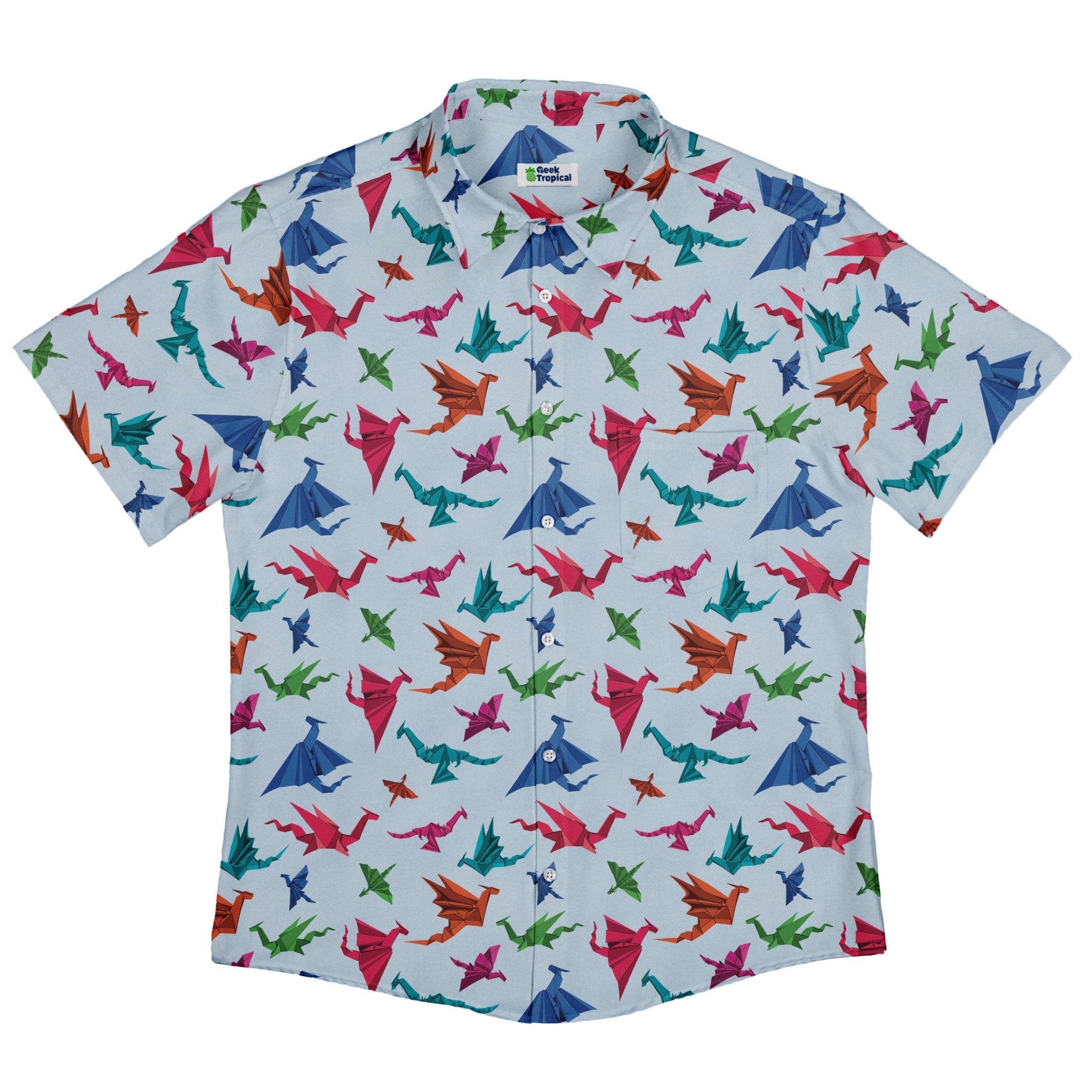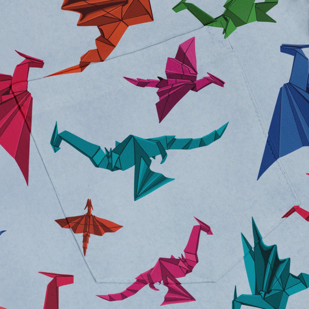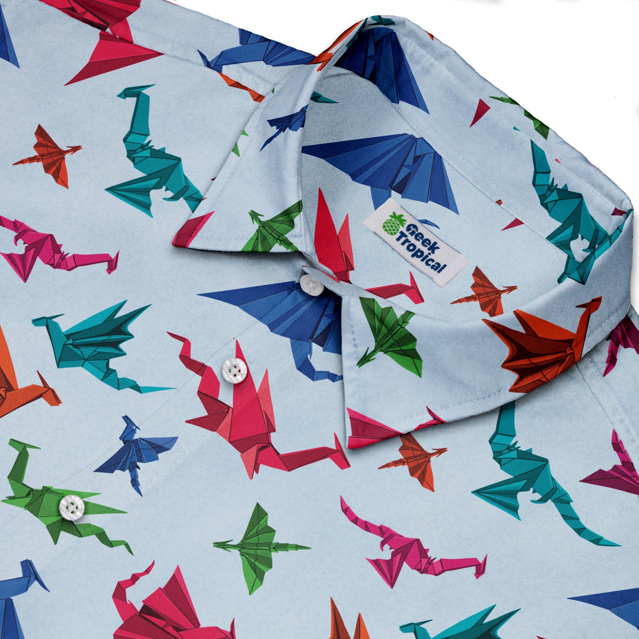 Meet the Origami Dragons Light Button Up Shirt, where paper‑folded fantasy unfolds across a clean, light backdrop. Crisp geometric dragons glide over the fabric with tidy linework and sharp creases, and the print continues neatly across the placket and optional pocket for a seamless look. Designed by Nathan, it blends nerdy charm with everyday polish. Eco‑conscious, licensed art means your style supports the artist.