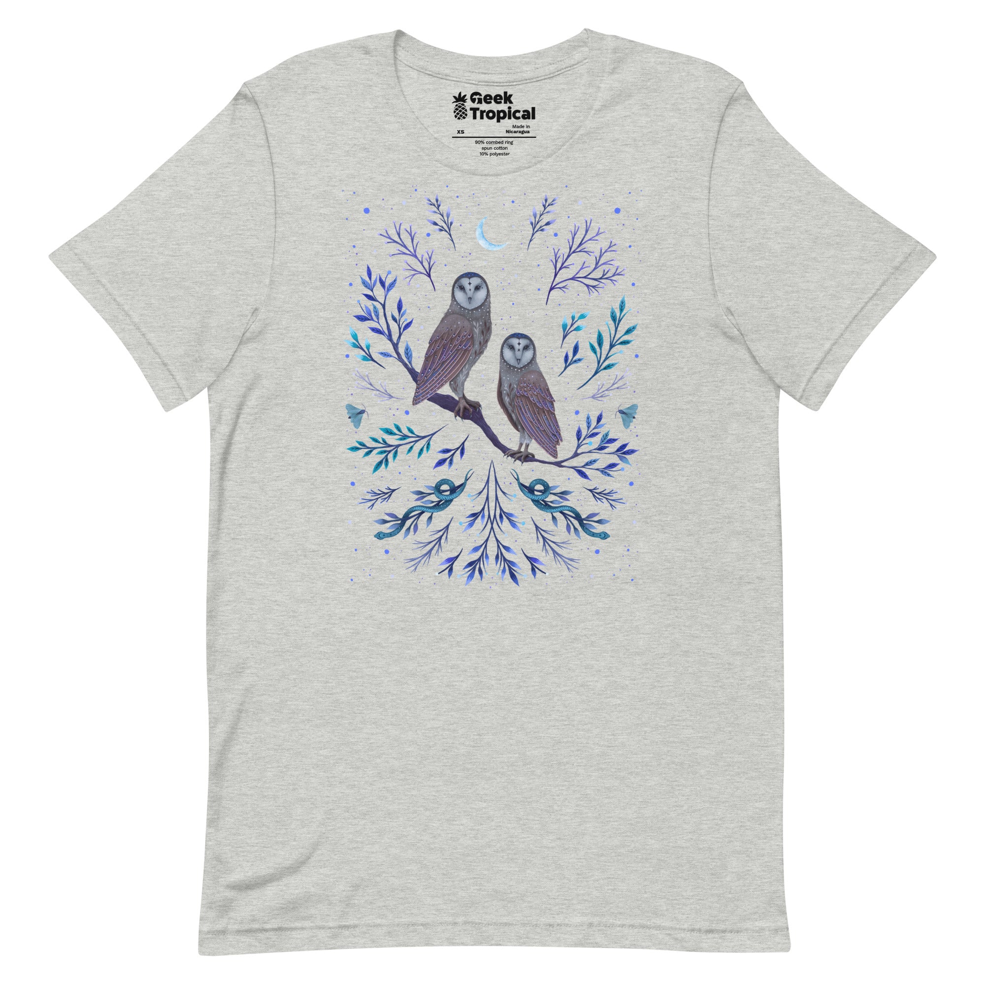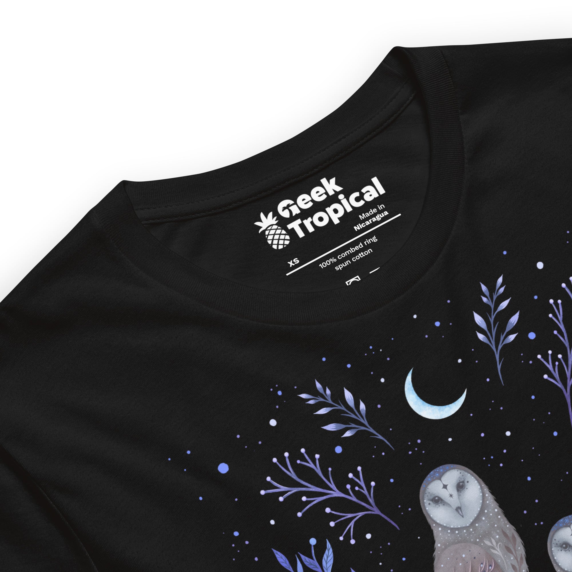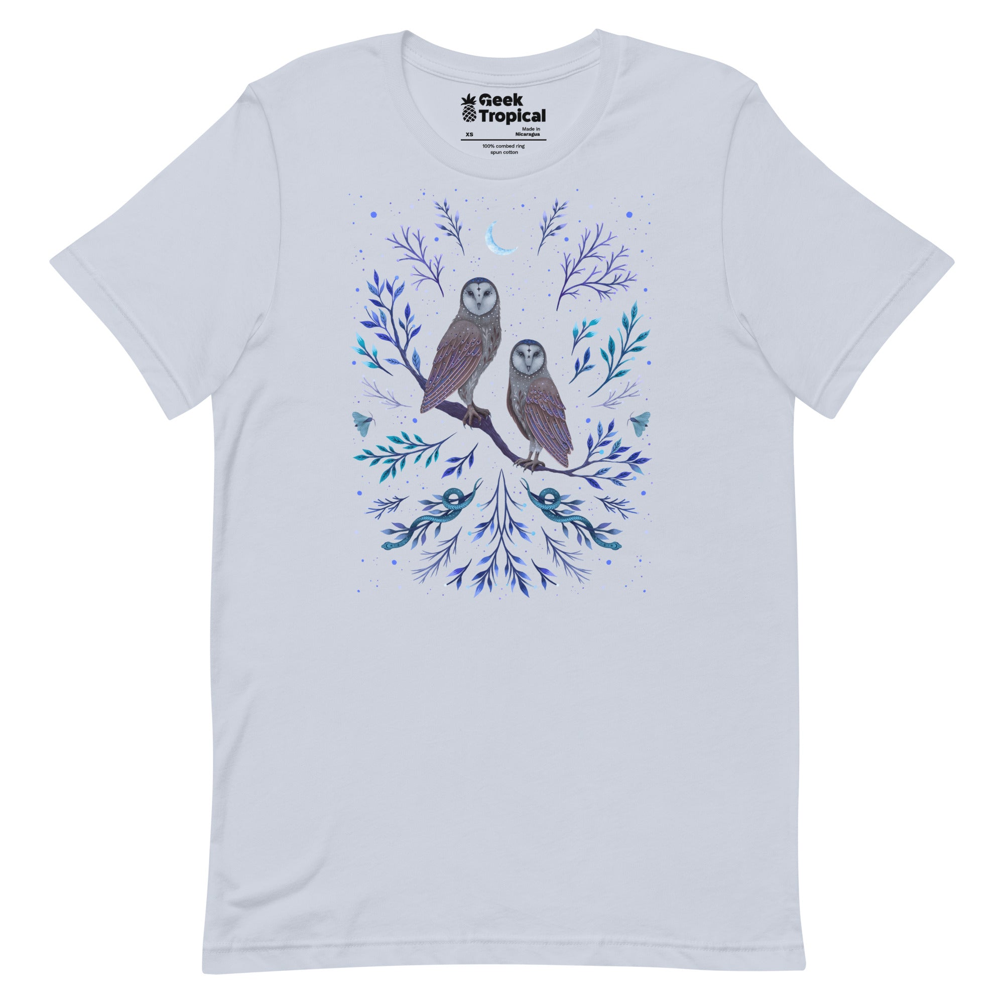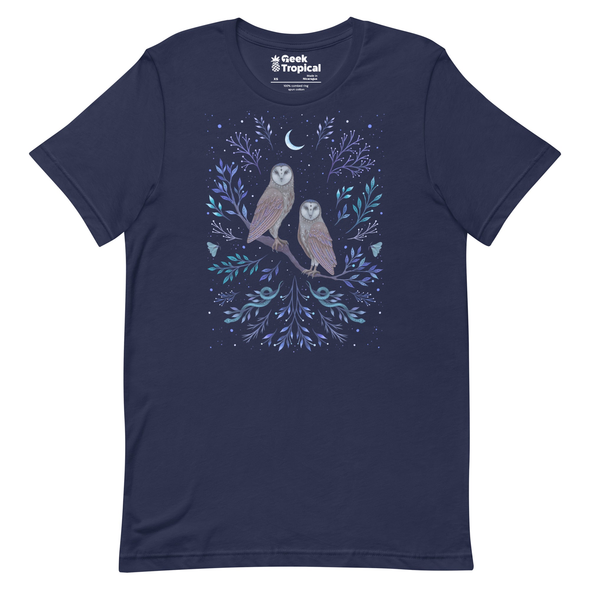 Owls In The Moonlight T-Shirt swoops in with nocturnal charm. Watchful owls rest beneath a glowing moon, feather detail etched in clean lines against a star-dusted sky for a softly cosmic vibe. Designed by Episodic Drawing, this artist-backed print balances serene night energy with geeky celestial flair, delivering rich, lasting color that keeps its quiet magic through countless wears.