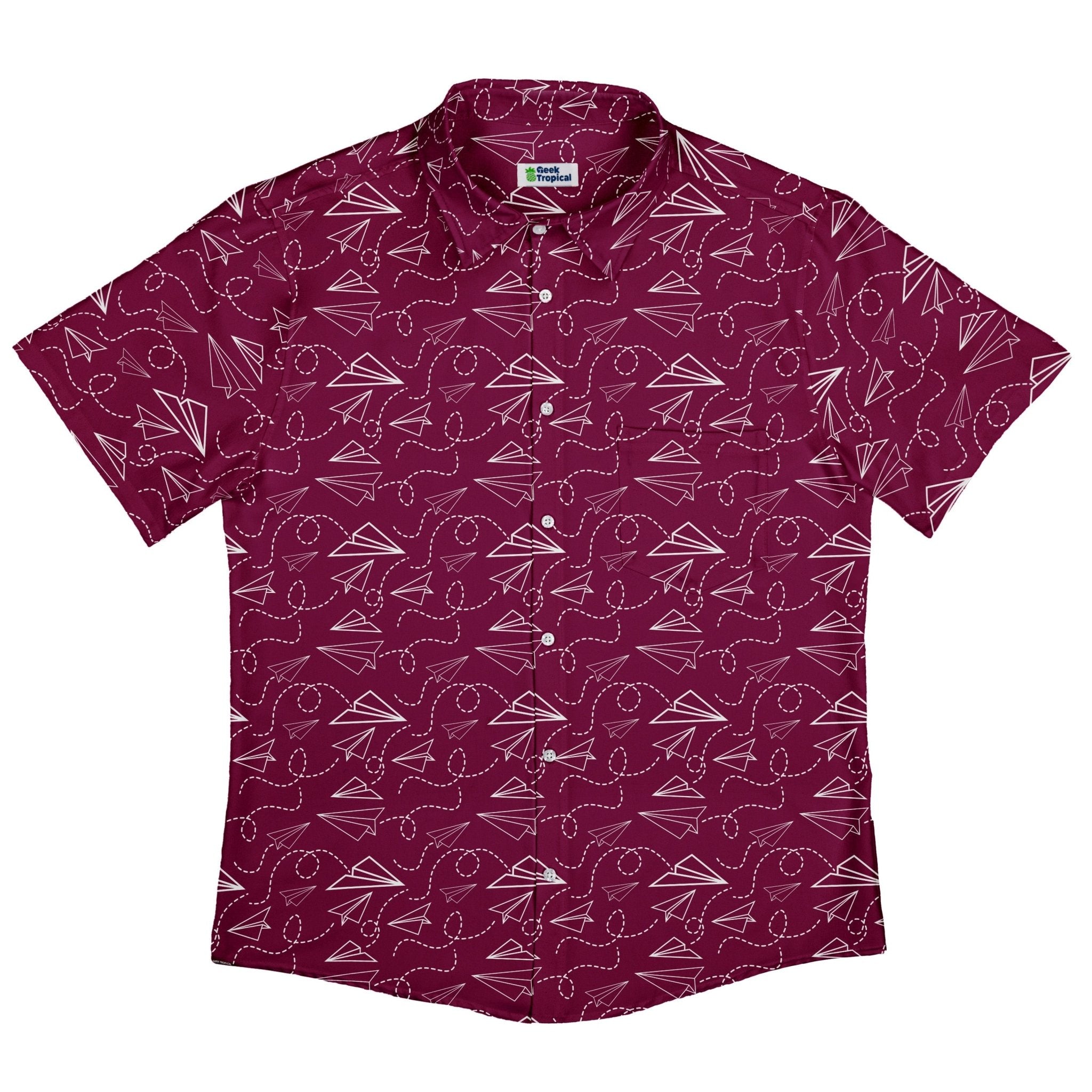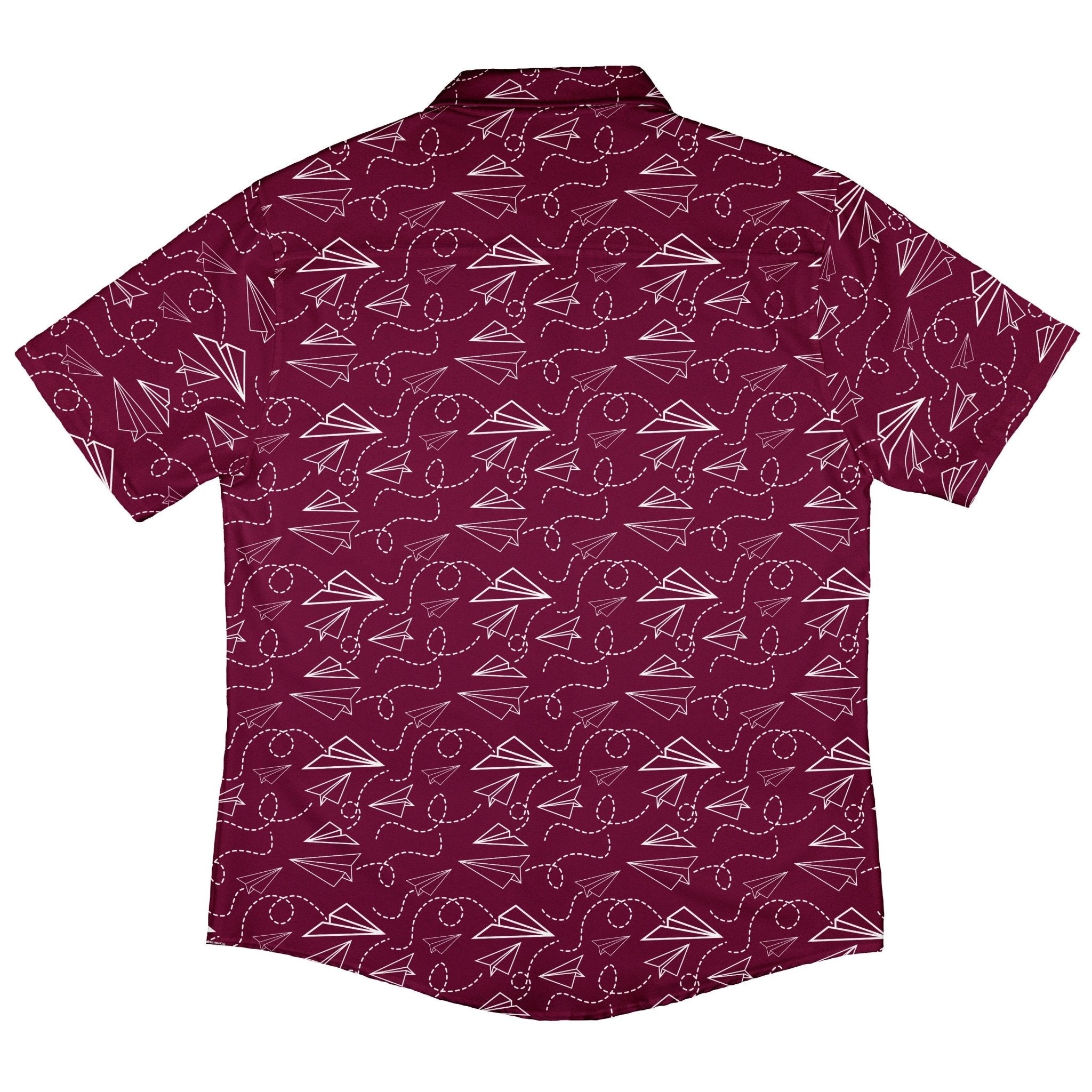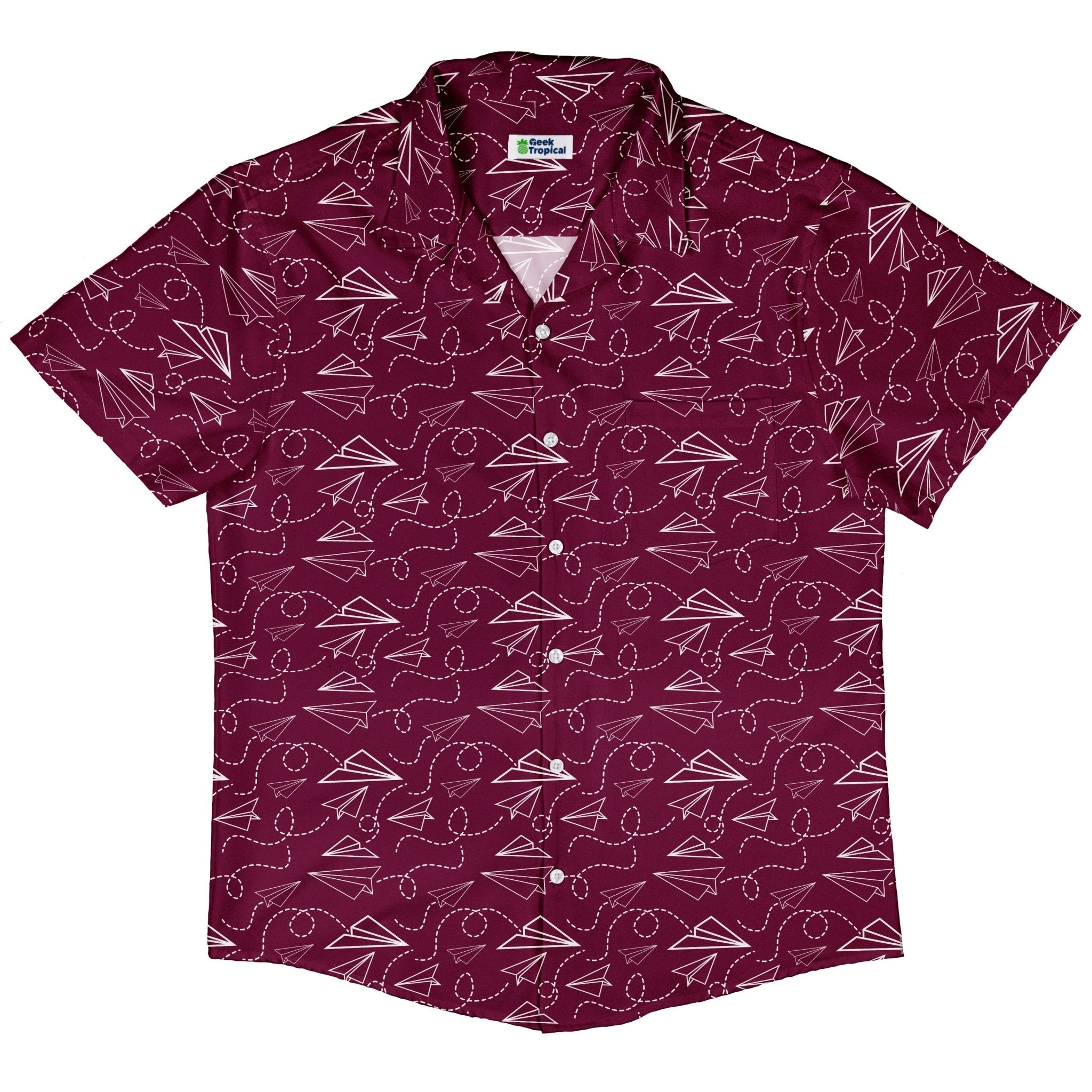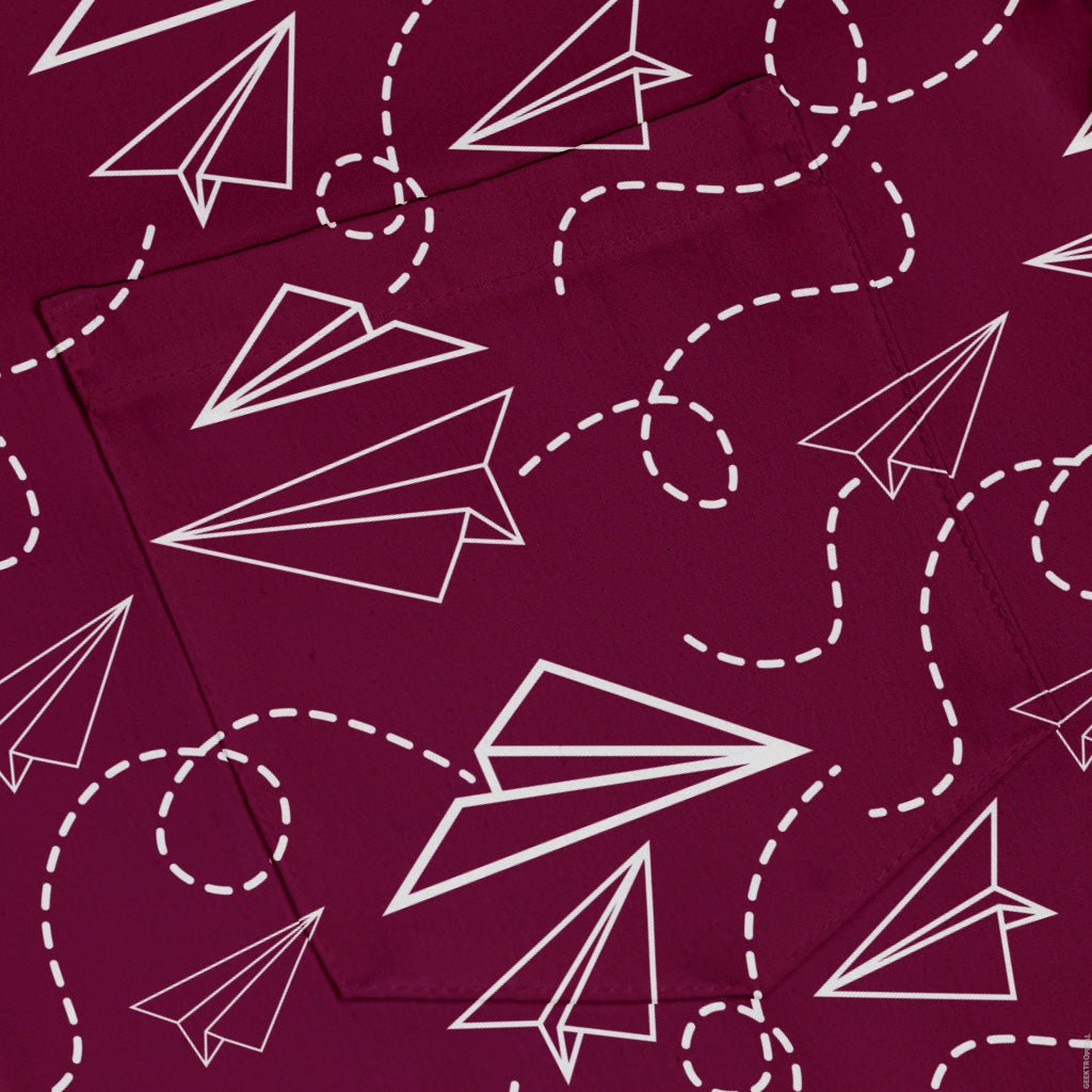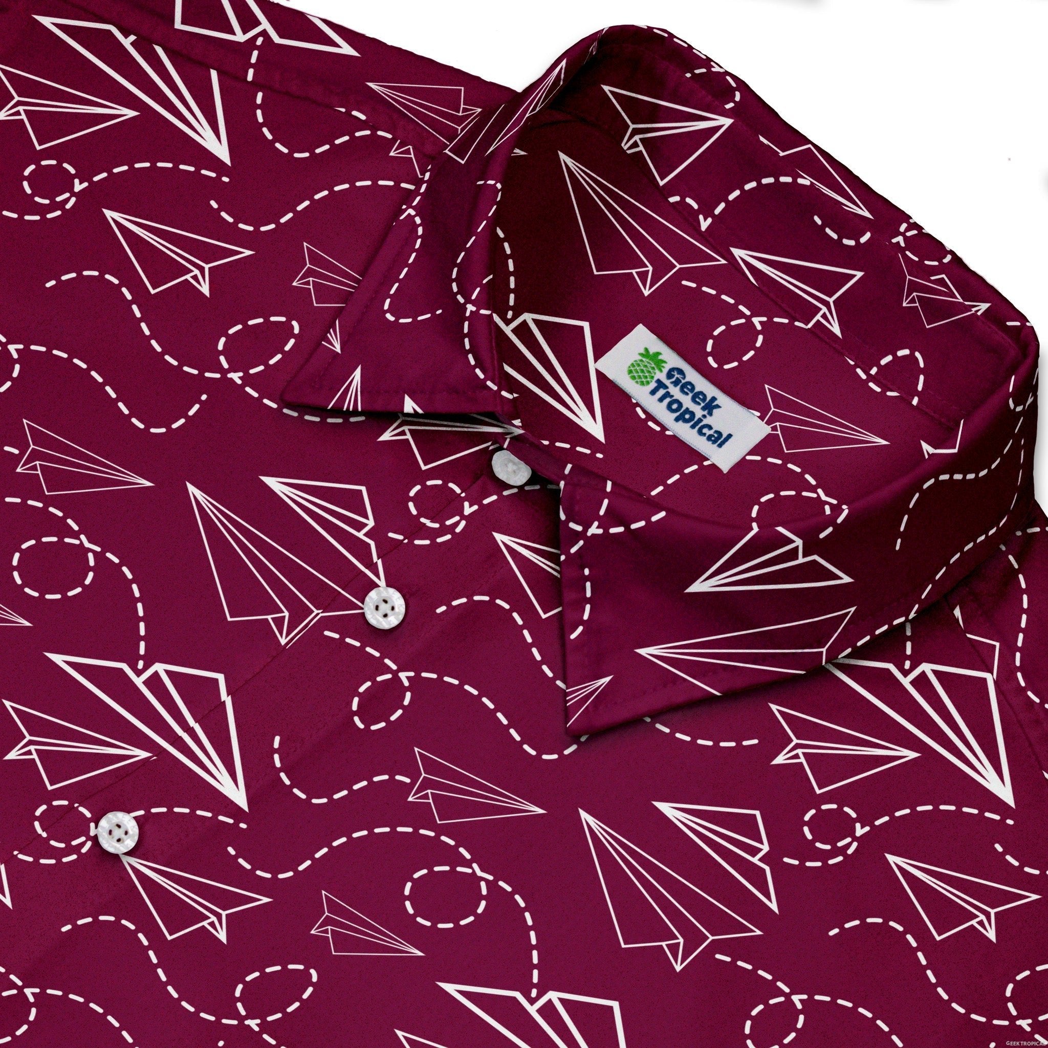 The Paper Airplanes Red Button Up Shirt celebrates low-tech flight with high-style swagger. A fleet of crisp paper planes arcs across a saturated red backdrop, giving motion to every angle. Designed by Heather Davenport, this unisex piece pairs a soft, breezy feel with nerdy charm. Clean lines, sharp collar, and art you can actually support—ideal for office hours, hangar tours, or your next folded masterpiece.