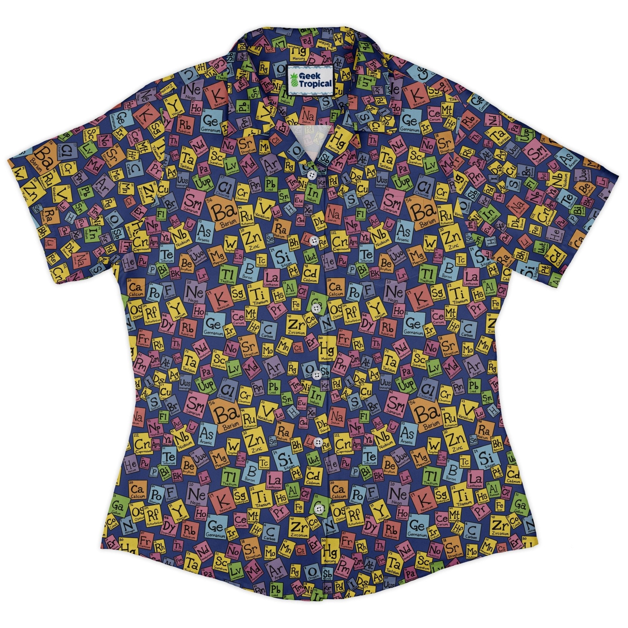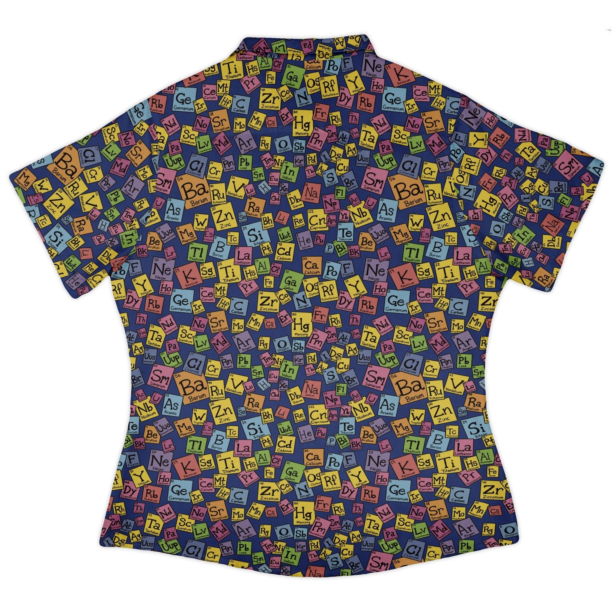 The Periodic Table Blue Curvy Button Up Shirt turns lab love into everyday style. A blue field is tiled with crisp element squares, symbols, and numbers, with the grid flowing cleanly across seams and a pattern-matched pocket. Contoured for your shape with an easy, untucked-friendly hem and sleeves you can wear fitted or relaxed. Designed by Julie Kitzes and printed with eco-conscious inks. Wear the elements, not just the basics.