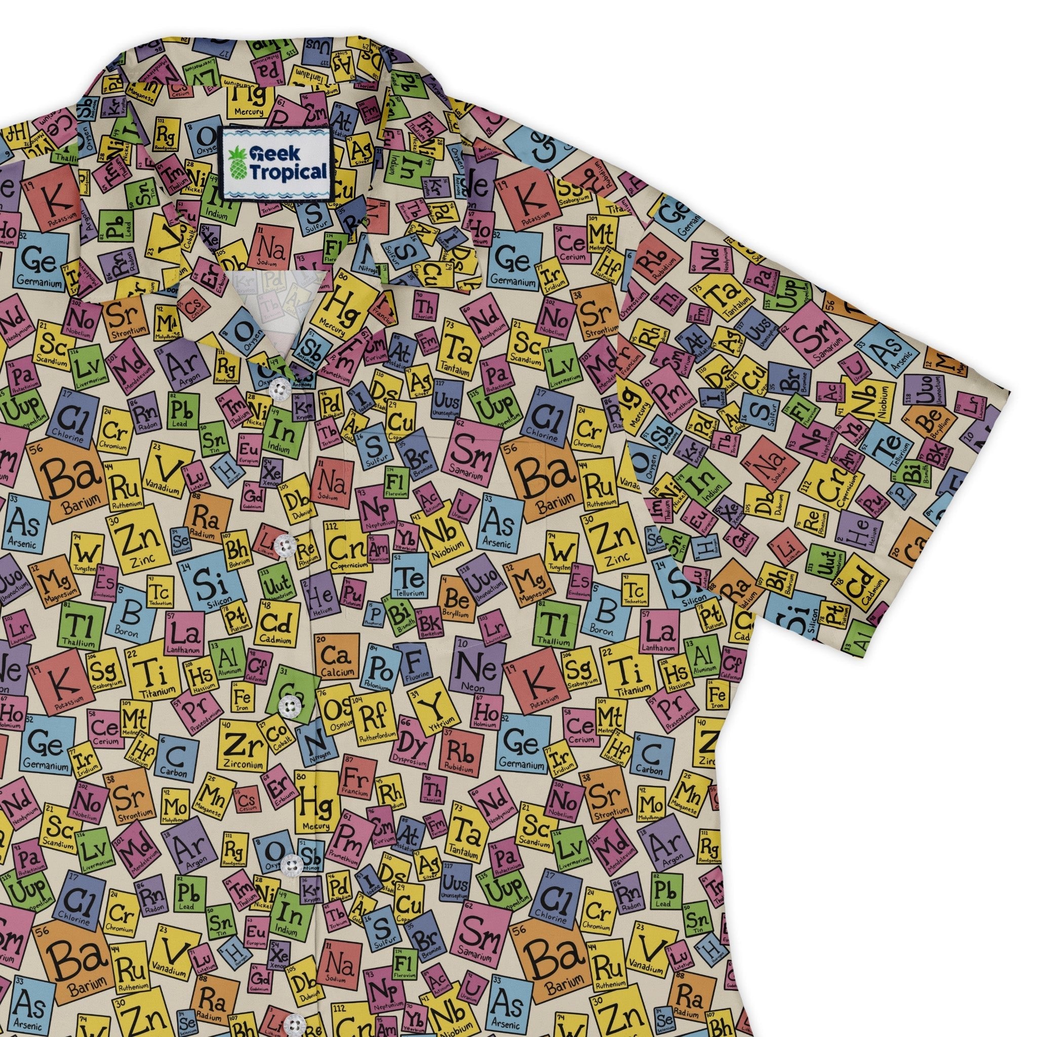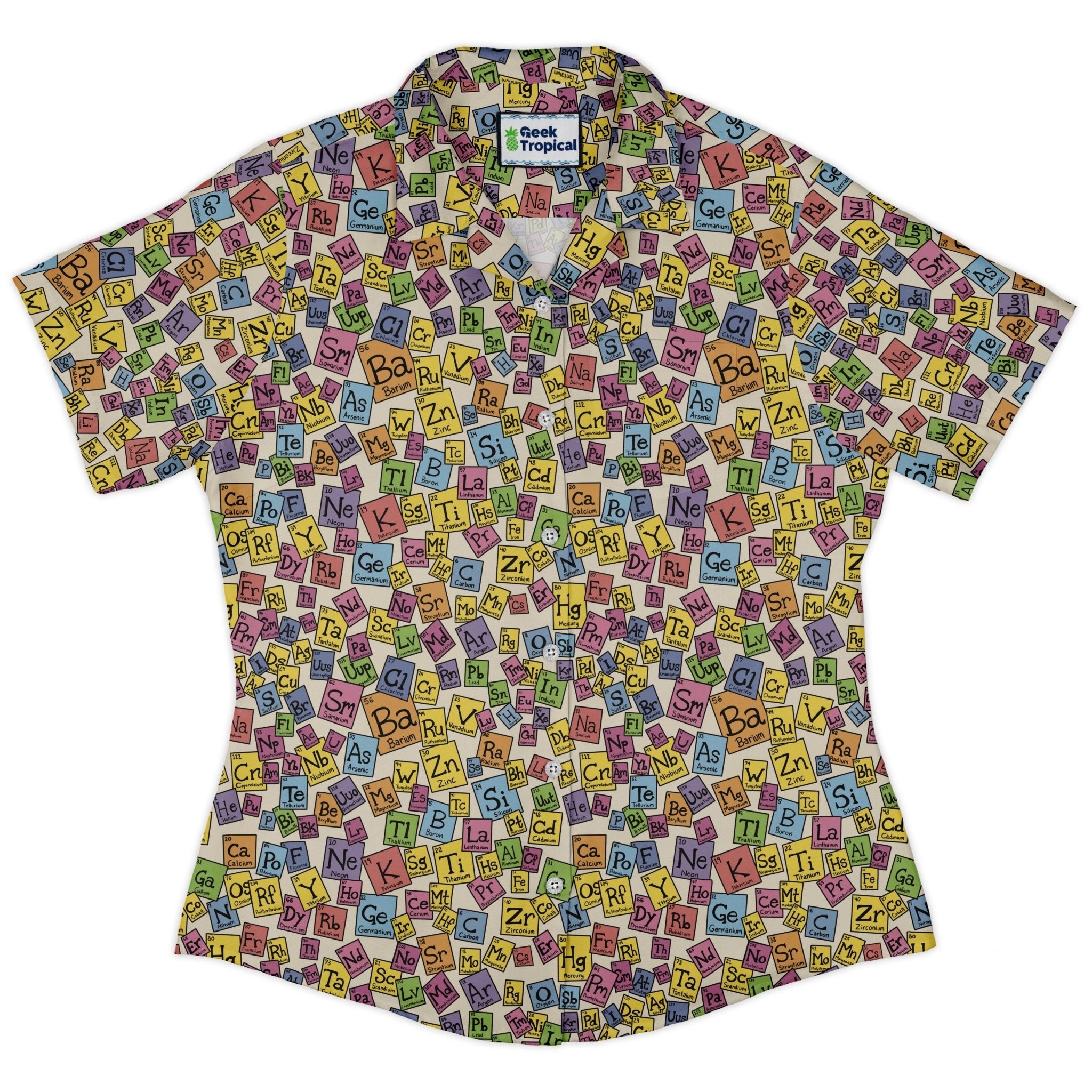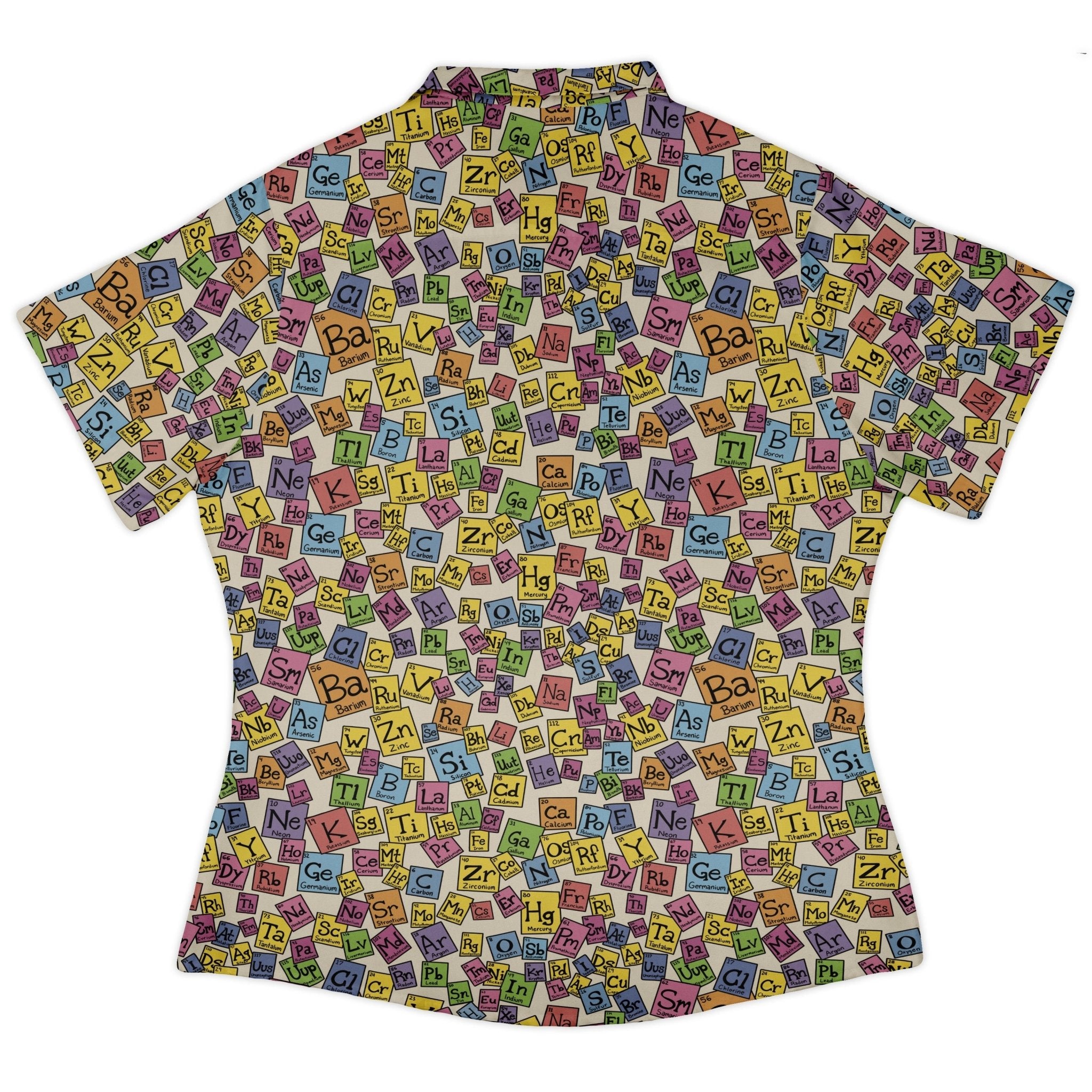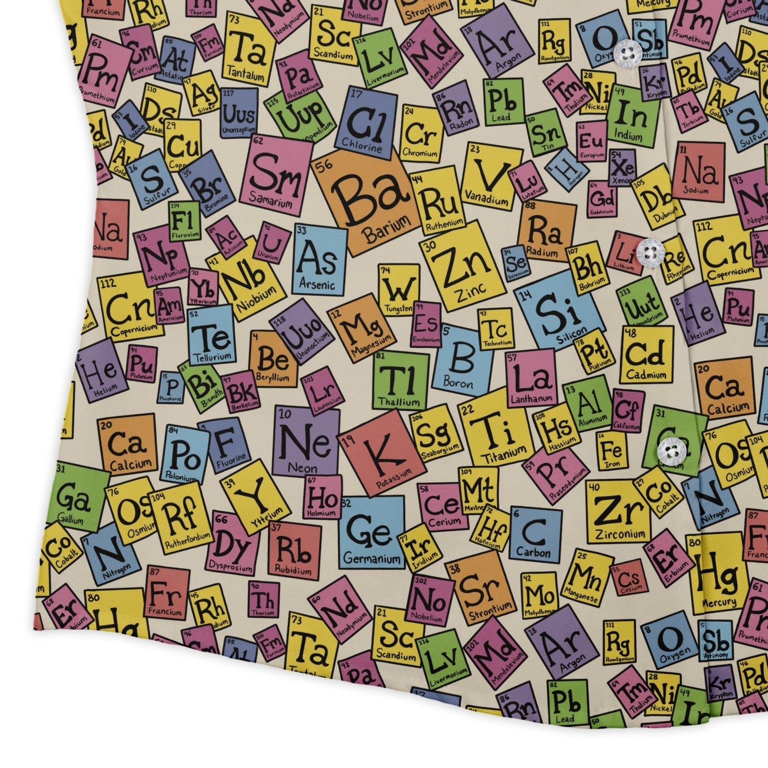 Meet the Periodic Table Tan Curvy Button Up Shirt—smart style for science lovers. A warm tan base is tiled with a crisp periodic table, color‑blocked element squares lining up cleanly across the front and pocket for a seamless grid. Tailored for curves with an easy-to-wear hem and adjustable sleeves, it feels light and breathable all day. Finished with branded buttons, eco‑conscious inks, and designed by Julie Kitzes to support licensed artists.