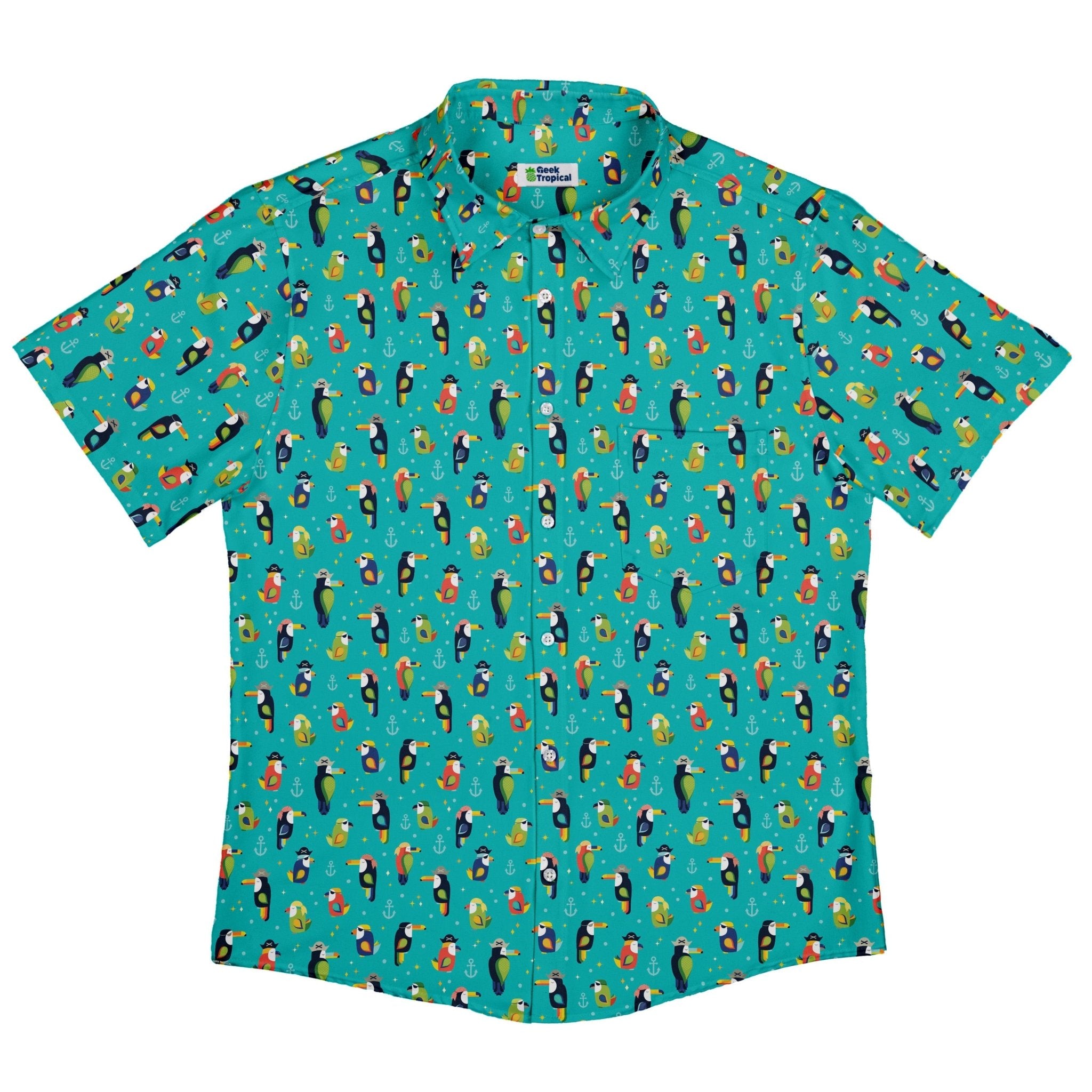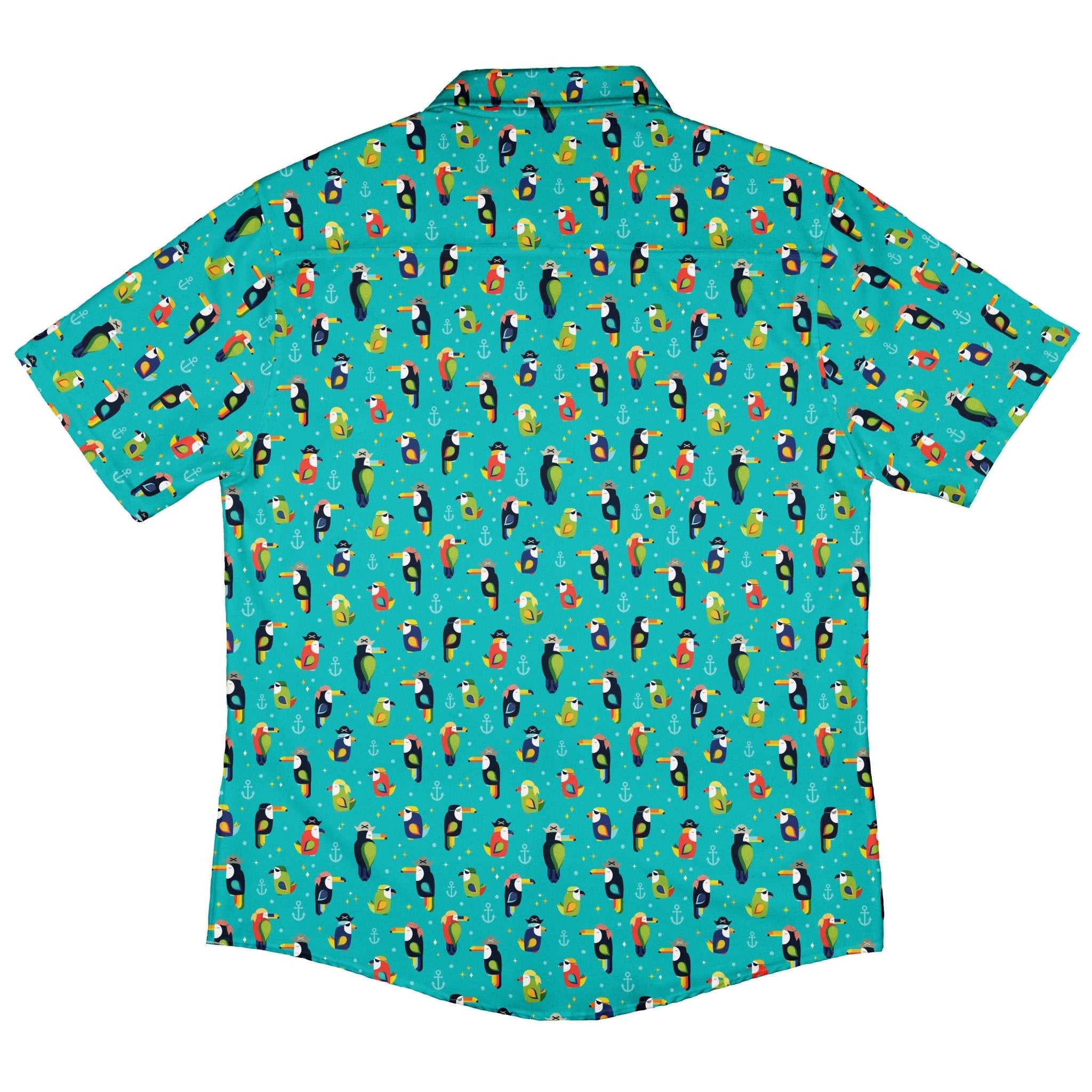 Pirate Toucans Button Up Shirt turns avian attitude into full-on swashbuckle: a repeat of toucans kitted out in pirate flair, strutting across a bold, tropical backdrop with clean, high-contrast linework. The artwork flows neatly across the front for a polished look, and the branded buttons anchor the vibe. Designed by Zirkus Design and printed with eco-conscious inks, this funny, adult-sized statement levels up any sunny-day quest.