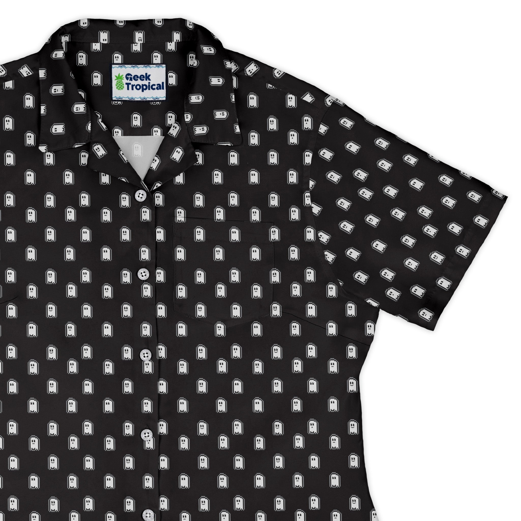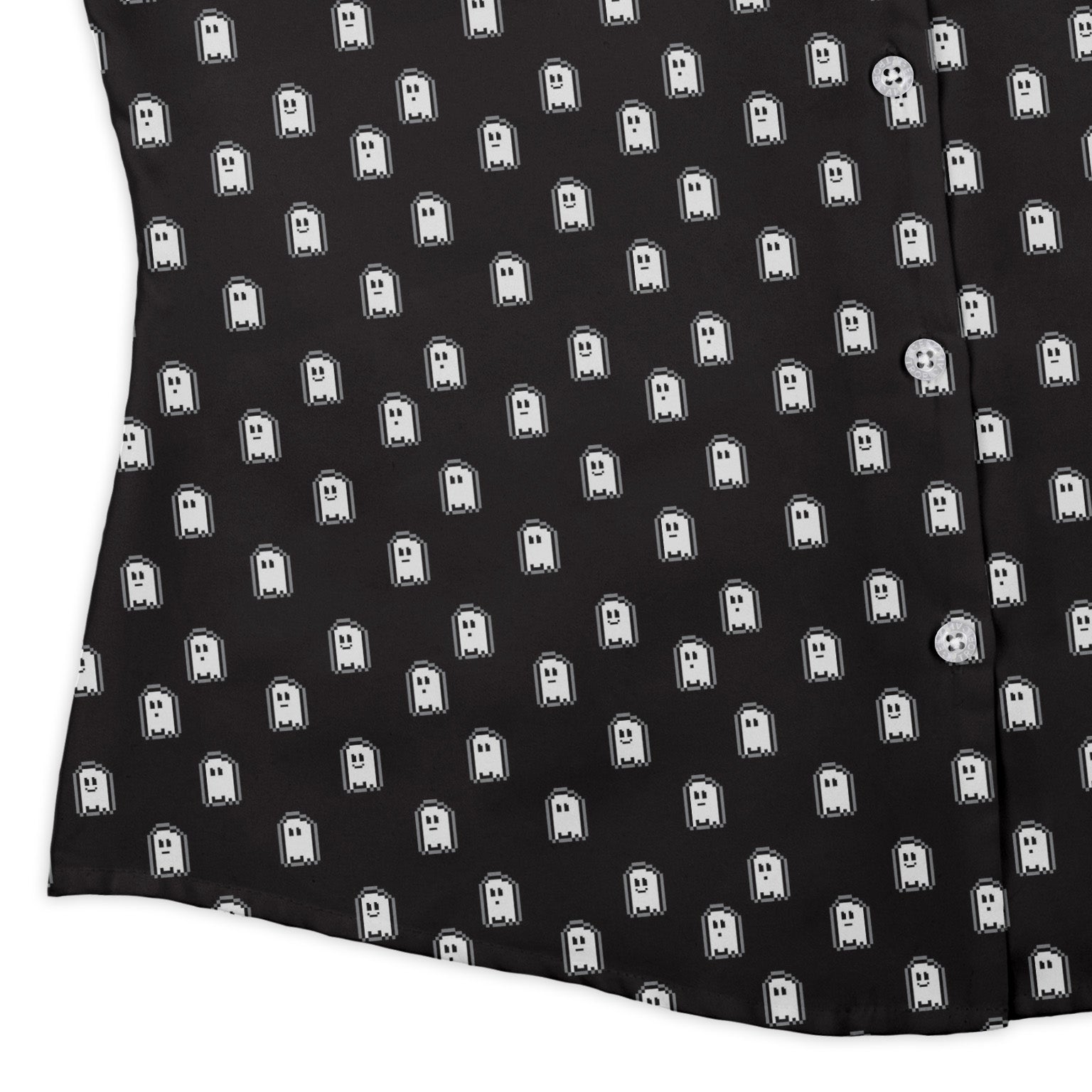 Level up your spooky-cute style with the PIxel Ghost Curvy Button Up Shirt, a women’s arcade print designed by Heather Davenport. Cheerful 8-bit ghosts drift across a dark backdrop in punchy pixel colors, matched across the placket and pocket for a seamless look. Shaped for curves with a neat untucked profile and adjustable sleeves. Soft, breathable comfort, eco-conscious inks, and artist-backed vibes for everyday questing.