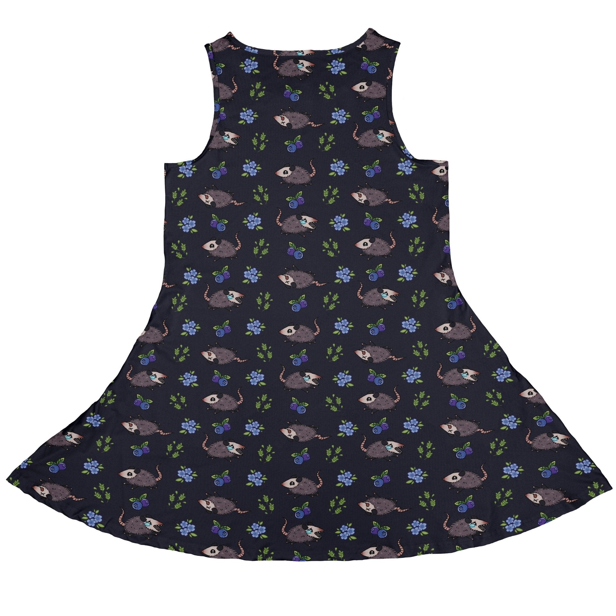 Playing Possum Dress makes mischief look chic. Ardi Tong’s illustrated opossums tumble across a seamless all‑over print, delivering geeky charm with a smooth, opaque drape. The fabric is soft with easy stretch and moves with you, keeping its polish from couch co‑op to casual Fridays. Deep side pockets stash your favorite game controller or phone. Bonus: your purchase supports licensed artists.