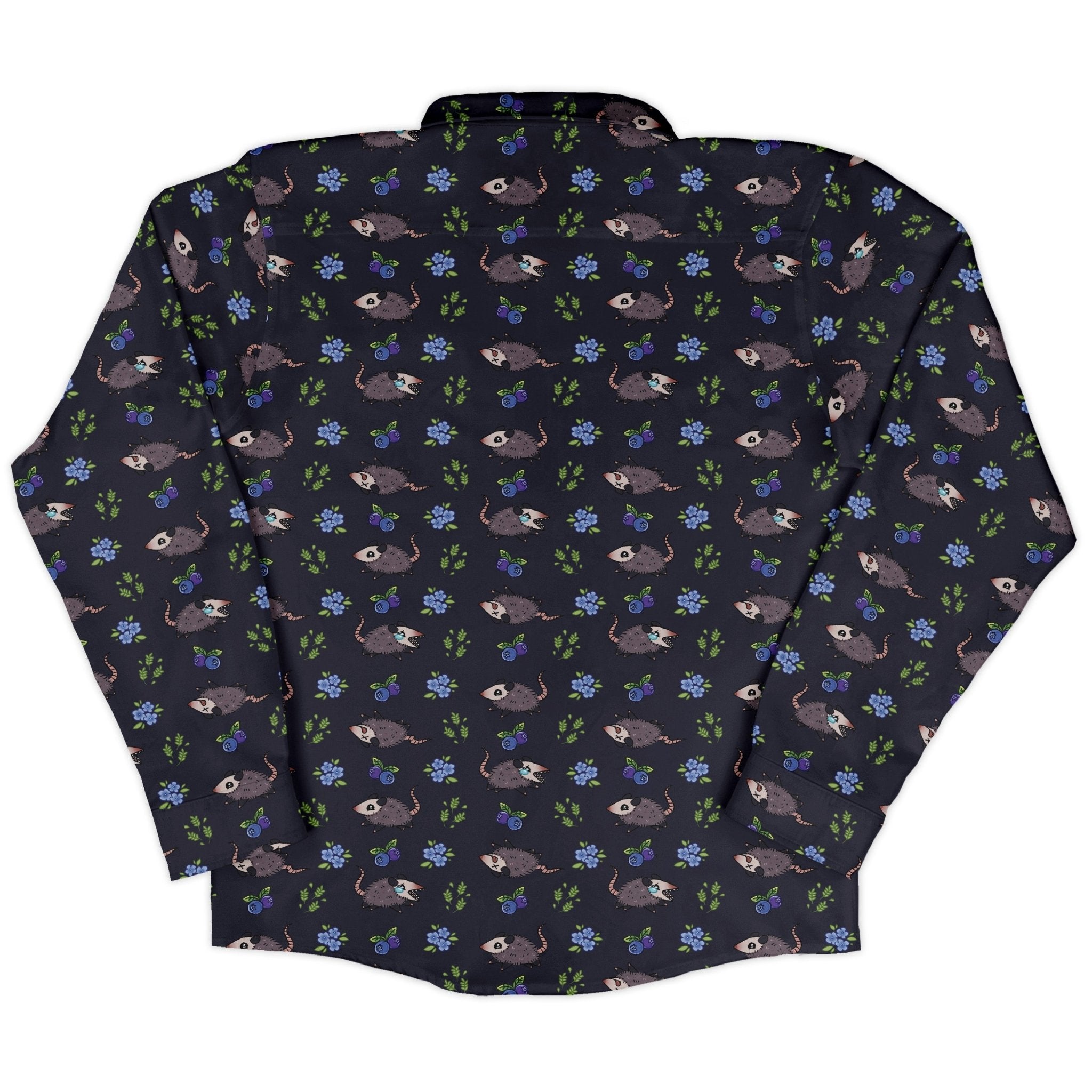 The Playing Possum Long Sleeve Button Up Shirt turns backyard mischief into wearable art. Designed by Ardi Tong, this all-over print celebrates our favorite nocturnal rascal with a tumble of illustrated opossums—curled tails, curious snouts, maximum drama. Clean lines, a pattern-matched chest pocket, and long sleeves keep it sharp for workdays and late-night snack runs. Printed with eco-friendly inks and built for everyday comfort.
