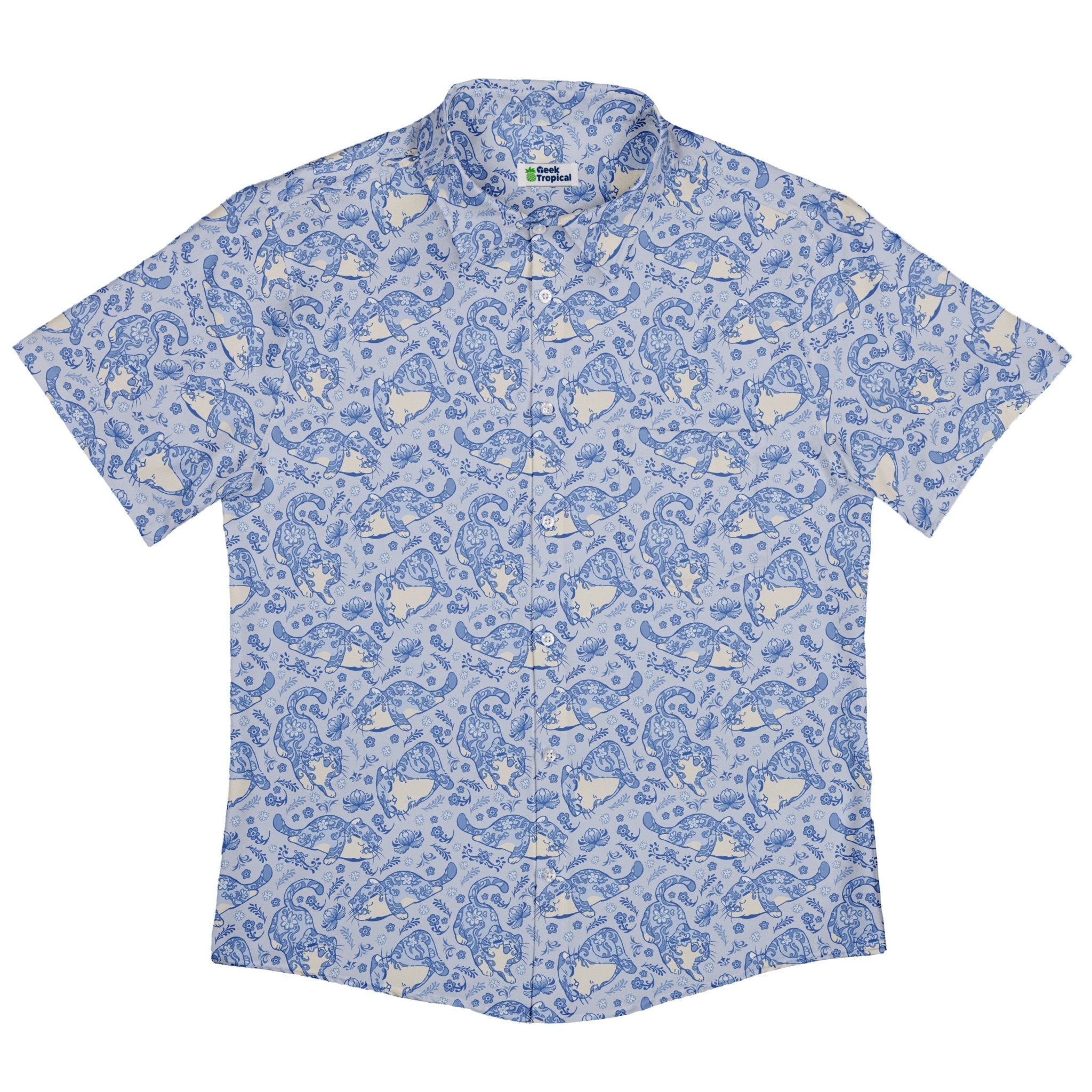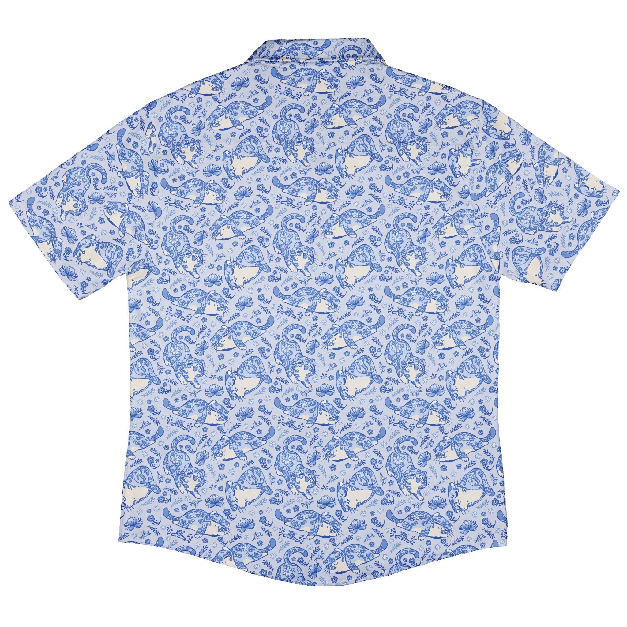 Porcelain Tigers Button Up Shirt prowls with museum-core swagger: hand-drawn tigers woven through ornate botanicals in a porcelain-inspired motif, all rendered with elegant, ink-washed linework. The maximalist print flows cleanly across the front for a seamless look. Designed by Ardi Tong and proudly artist-backed—wearable ferocity for geeks with impeccable taste.