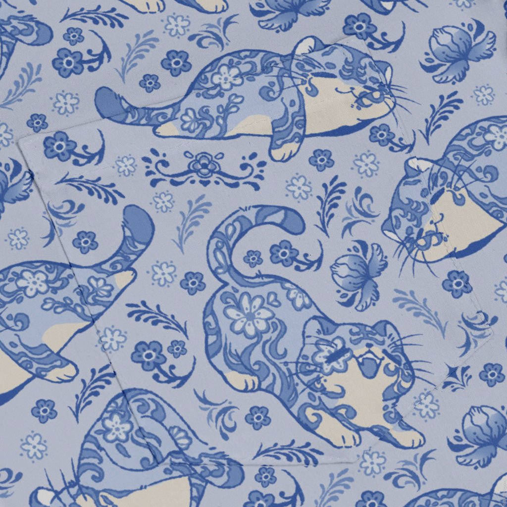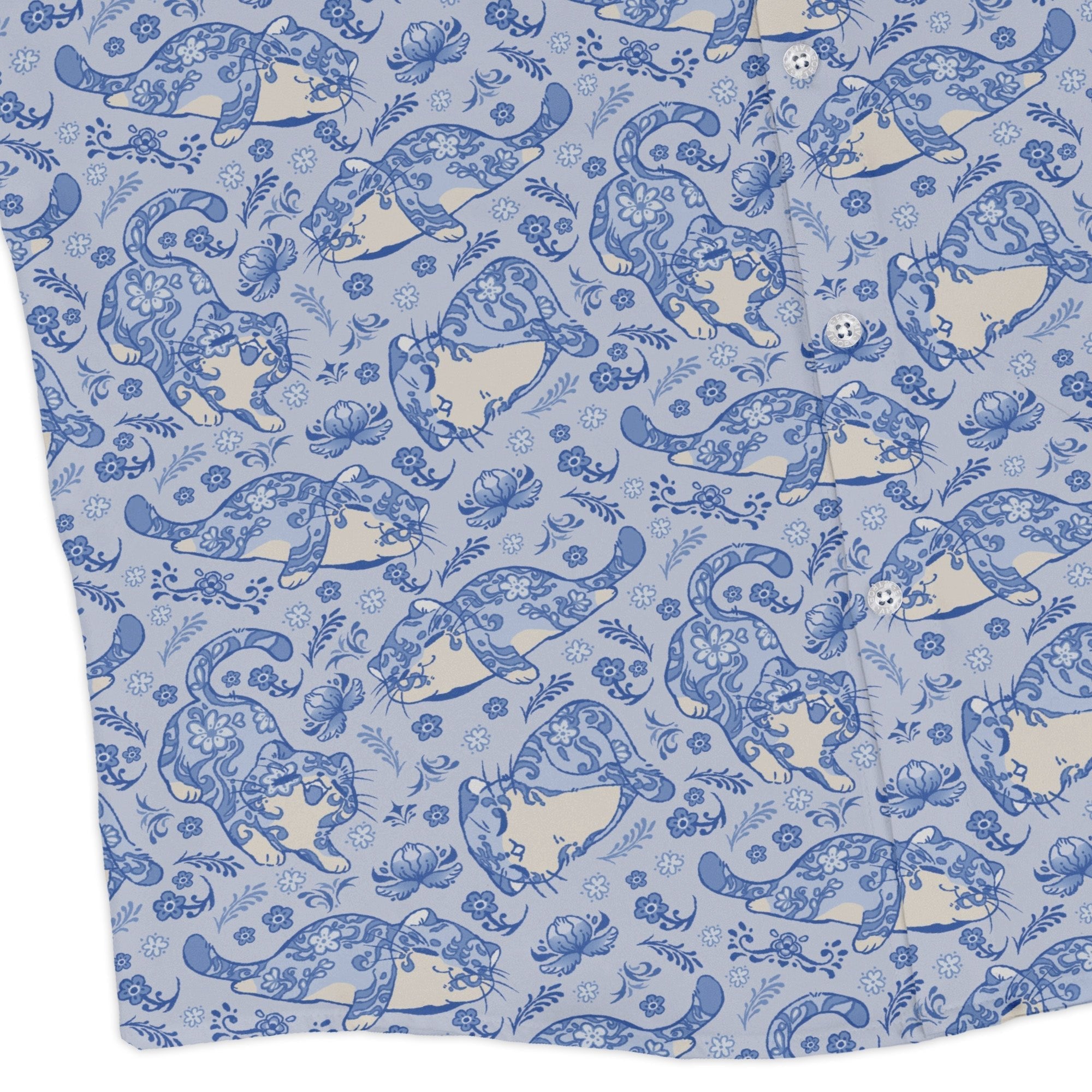 Porcelain Tigers Long Sleeve Button Up Shirt brings museum-blue drama to your wardrobe. Designed by Ardi Tong, cobalt cats prowl across a porcelain-white field, framed by delicate florals and swirling motifs. The long-sleeve, unisex cut drapes easy, with crisp collar and clean lines. Pattern alignment stays satisfyingly seamless for that gallery-level finish—ferocious, refined, and ready for your next quest or coffee run.