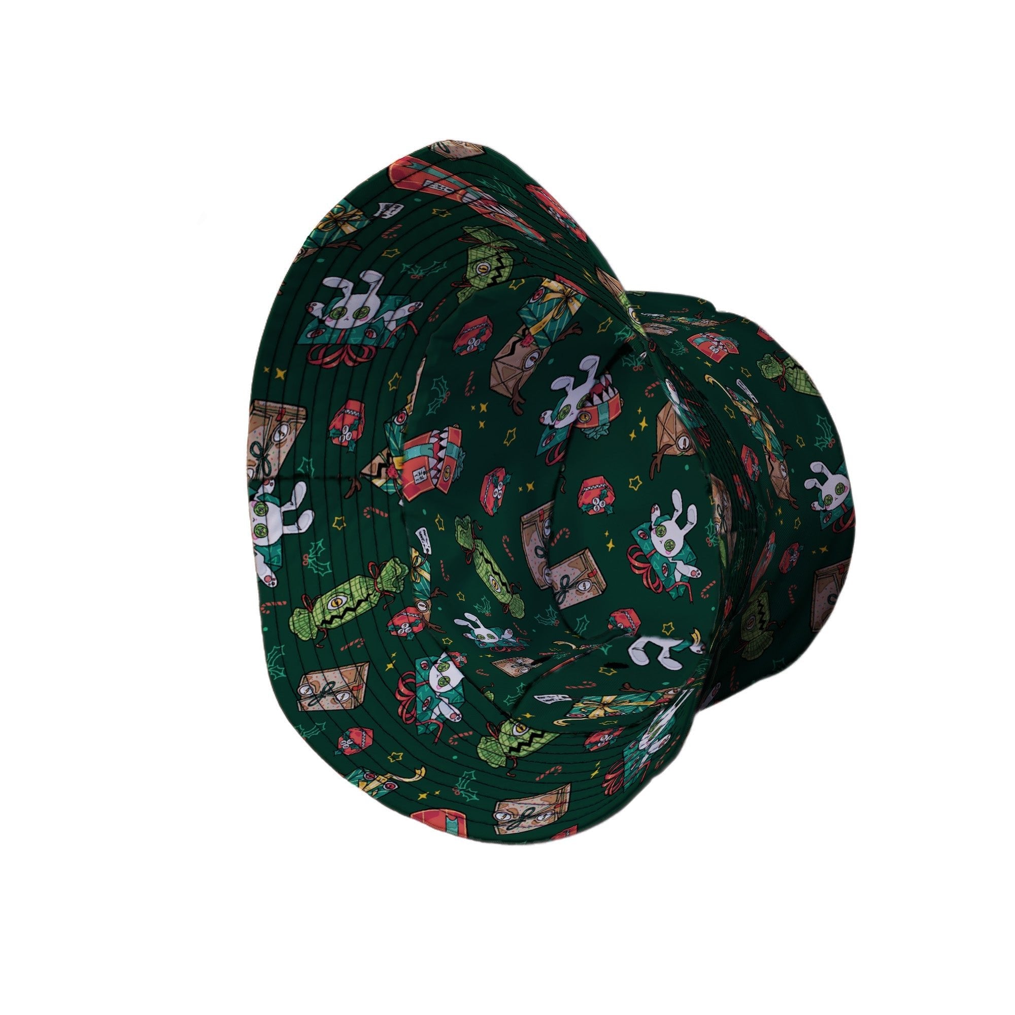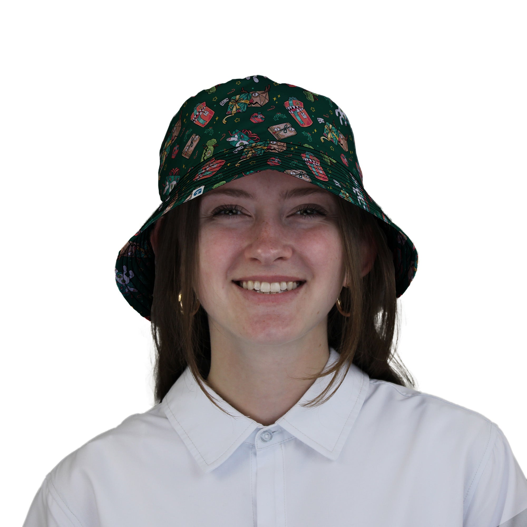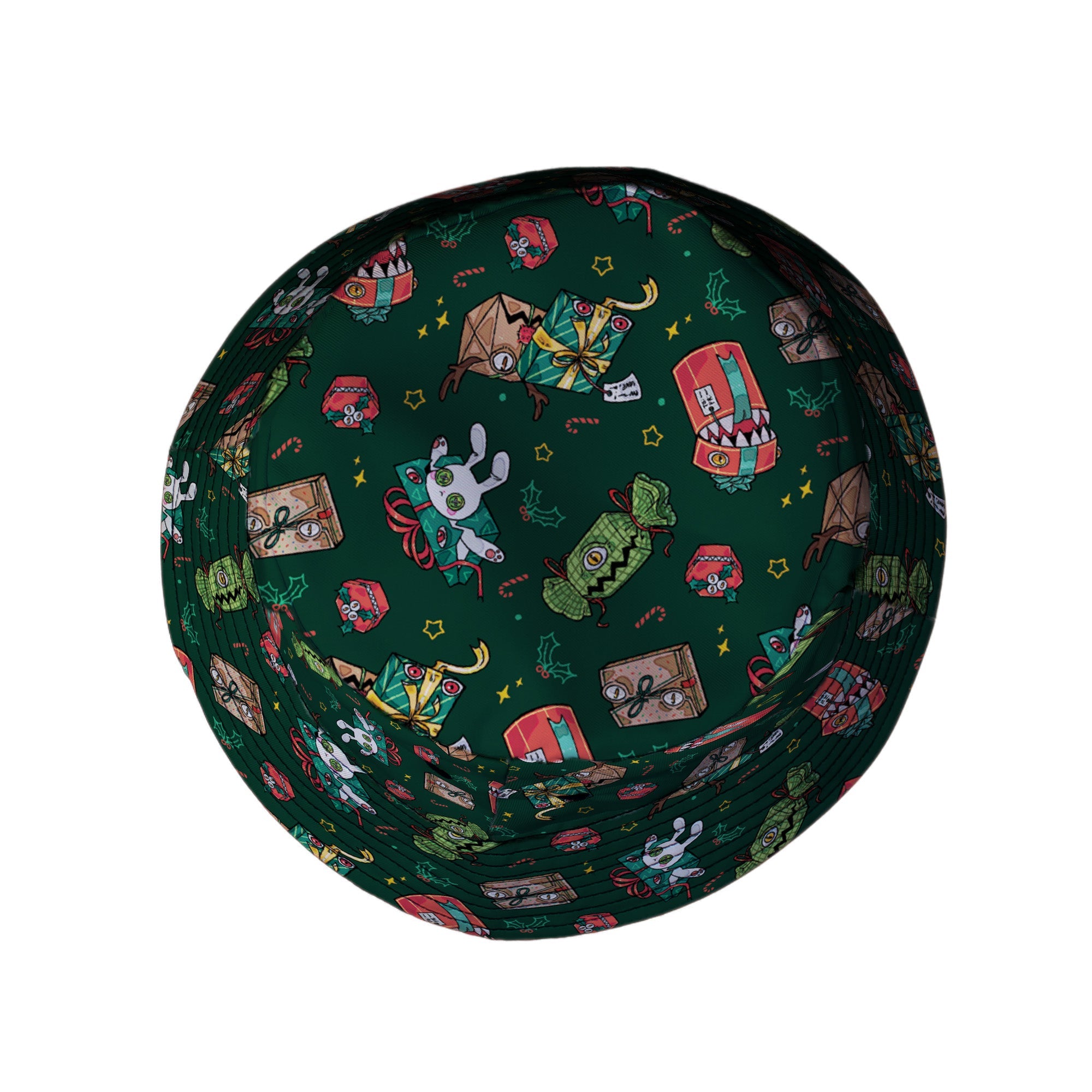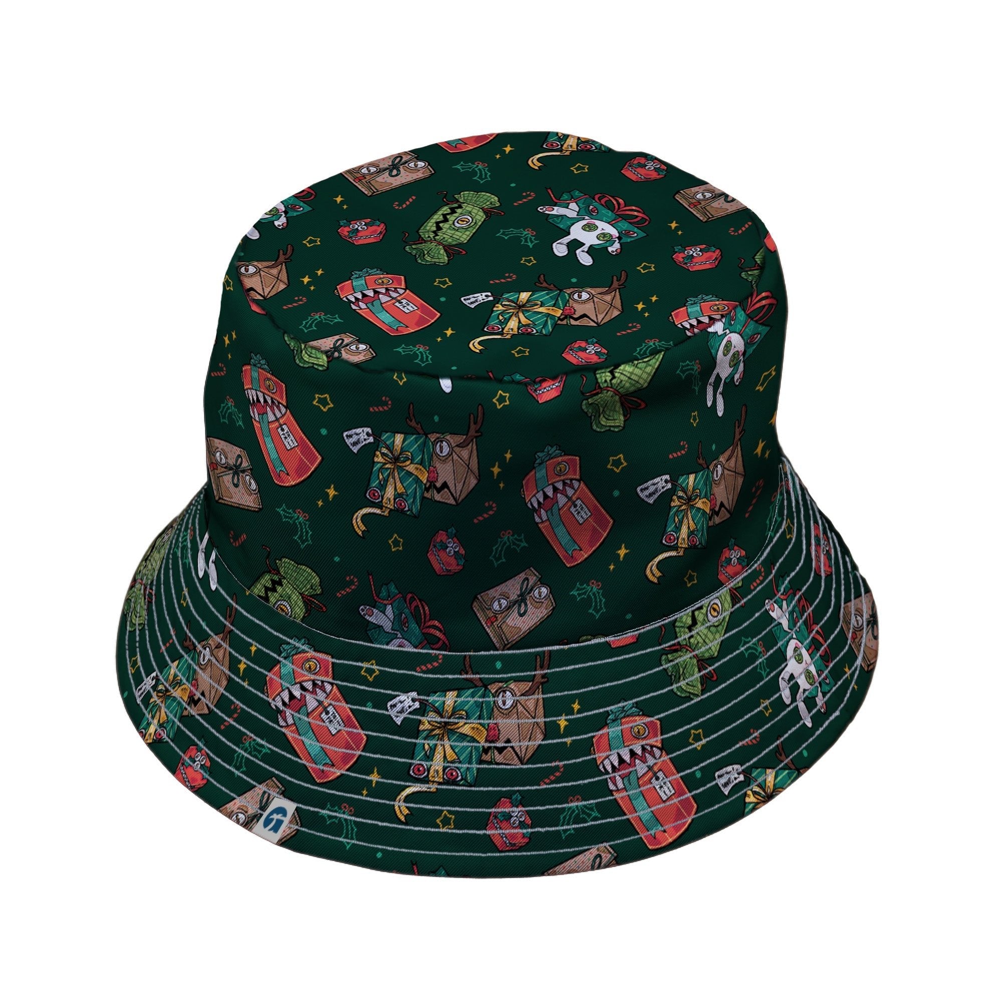 Present Mimics Green Bucket Hat brings festive mischief to your loadout, featuring grinning gift-box mimics—ribbons, eyes, and razor smiles—scattered across a rich green field. The print runs inside and out for a clean flip, so the prankster vibe stays put. Holiday-ready, Dnd-campaign approved, and designed by Ardi Tong, it’s the stealthy topper for geeks who like their cheer with bite.