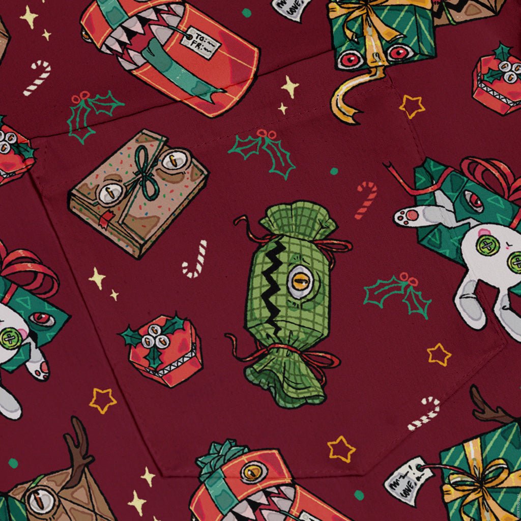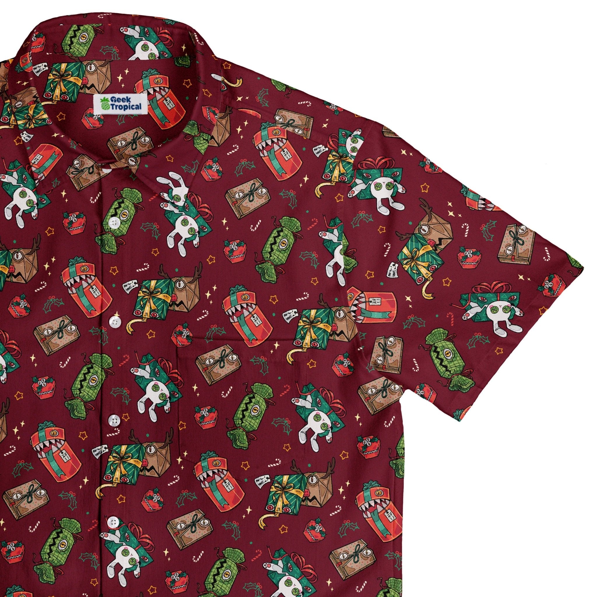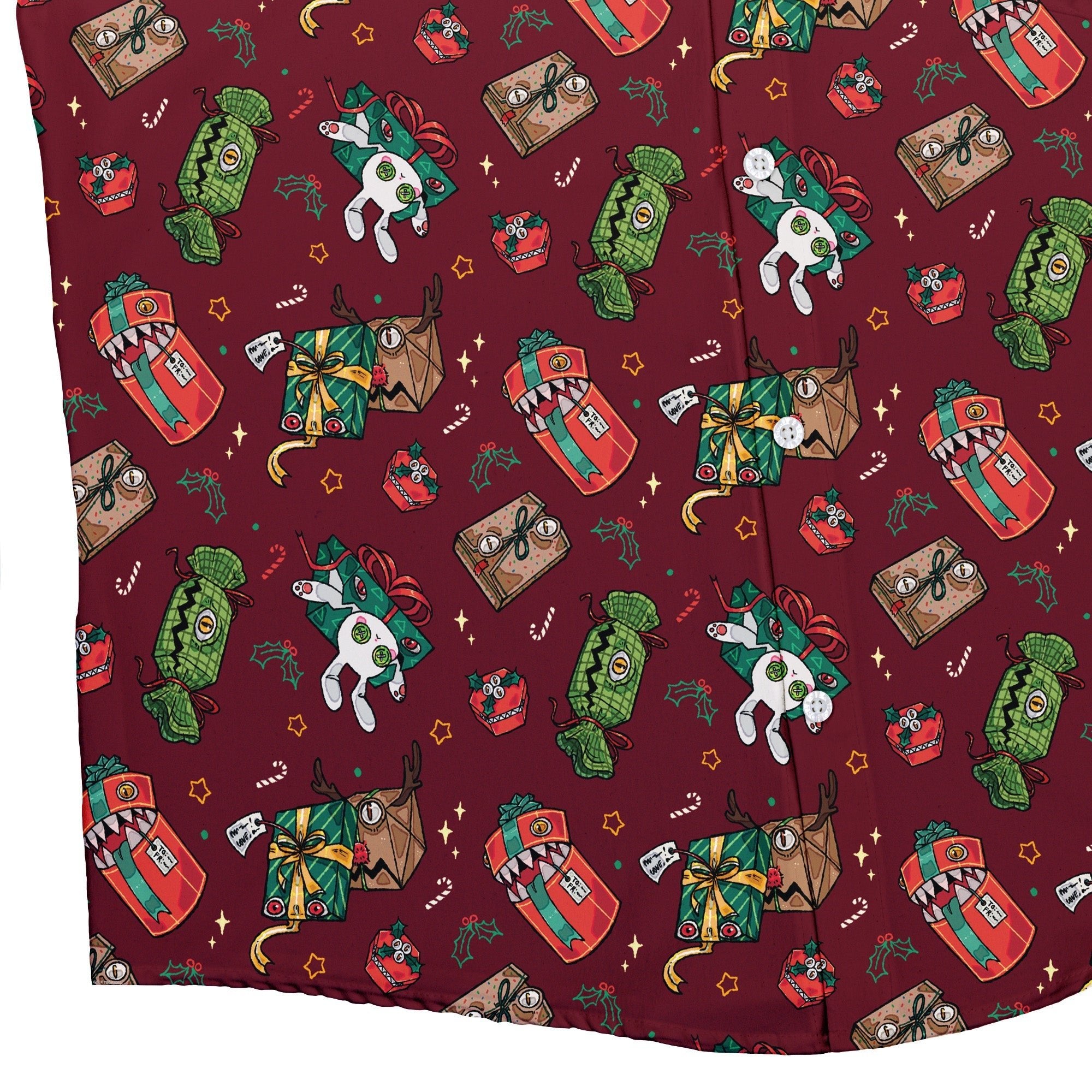 The Present Mimics Red Button Up Shirt sneaks festive charm into your wardrobe with a deep red backdrop dotted by gift-box mimics. Wrapped packages flash sharp smiles beneath tidy bows and ribbons—equal parts holiday cheer and hazard for the dungeon‑minded. Designed by Ardi Tong and printed with eco‑conscious inks, it’s a bold, conversation-starting layer for parties, game nights, and cozy mischief.