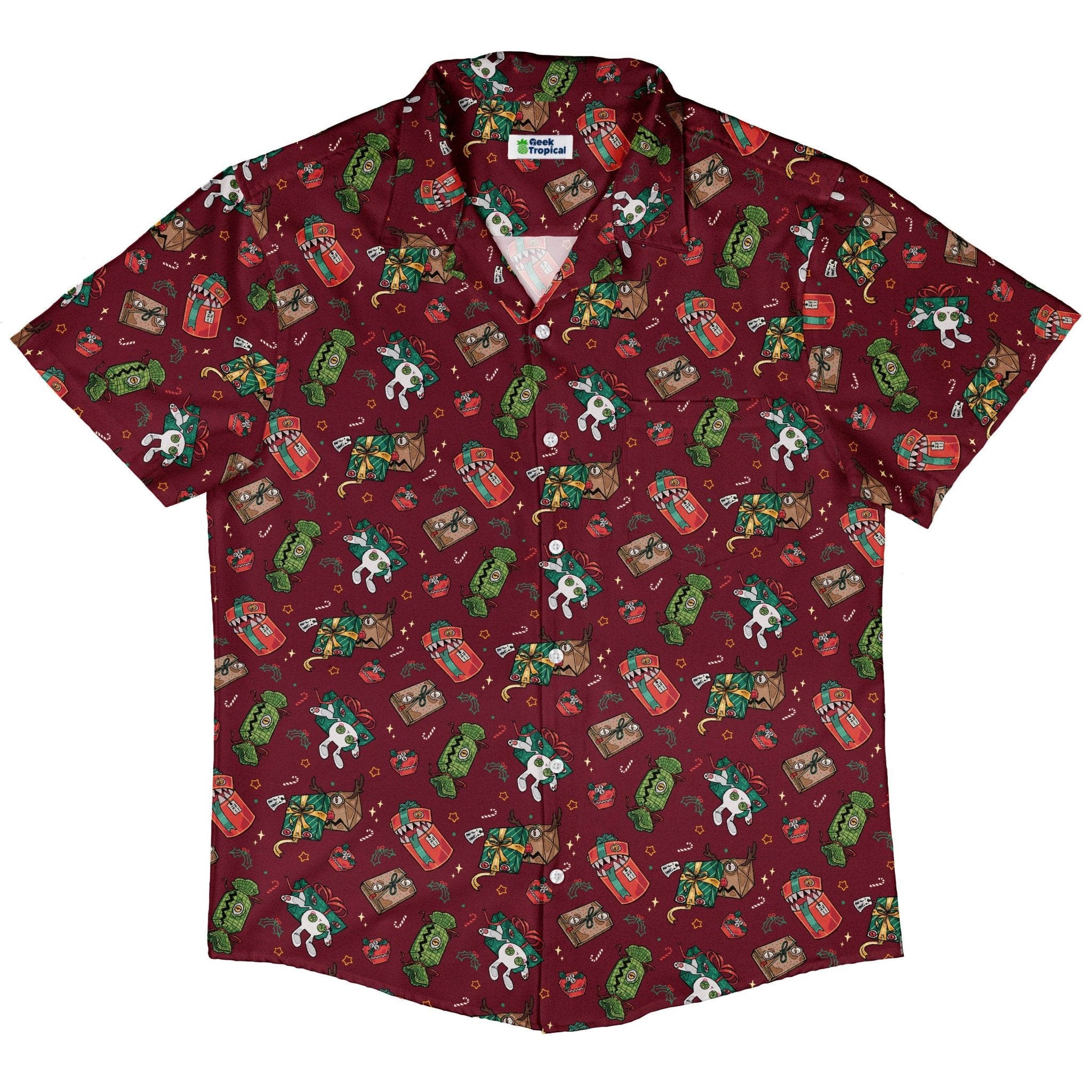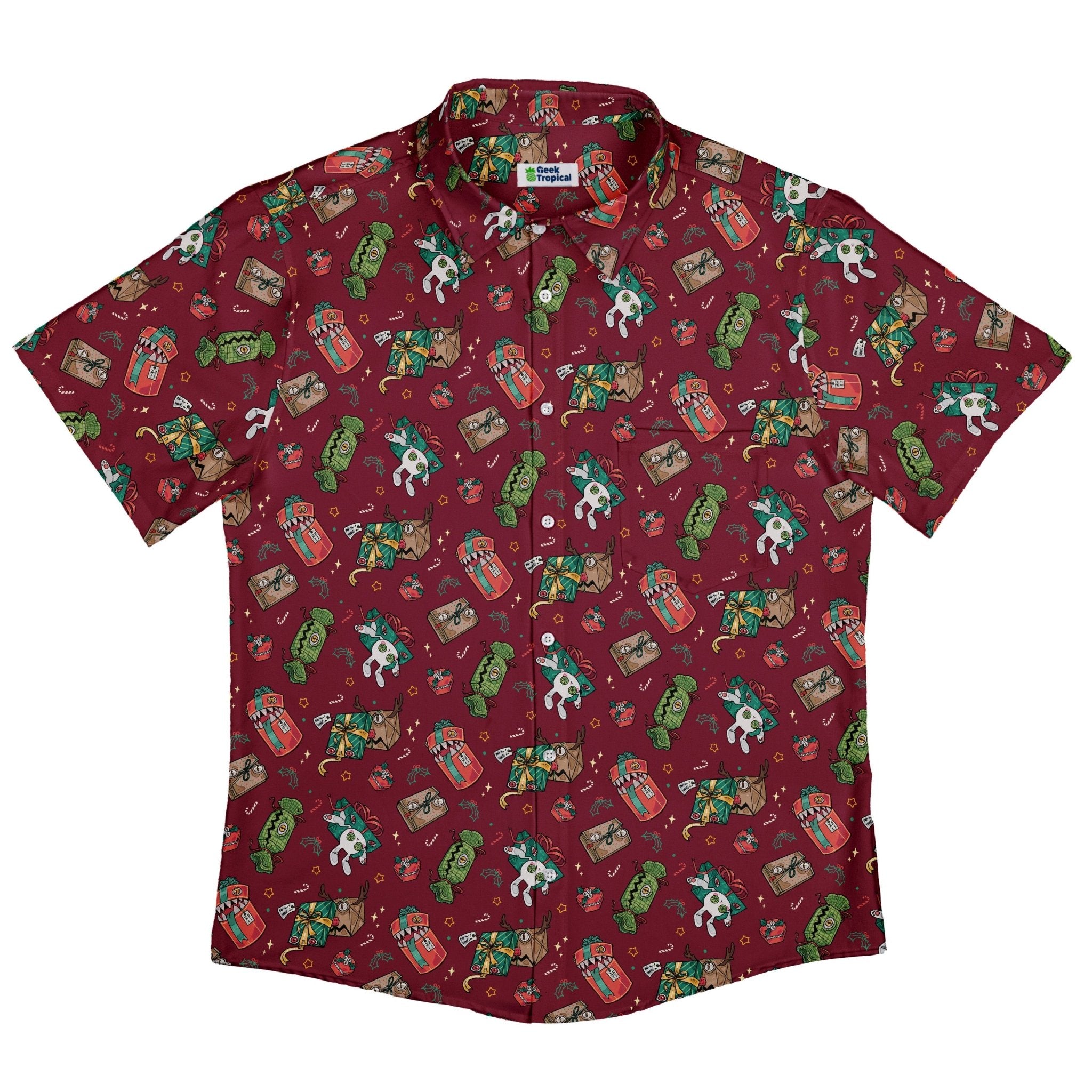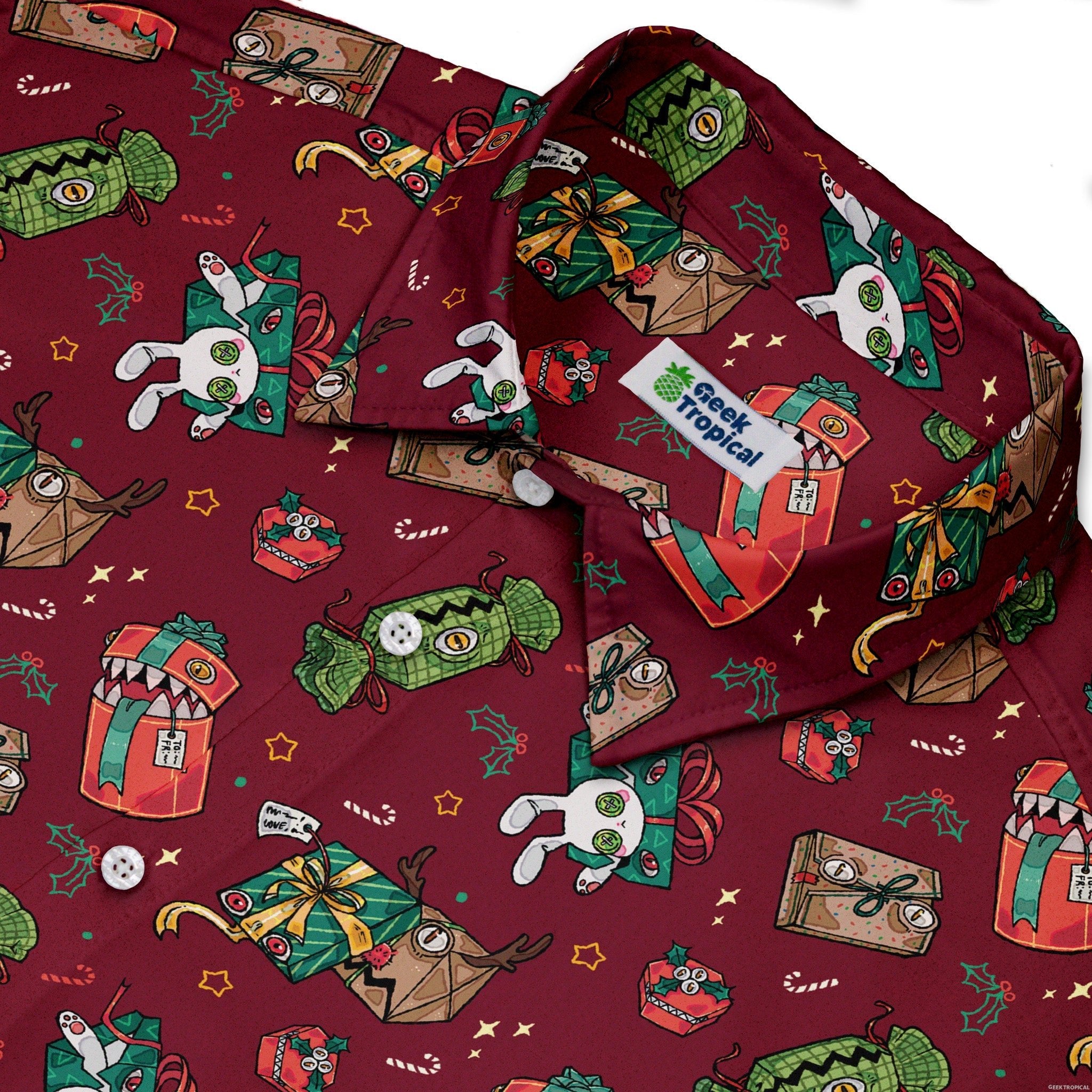 The Present Mimics Red Button Up Shirt sneaks festive charm into your wardrobe with a deep red backdrop dotted by gift-box mimics. Wrapped packages flash sharp smiles beneath tidy bows and ribbons—equal parts holiday cheer and hazard for the dungeon‑minded. Designed by Ardi Tong and printed with eco‑conscious inks, it’s a bold, conversation-starting layer for parties, game nights, and cozy mischief.