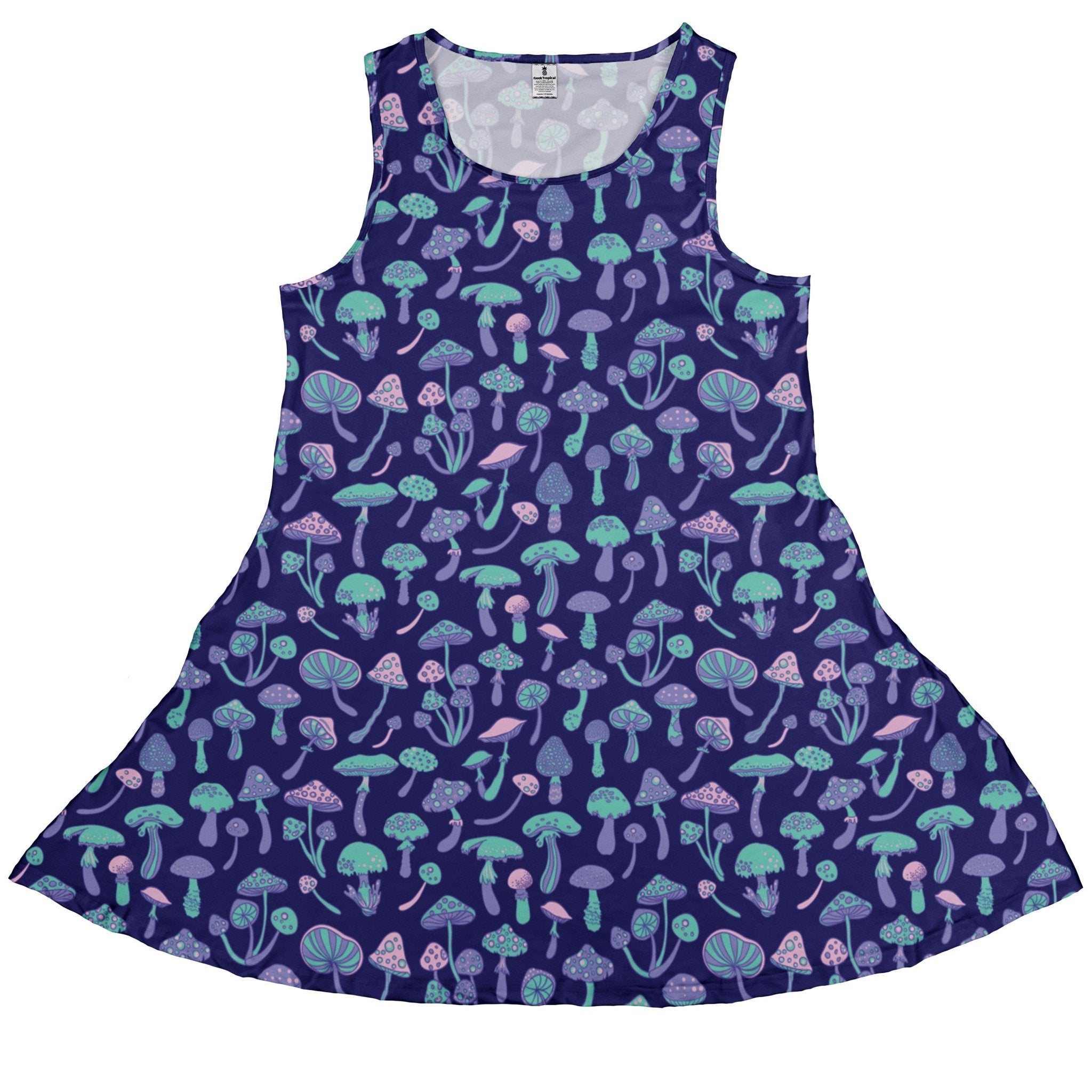 Turn heads with the Psychedelic Mushrooms Dress, a vibrant botany print that flips your nerd flag to neon. Electric mushroom caps and bold stems bloom across a deep, inky backdrop, packed with trippy detail. The fabric moves and breathes with you for opaque, comfy coverage and a smooth drape. Bonus: real pockets that swallow a phone—or even a game controller. Easygoing, polished, and proudly artist-backed.