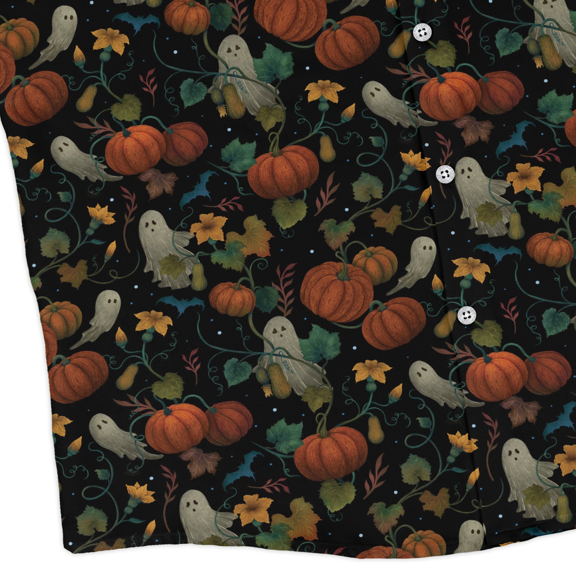 Pumpkin Ghosts Long Sleeve Button Up Shirt brings spooky-season charm to your everyday rotation. A maximalist all-over print of plump pumpkins and cheerful ghosts drifts through leafy botanical swirls, with crisp linework and high-contrast shading for pop from collar to cuff. Designed by Episodic and printed with eco-conscious inks, it’s the perfect smart-casual haunt for office days, costume-light parties, or cozy nights plotting your next Dnd one-shot.