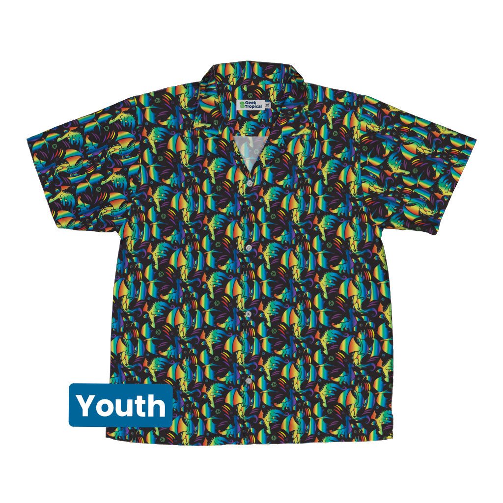 Rainbow Dragons Dnd Dice Black Youth Hawaiian Shirt serves bold fantasy energy for young adventurers. On a rich black canvas, prismatic dragons loop around bright Dnd dice, building a pride-forward pattern that pops from every angle. Soft, breezy comfort keeps the party going, while artist-backed design by Heather Davenport brings legit geek cred. Printed with eco-conscious inks to support the art you love.