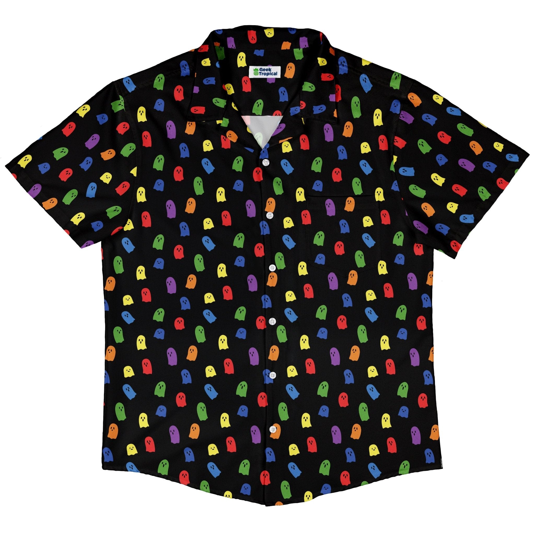 Rainbow Kawaii Ghosts Button Up Shirt brings cheerful, nerdy vibes to every outing. An all-over parade of rainbow-hued kawaii ghosts drifts in a seamless repeat across the shirt, aligning cleanly over the front for a crisp, maximalist effect. Unisex and easy to style, this artist-backed print by Tobe Fonseca radiates pride-ready color, geeky charm, and eco-conscious attitude for festivals, game nights, and everyday mischief.