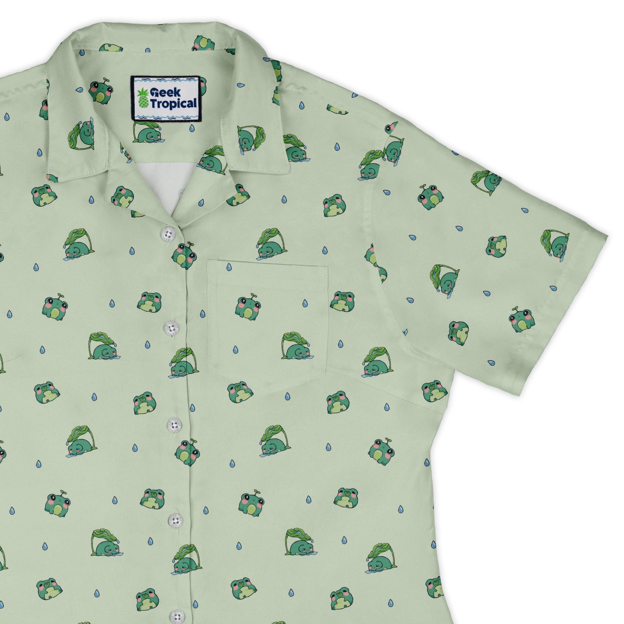 The Raining Frogs Pastel Green Curvy Button Up Shirt brings rainy-day charm to a soft pastel green canvas, with raindrops and anime-cute frogs scattered in a clean, continuous layout. Designed by Ardi Tong, it flatters curves and looks effortlessly polished worn untucked. The pocket aligns with the print and it’s finished with crisp branded buttons. Printed with eco-conscious inks for style that’s playful, smart, and artist-backed.