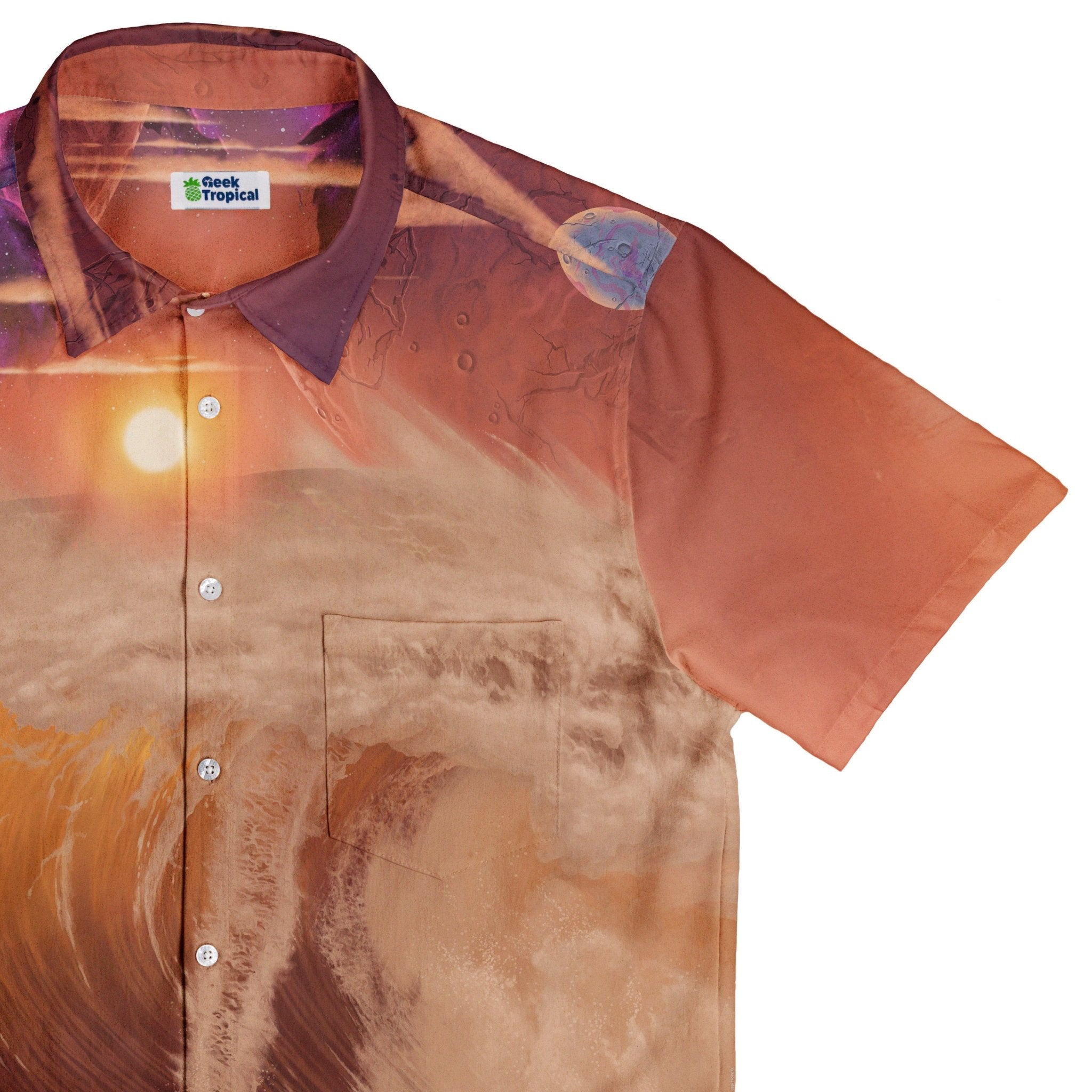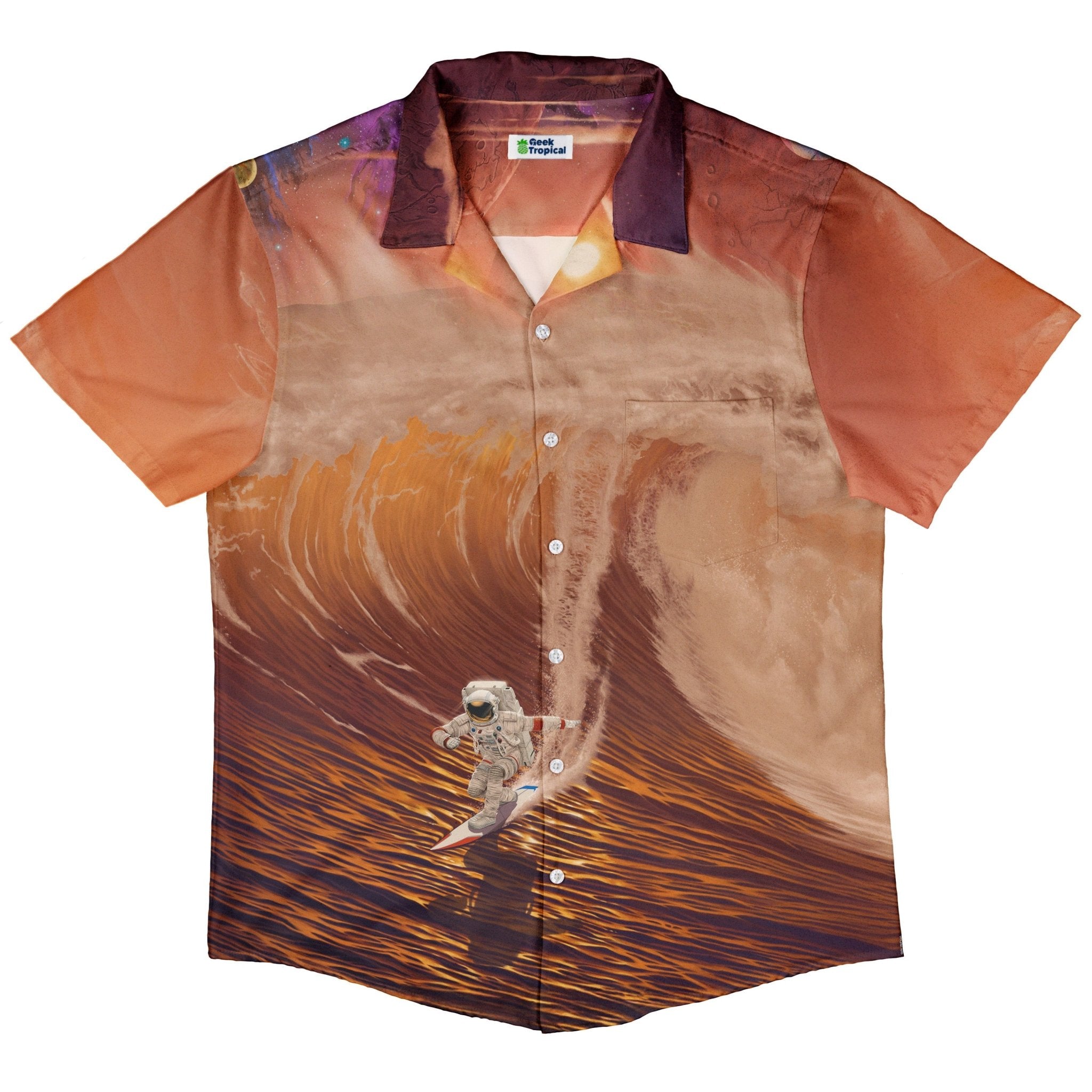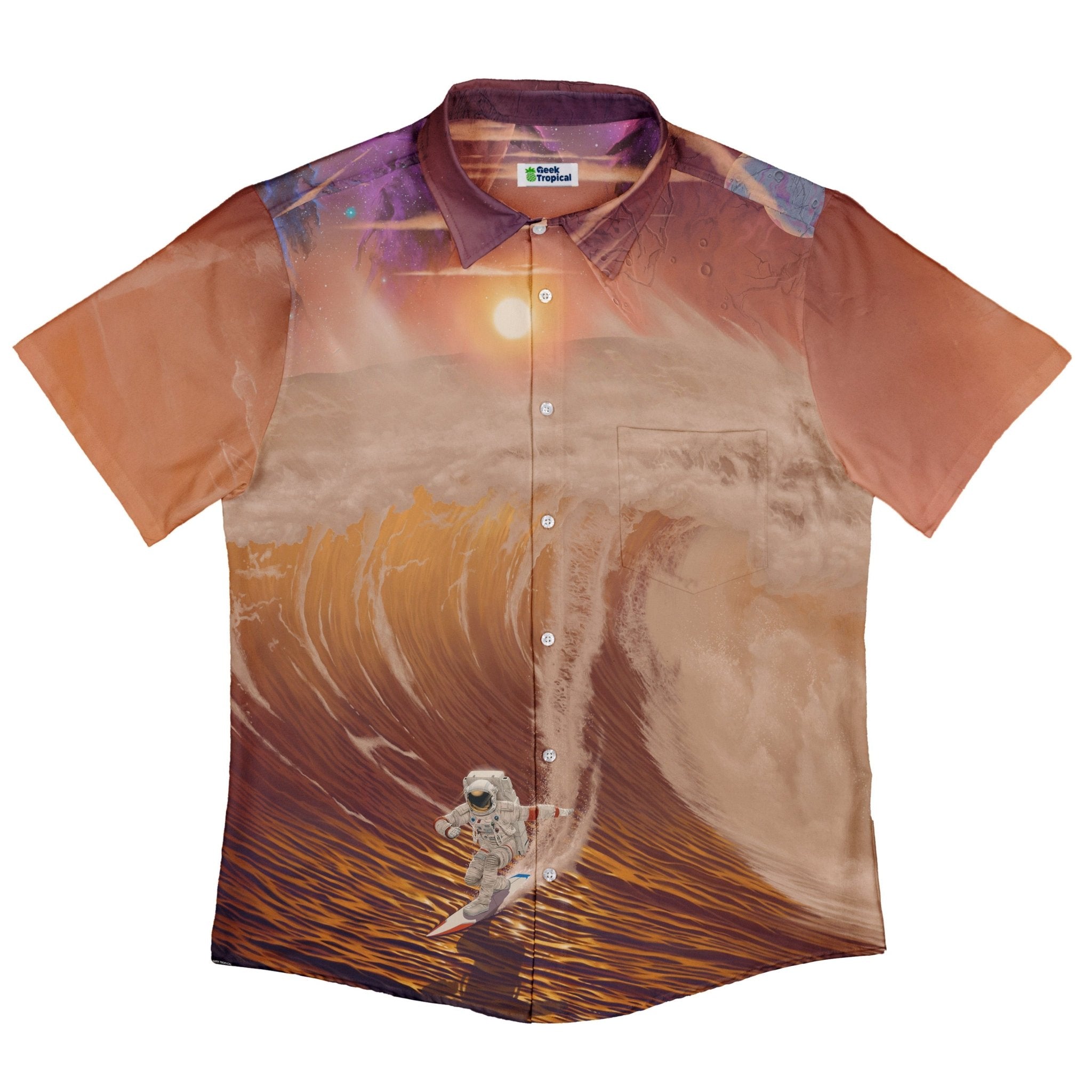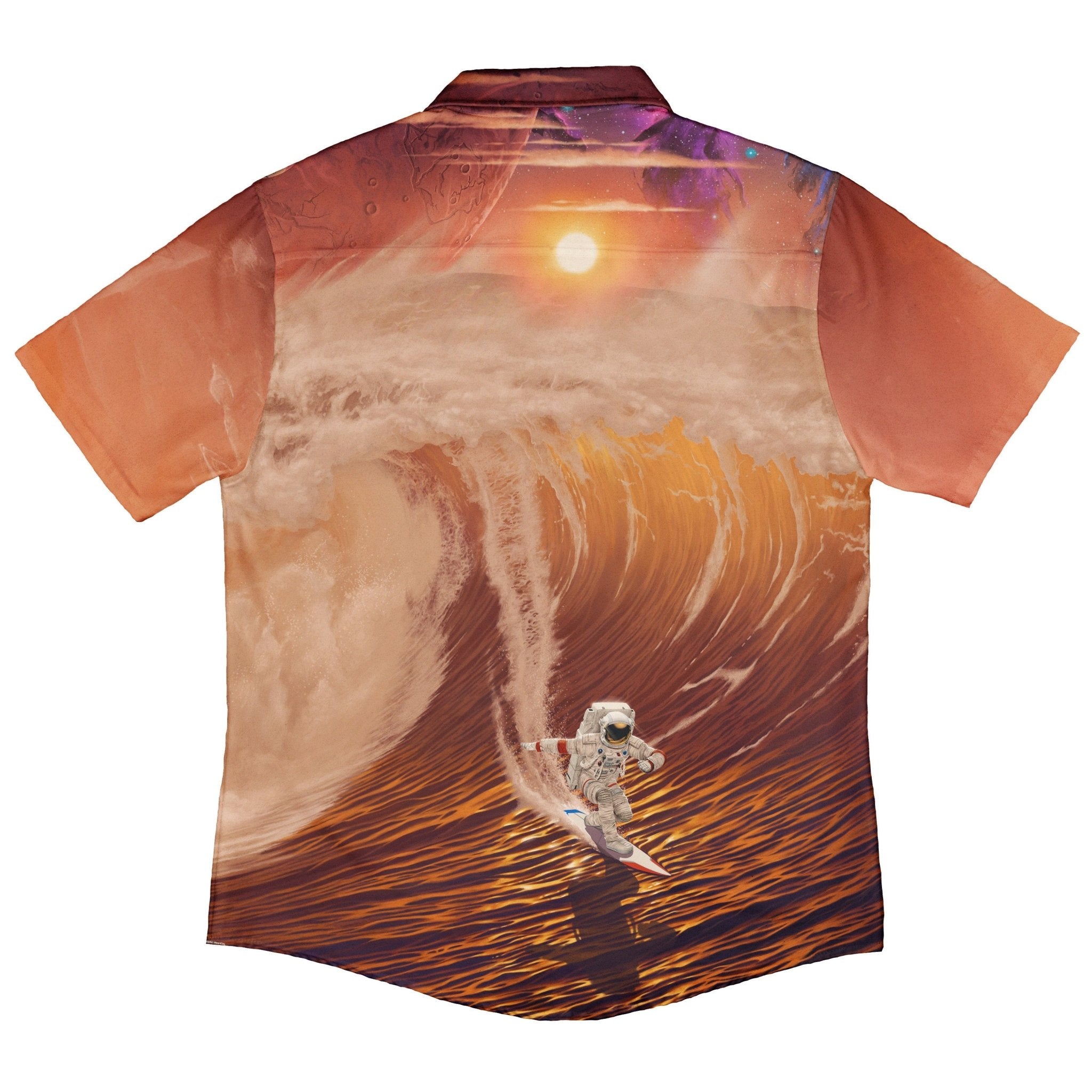 Riding The Milky Wave Button Up Shirt turns the cosmos into a surf zone for your wardrobe. Designed by Vincent Hie, this allover print rides a creamy, moonlit curl through deep-space blues—astronauts carving the wave while stardust sprays across a midnight sky. Soft, breezy, and unisex by nature, it’s a witty maximalist flex that dresses up or down and broadcasts your space-nerd pride with unapologetic style.