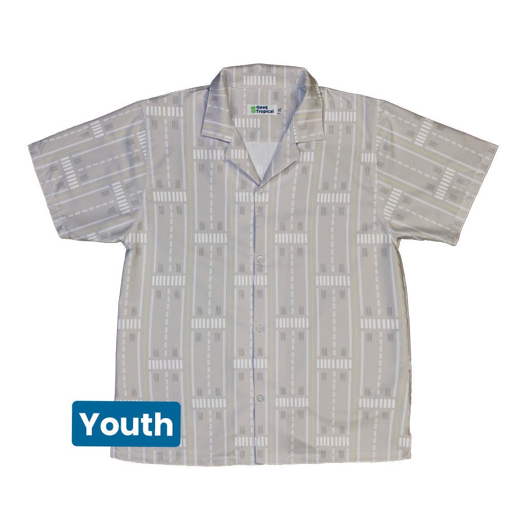 Runway Stripe Youth Hawaiian Shirt puts aviation on the map for mini frequent flyers, wrapping them in crisp runway-inspired stripes and geometric markers that flow cleanly across the front. Designed by Zirkus Design, it blends island chill with cockpit nerd flair. Soft, breathable comfort keeps them moving from school gate to hangar tour, and eco-minded inks keep the colors flying responsibly.