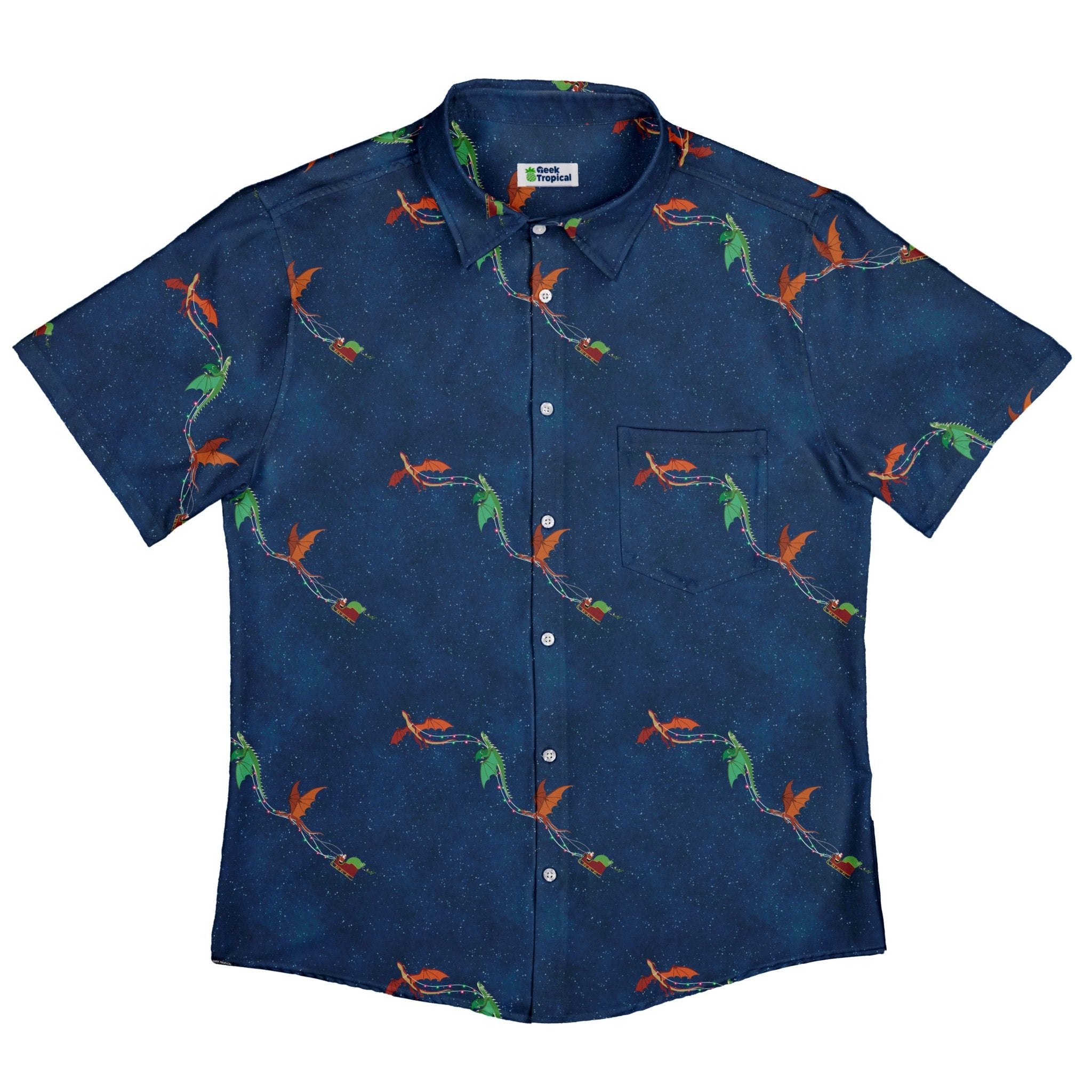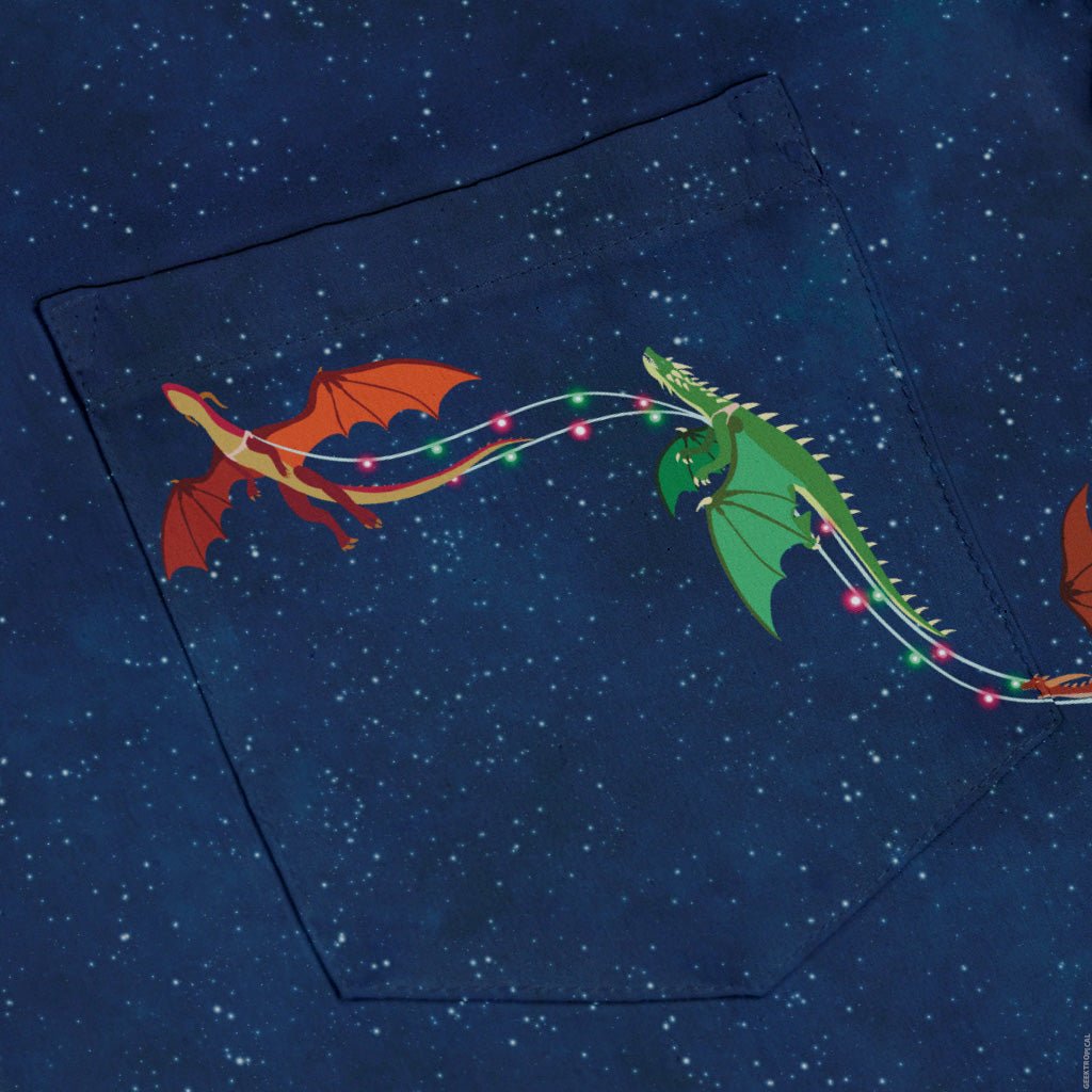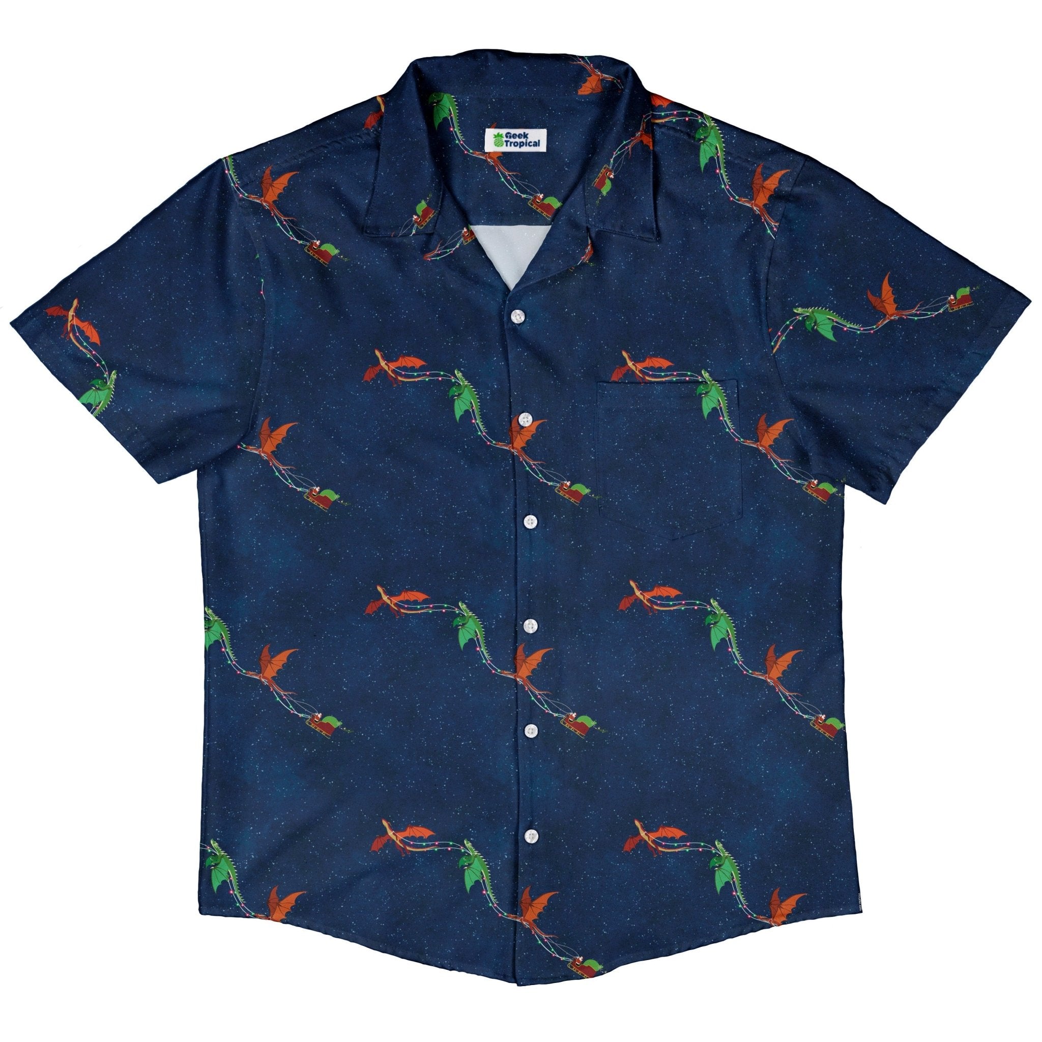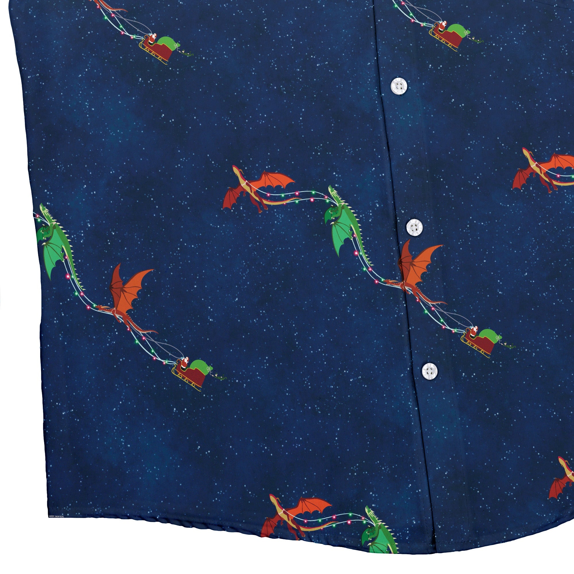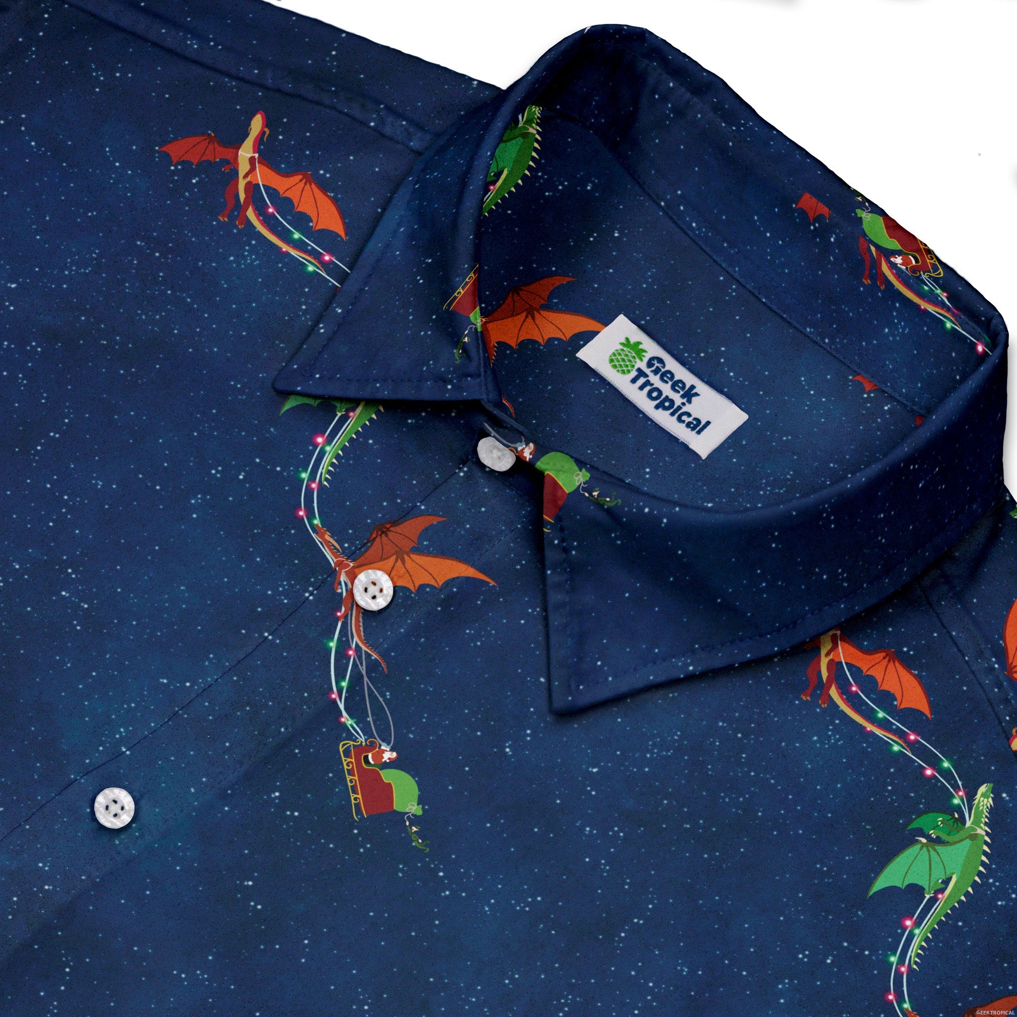 Meet the Santa Sleigh Dragons Button Up Shirt—a festive fantasy mashup where reindeer take the night off and dragons do the towing. The all‑over pattern shows Santa cruising in his sleigh while winged dragons swoop and curl, their tails and membranes forming rhythmic arcs that align cleanly across the front. Bold holiday art by Nathan brings cozy‑meets‑quest energy—artist‑backed, eco‑minded, and made for effortless, all‑day comfort.