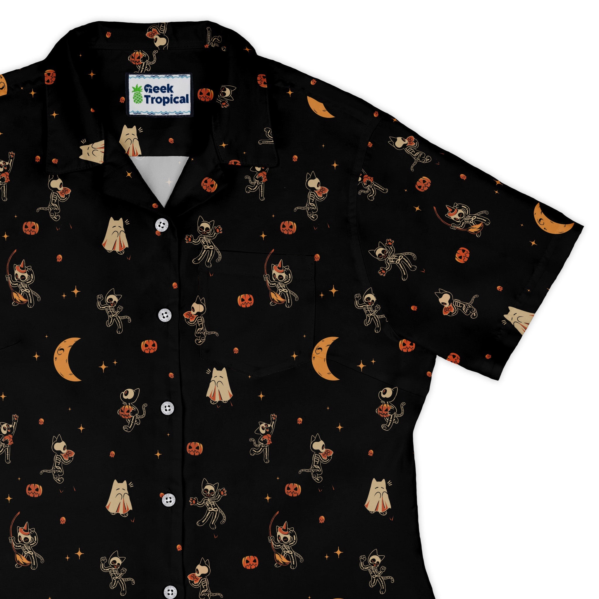 The Scaredy Cats Curvy Button Up Shirt brings sly spooky energy to your wardrobe. Designed by Tobe Fonseca, this all-over print lines up cleanly across the placket and pocket, showcasing jittery, wide-eyed cats with arched tails and nervous poise. The contoured fit flatters curves, adjustable sleeves shift from neat to relaxed, and branded buttons seal the look. Printed with eco-friendly inks to support artist-made style.