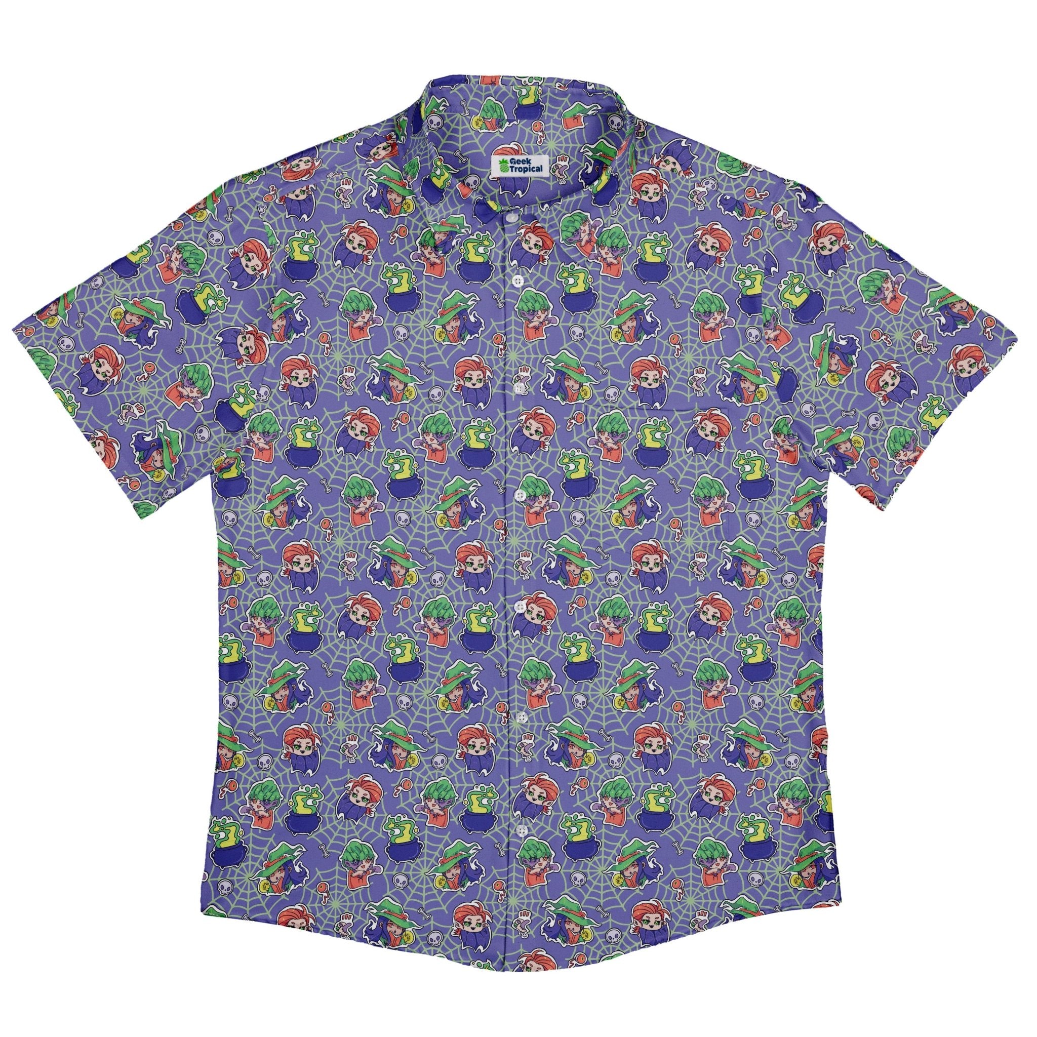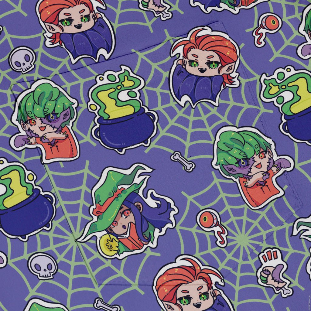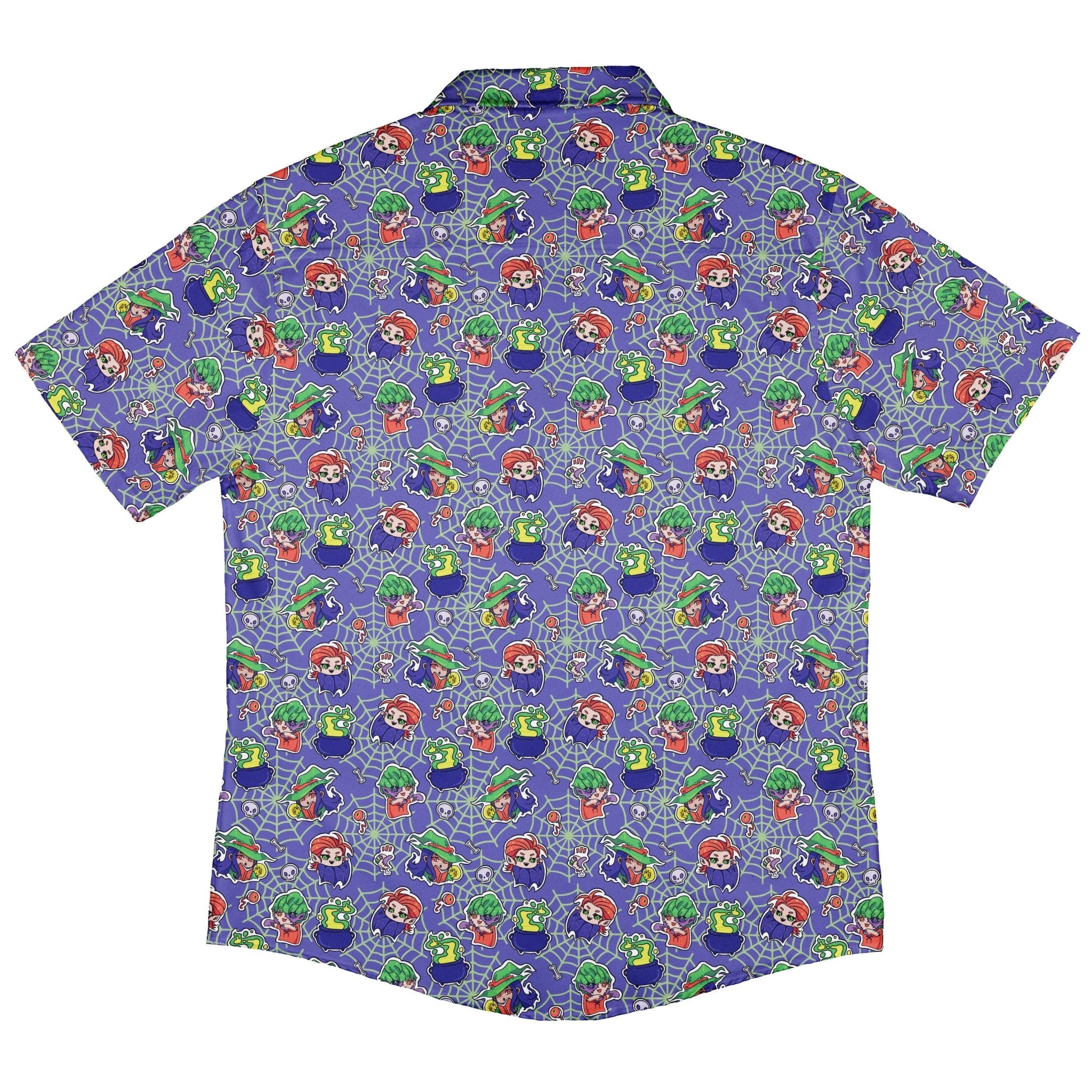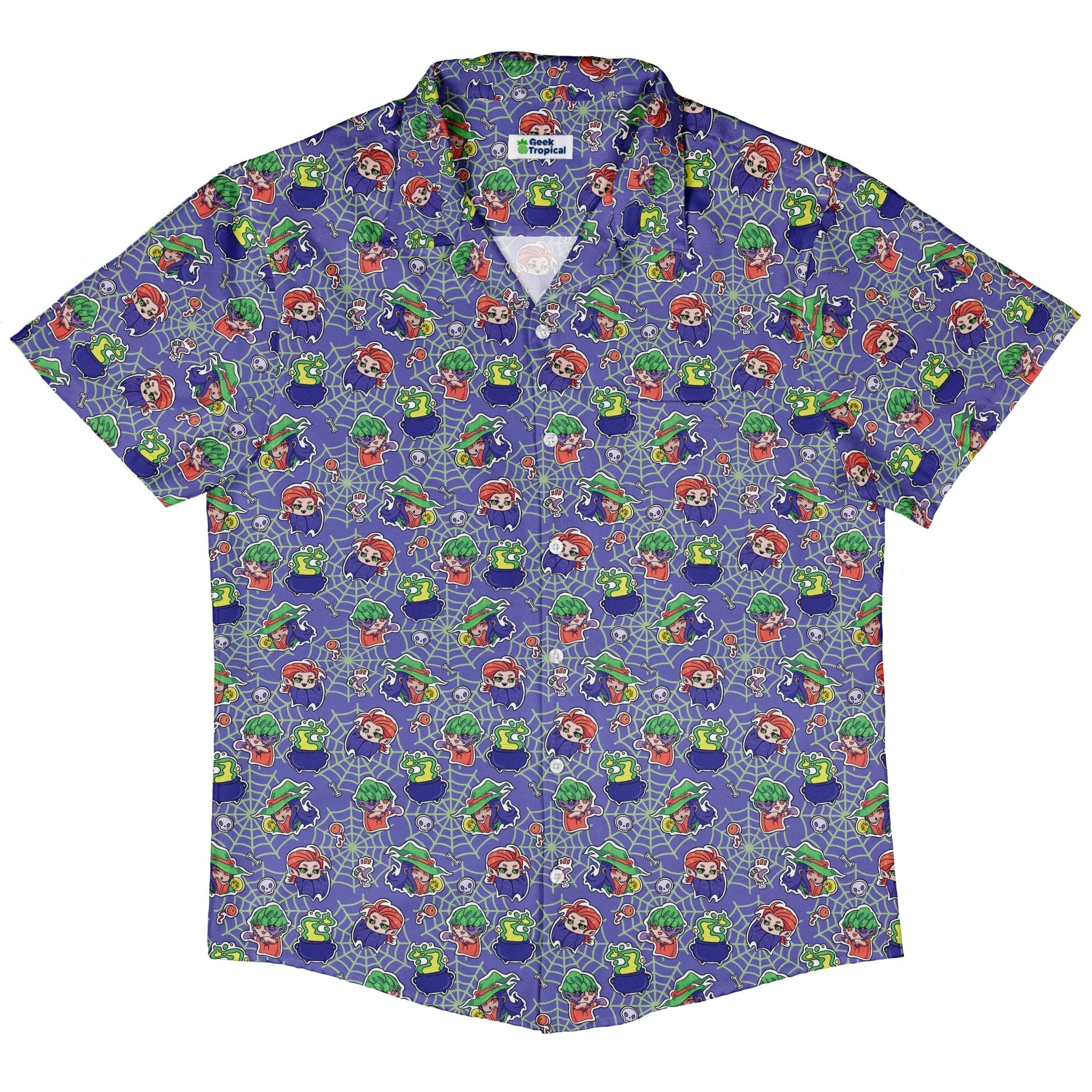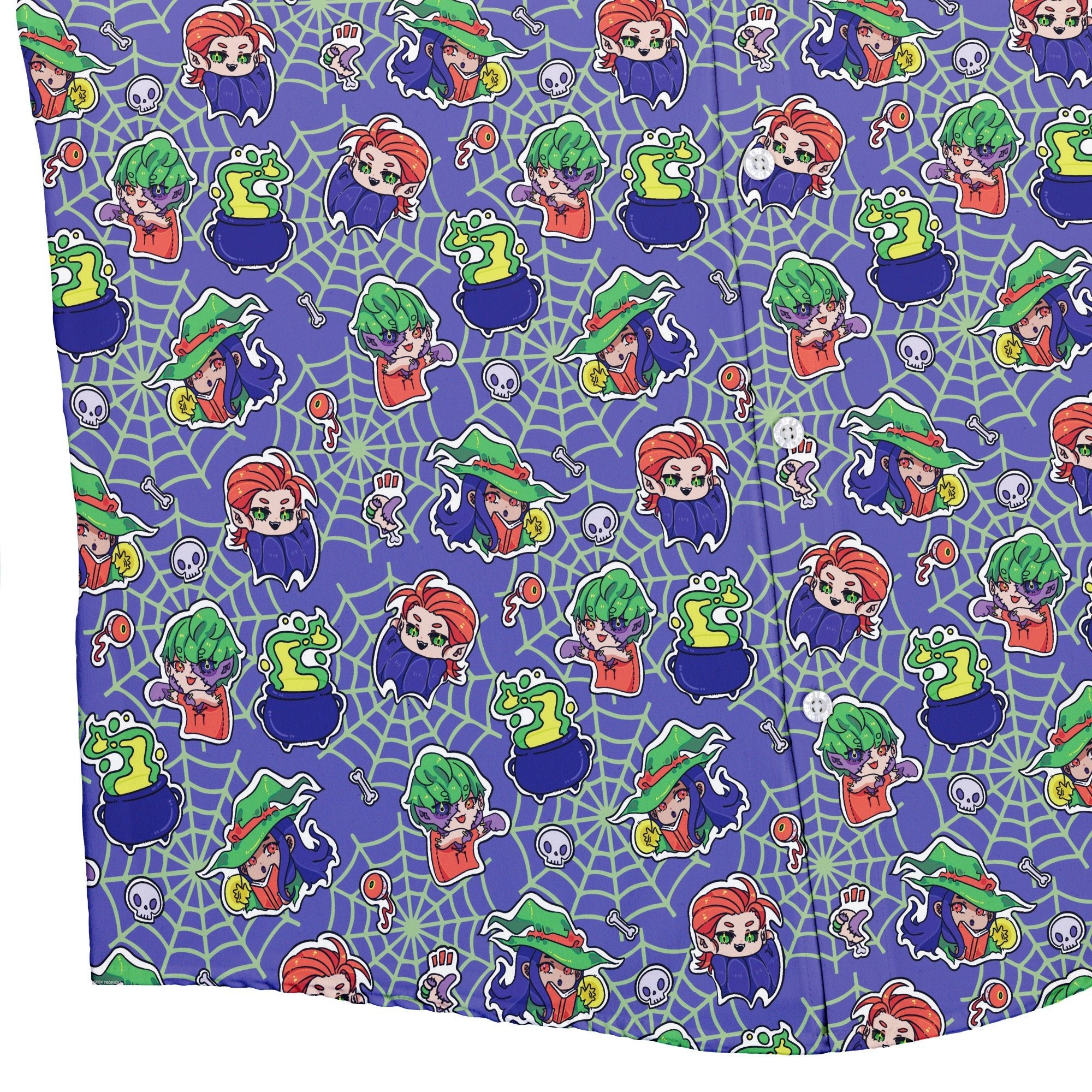 Meet the Scary Anime Chibi Stickers Purple Green Button Up Shirt, your spooky-cute power-up for Halloween and any con weekend. A sticker-sheet collage of mischievous chibi icons pops in electric green against deep purple, wrapping cleanly across the placket for a seamless look. Sharp collar, crisp buttons, and an easy drape keep it wearable, while the licensed design by Ardi Tong lets your fandom support the artist.