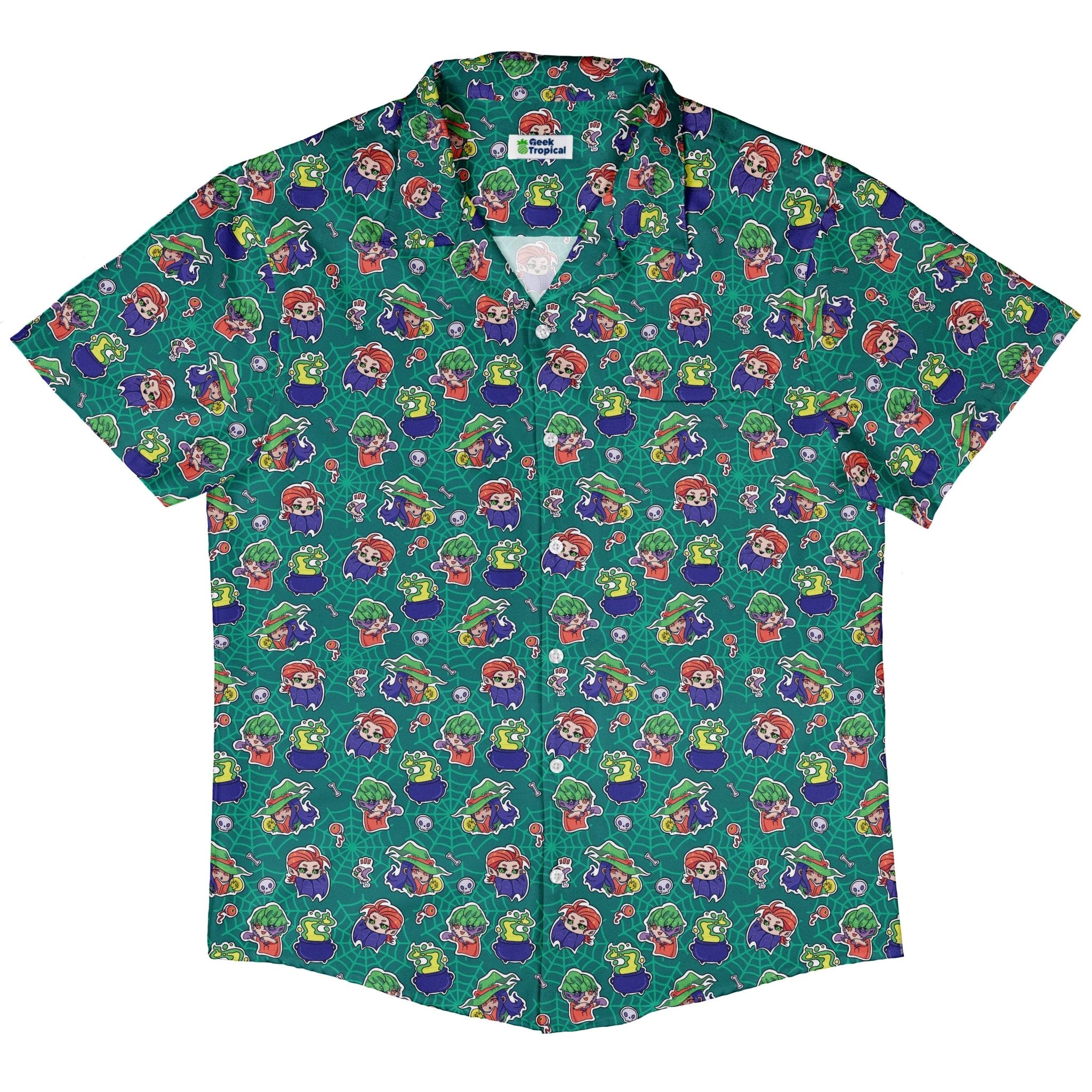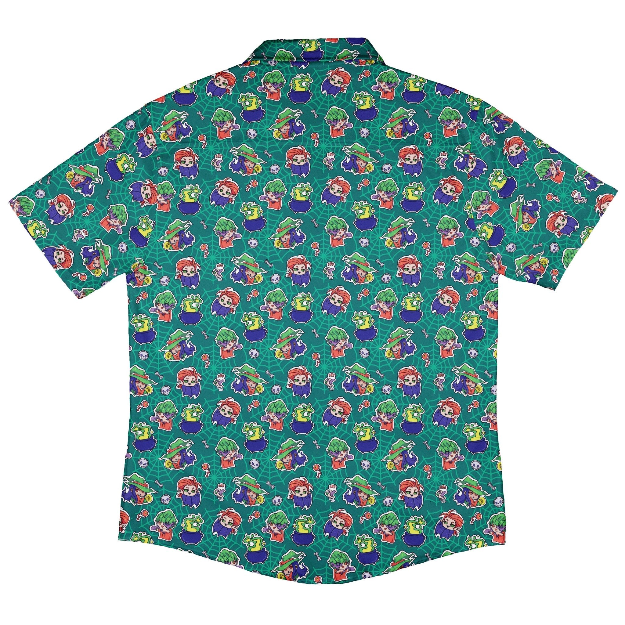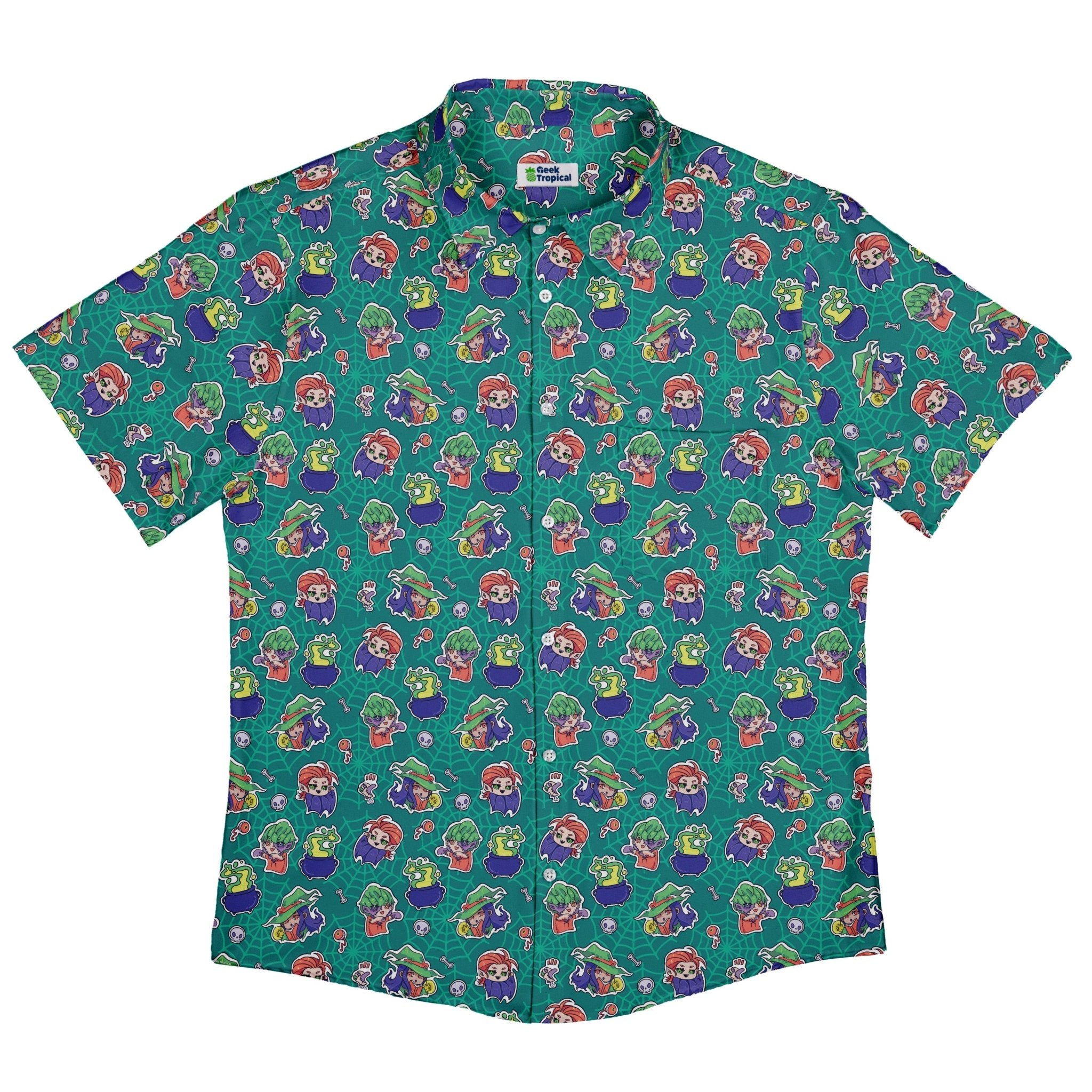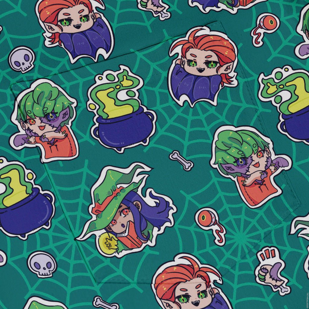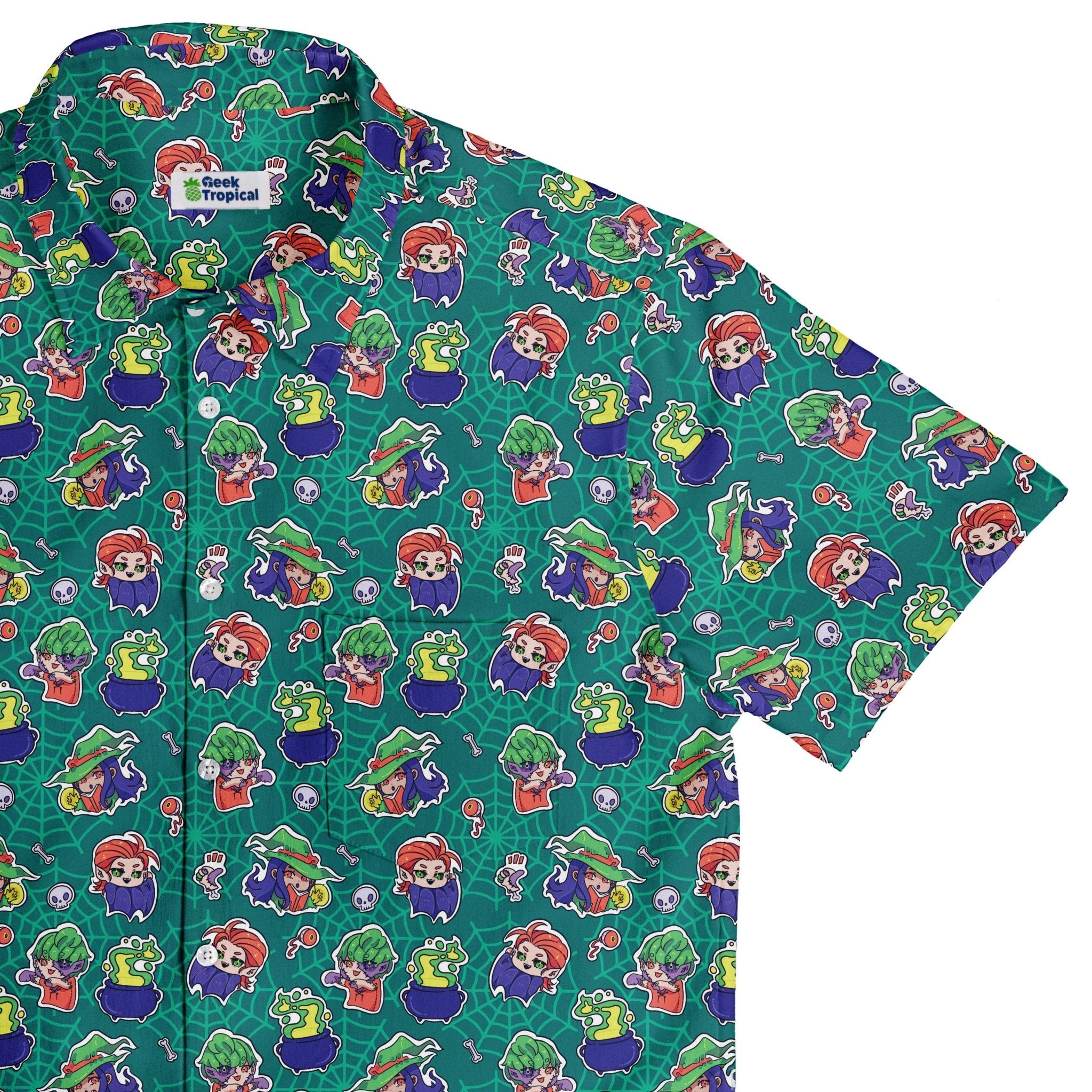 The Scary Anime Chibi Stickers Teal Button Up Shirt channels Halloween energy through kawaii mischief. On saturated teal, sticker-style chibi scares—big-eyed expressions, spooky-cute emblems, and bold outlines—pop with bright accents. Designed by Ardi Tong with planet-conscious printing, this soft, breezy button-up drapes easy in adult sizing, and the continuous allover print keeps your look sharp and geek-proud.
