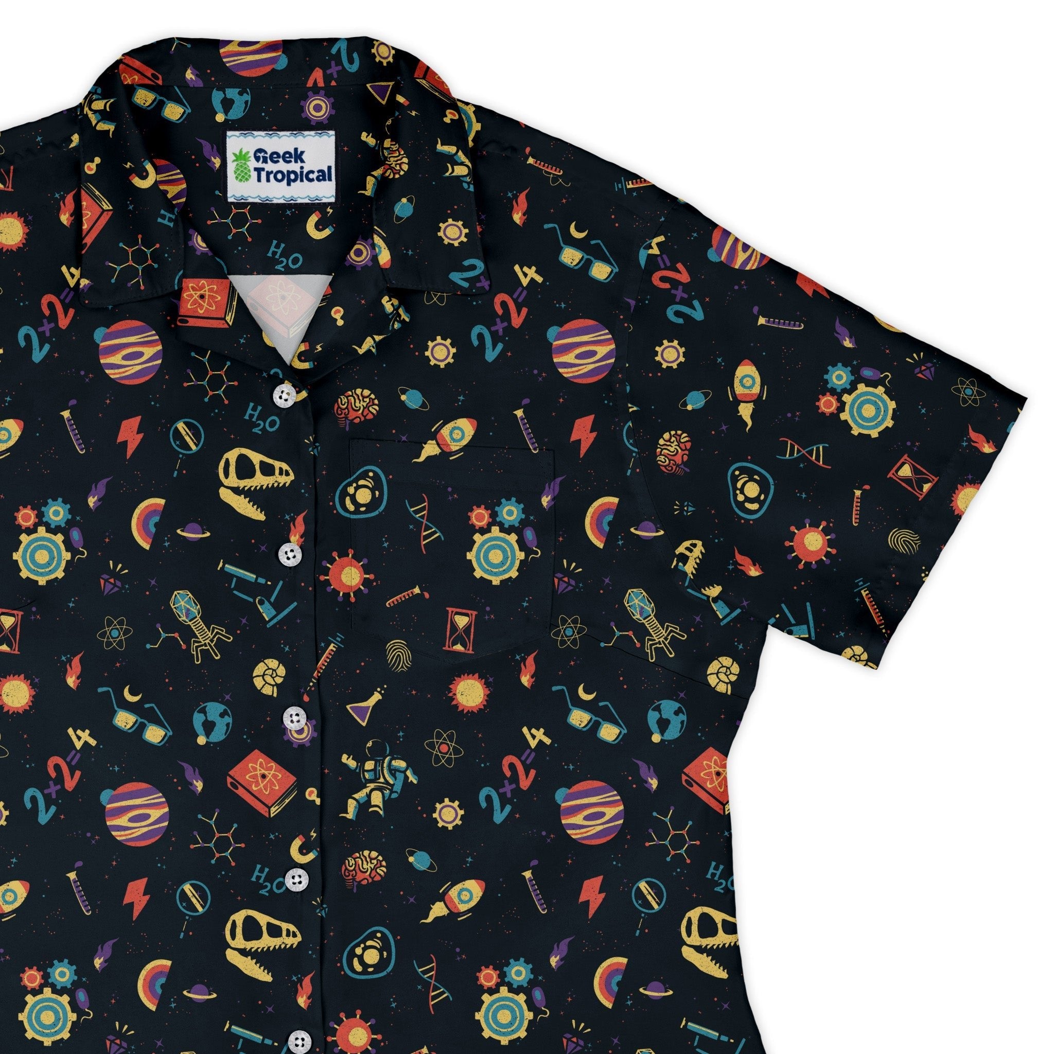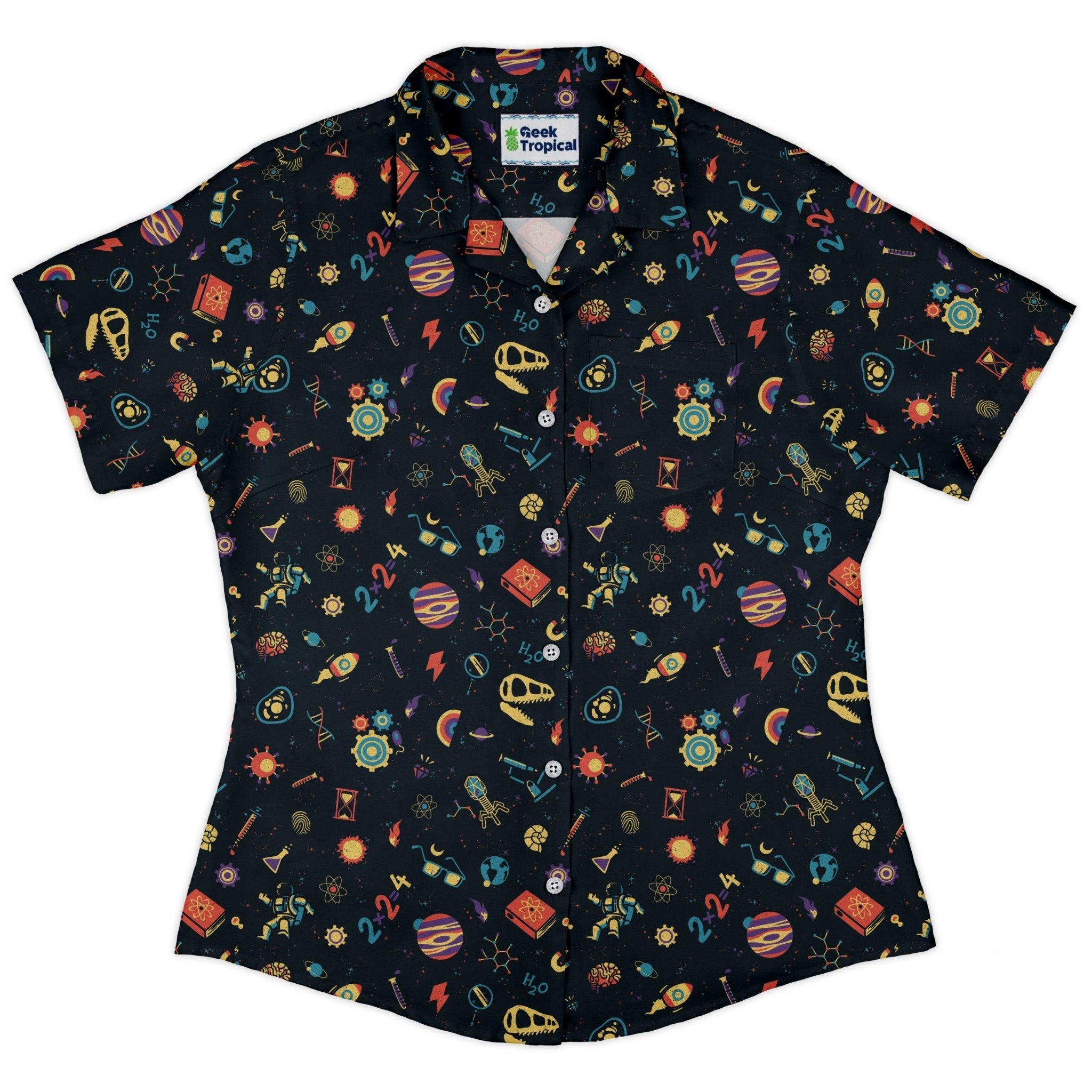 The Science Love Curvy Button Up Shirt pairs brainy charm with a curve-hugging silhouette. Designed by Tobe Fonseca, its all-over science motif channels smart romance, with a seamless print that even lines up across the pocket. Soft, breathable, and polished with crisp branded buttons, it moves from lab to latte with ease. An easy curved hem keeps it effortless untucked. Adjustable sleeves add versatility, and eco-conscious inks make your fandom feel good inside and out.