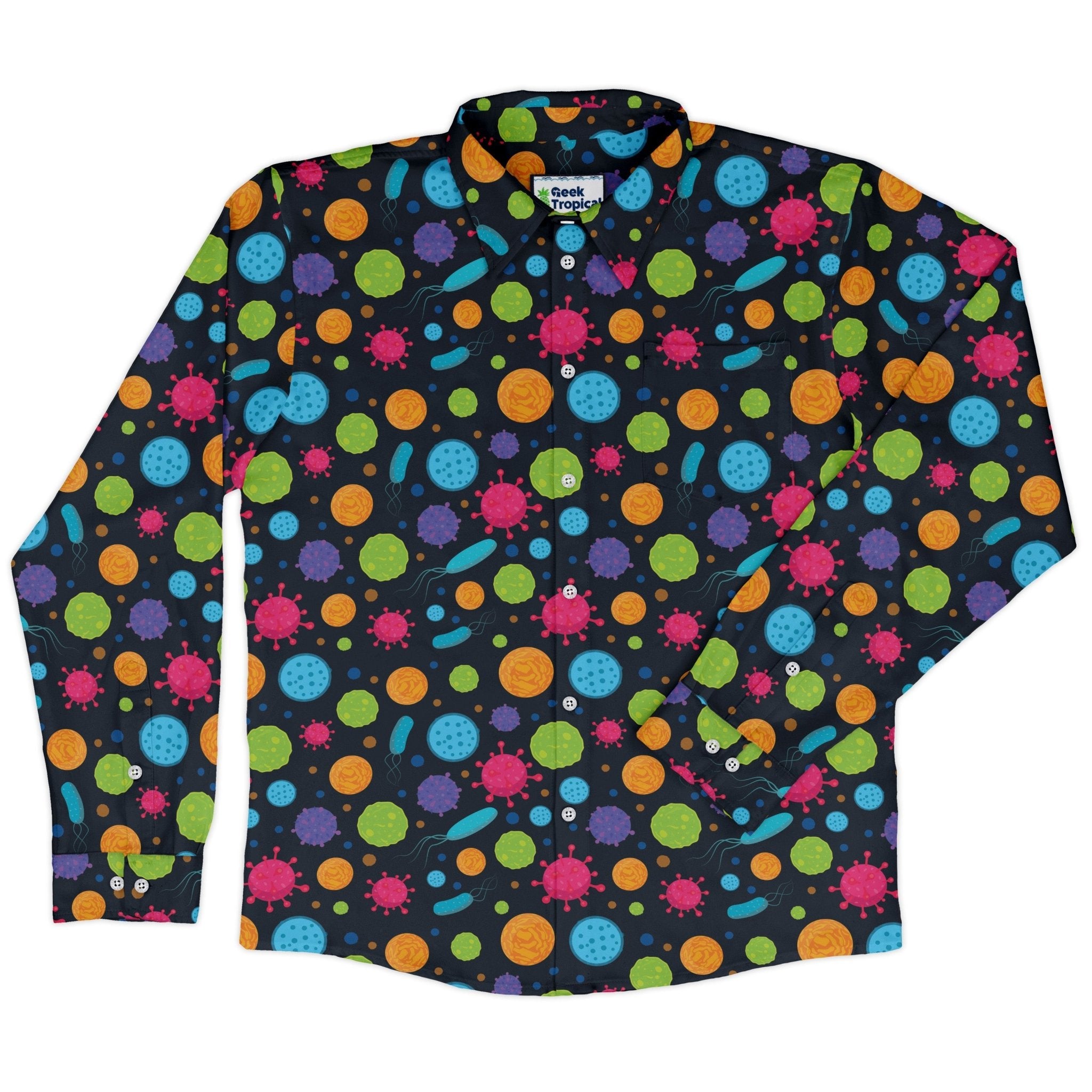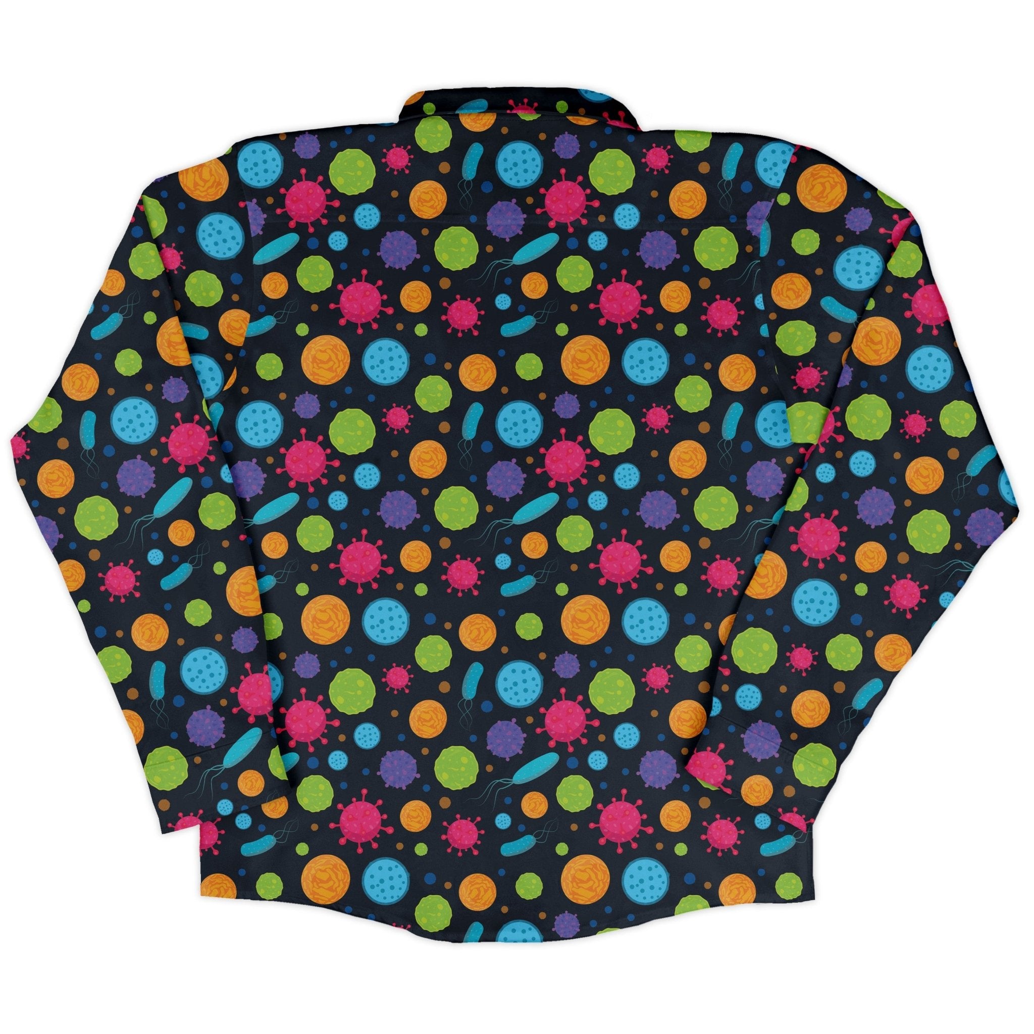 Geek out in the Science Microbiology Rainbow Navy Long Sleeve Button Up Shirt, a lab-chic layer for curious minds. On deep navy, a rainbow of microscopic life—vivid microbes and cell-like forms—scatters in crisp detail. The print flows cleanly across the chest pocket for a polished finish, while breathable comfort carries you from office to trivia. Artist-backed and printed with eco-conscious inks.