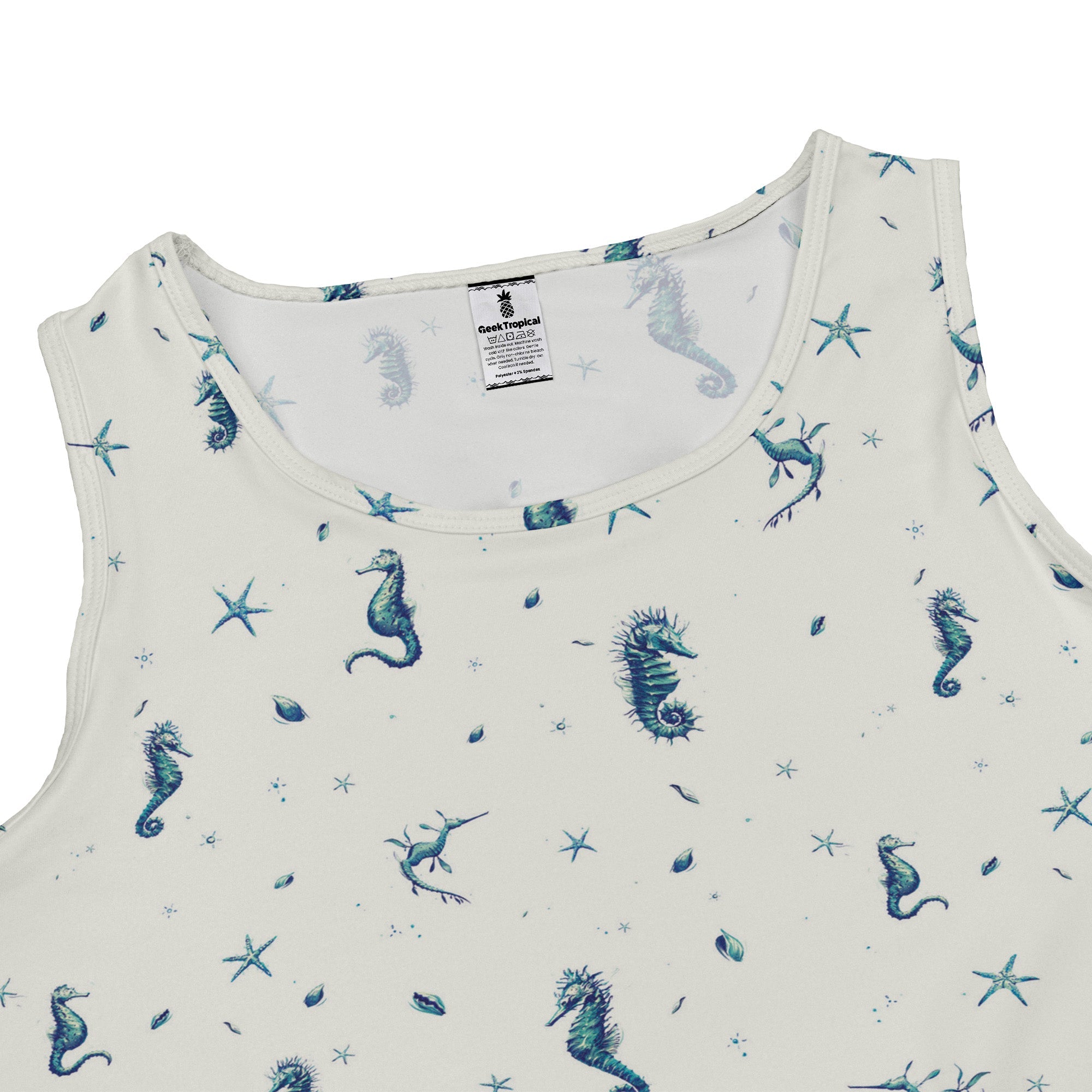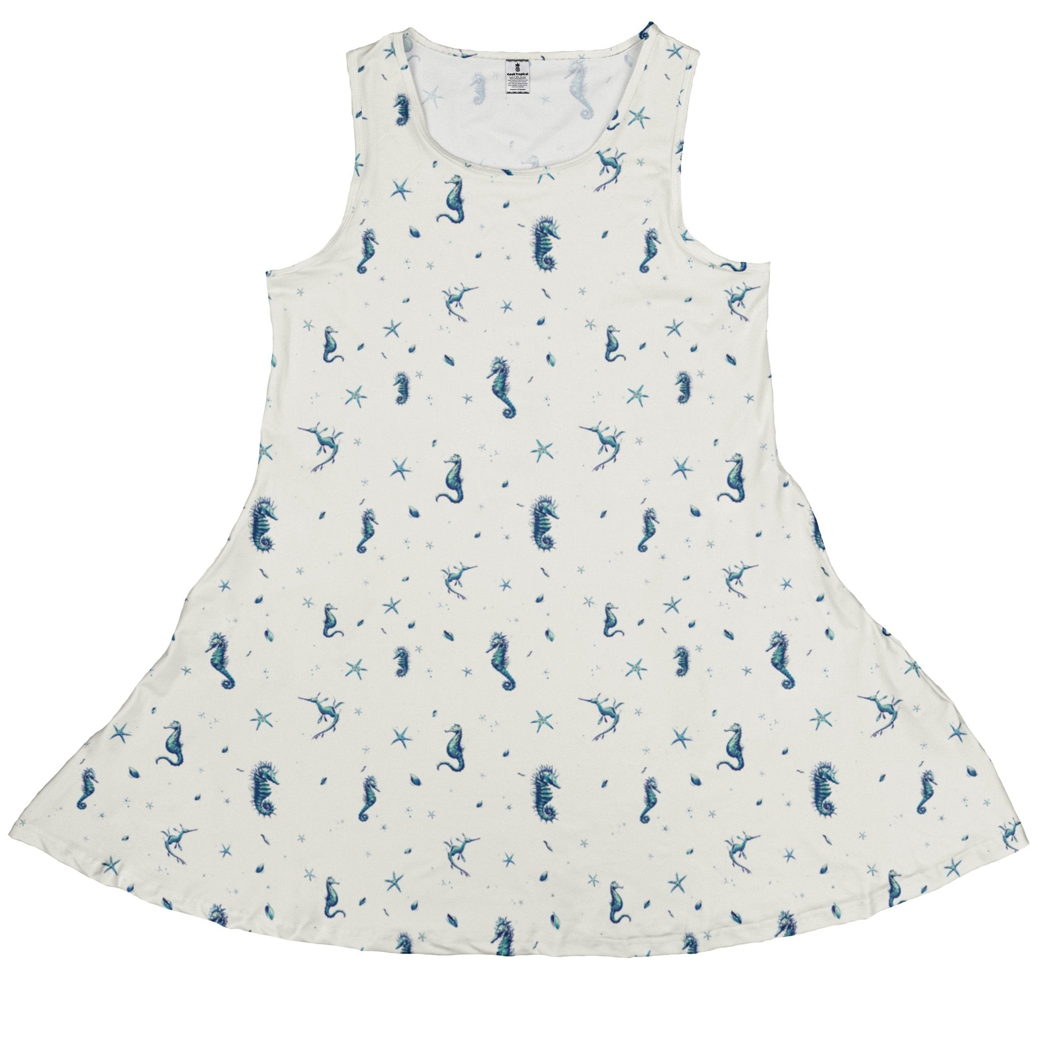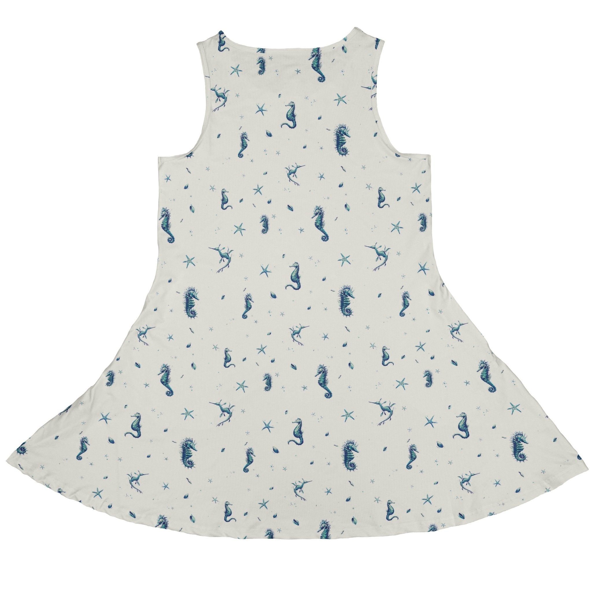 Step into the Seahorses Floating Dress, a breezy, brainy ode to marine life designed by Vlad Mel. An allover field of graceful seahorses drifts across the fabric, cleanly rendered with artful linework that pops from a distance and rewards a closer look. The silhouette keeps things relaxed yet polished, while the print flexes your marine-bio nerd cred—perfect for aquarium hangs, lab days, or everyday ocean energy.