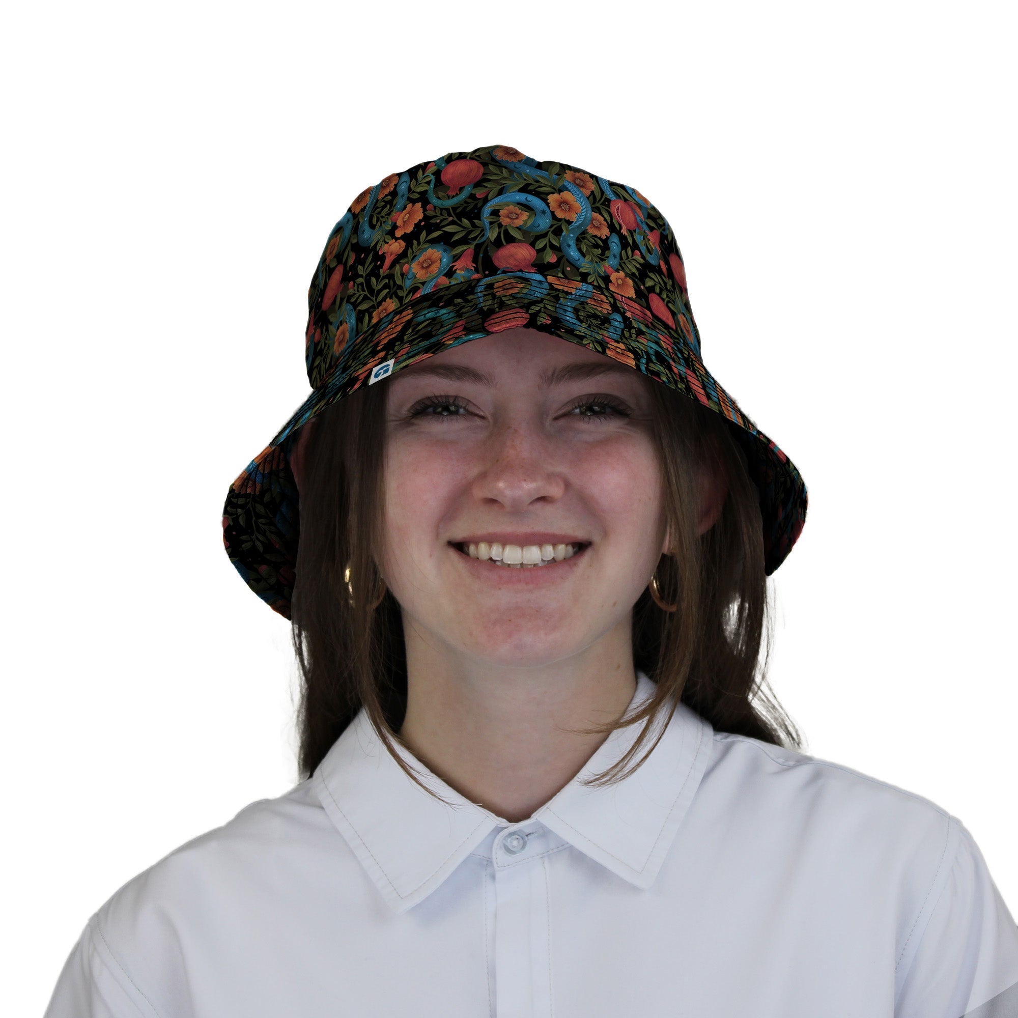 Meet the Serpentine Blossom Bucket Hat from Geek Tropical: coiling serpents entwine with delicate blossoms in an allover print that wraps the crown and brim, marrying herpetology and botany with crisp linework. Equal parts streetwise and scholarly, it slides from trail to tabletop with ease. Designed by Episodic, this artist-backed piece brings thoughtful edge to sunny days and con halls.
