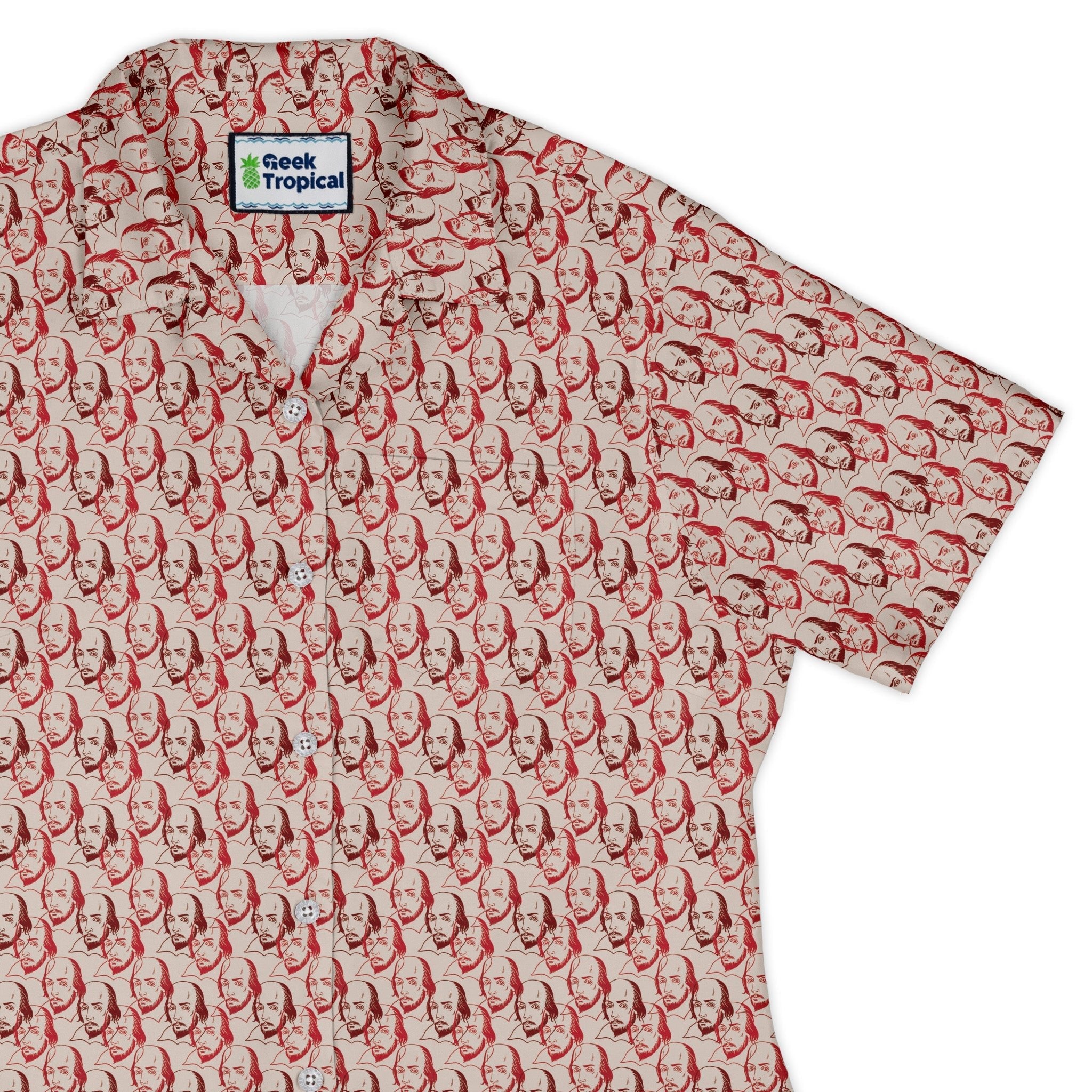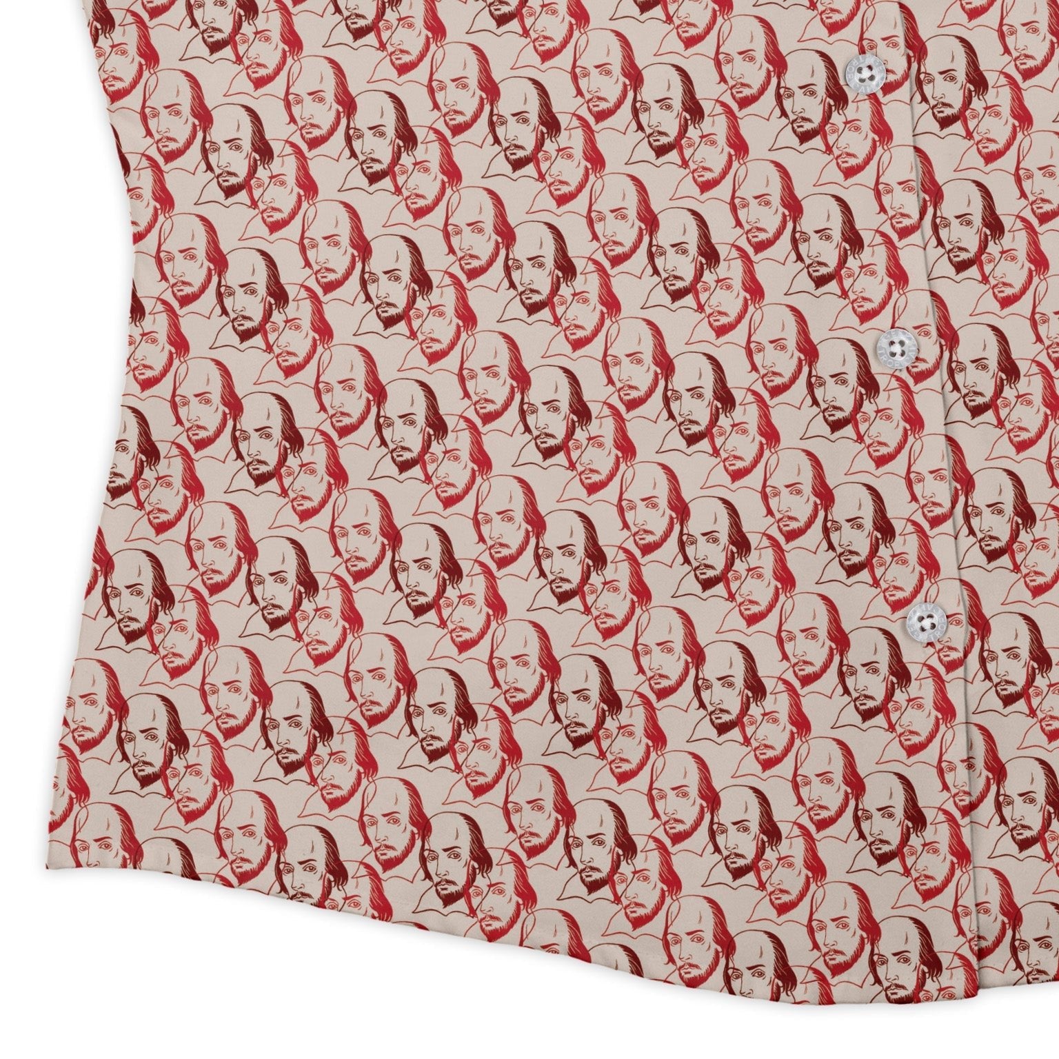 Meet the Shakespeare Red Macbeth Curvy Button Up Shirt, a literary flex for readers who like their tragedy bold. The deep red ground carries a simple, repeating Macbeth print, carefully aligned across the front and pocket for a seamless look. Tailored for curves with a rounded hem that flatters untucked, plus sleeves that shift from fitted to easy. Soft, breathable comfort for all-day wear, printed with eco-conscious inks and artist-backed from sketch to stitch.