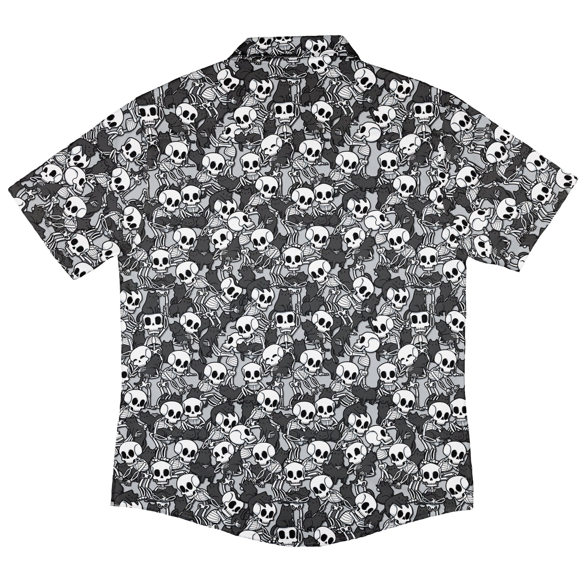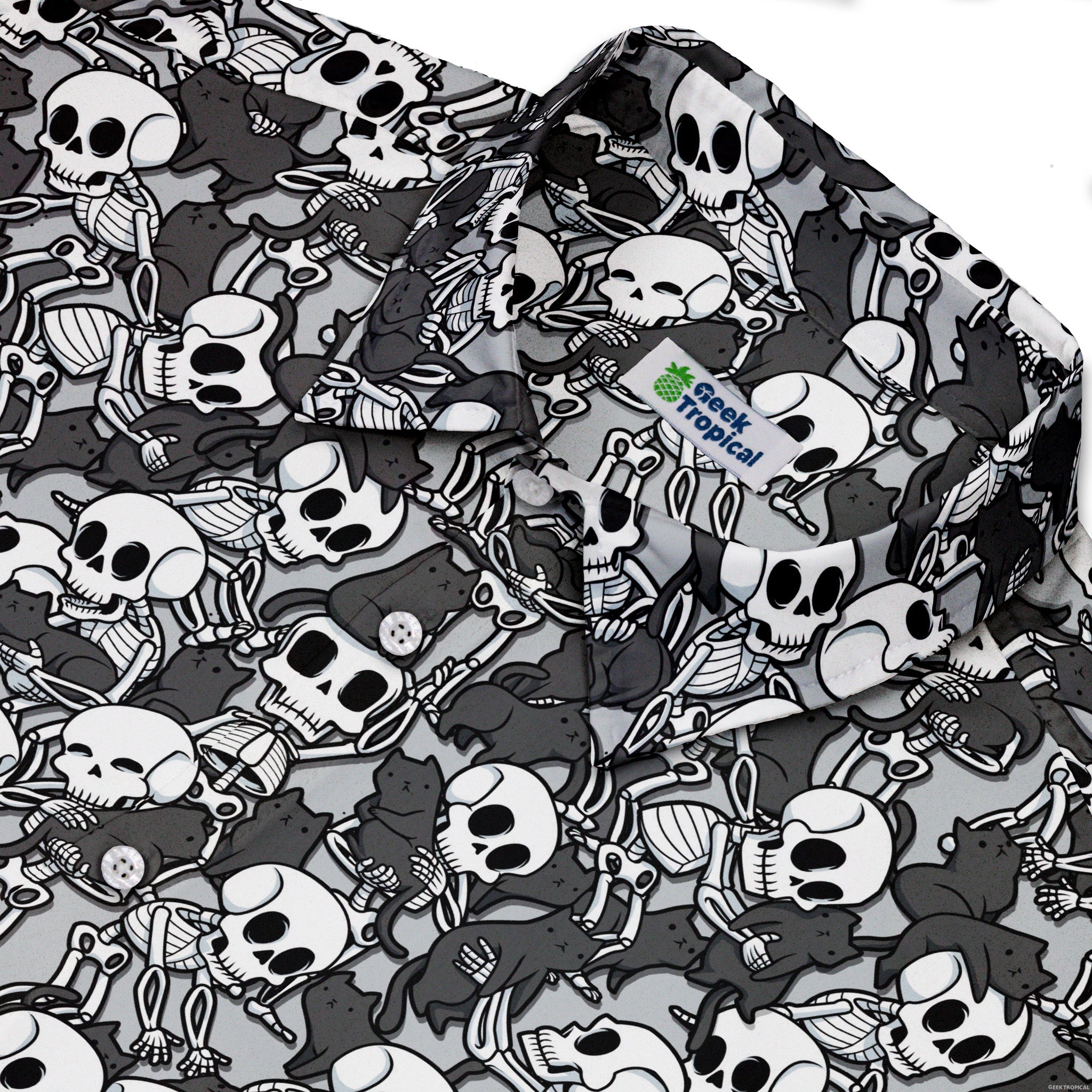 Skeleton Cat Love Button Up Shirt channels spooky-cute energy with an all-over pattern of skeletal kitties in affectionate poses. Designed by Tobe Fonseca, the high-contrast artwork flows cleanly across the front and optional pocket for a polished look. Unisex and easy to wear, it stays comfy from day to night. Artist-backed and printed with eco-conscious inks, this shirt purrfectly blends goth charm with geek flair.