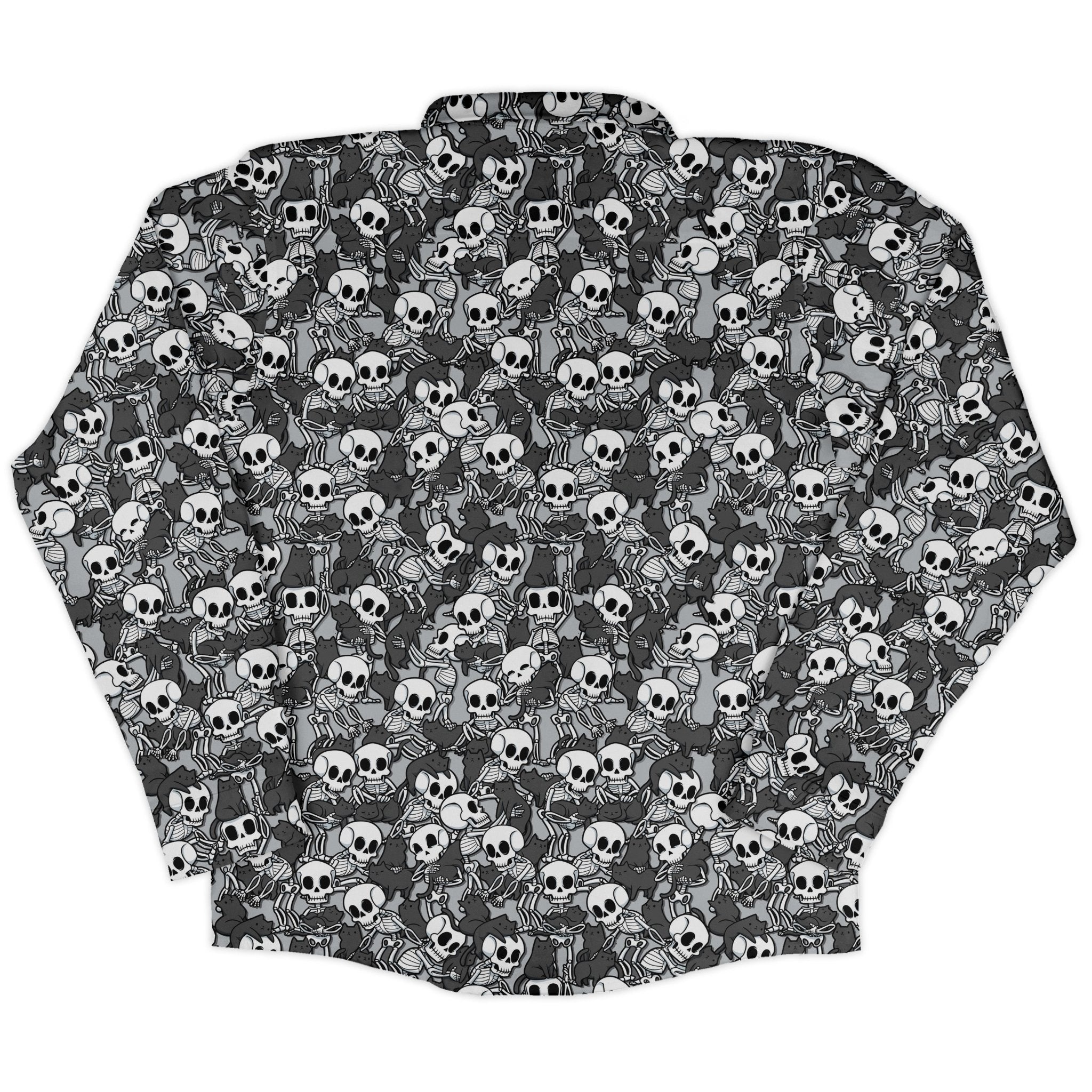 Meet the Skeleton Cat Love Long Sleeve Button Up Shirt, your spooky-cute upgrade for date night, con floors, and everyday mischief. An all-over parade of skeletal cats brings playful goth energy, with crisp linework and seam-matched patterning that flows across the placket and pocket. Designed by Tobe Fonseca and printed with eco-conscious inks, this unisex staple keeps you comfy while supporting the artist.