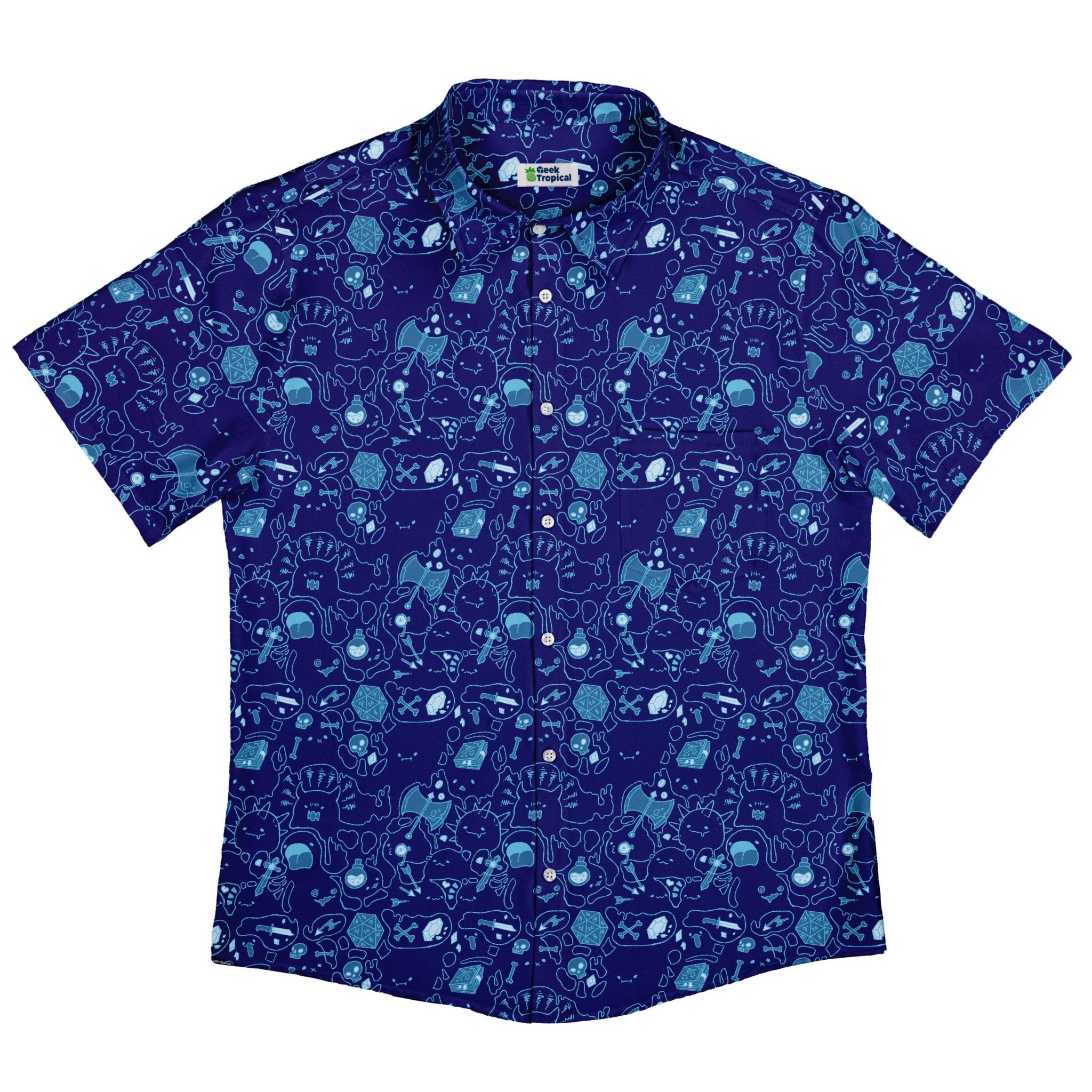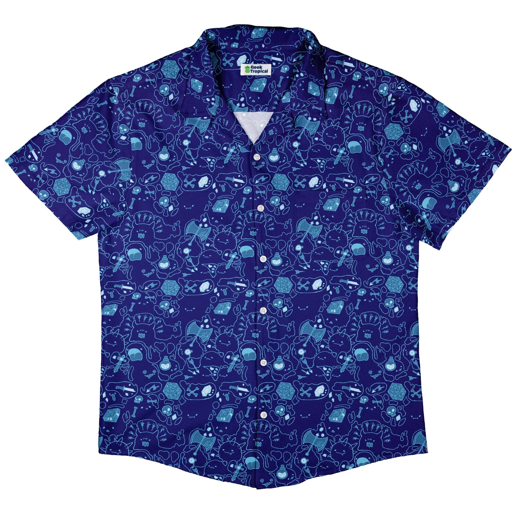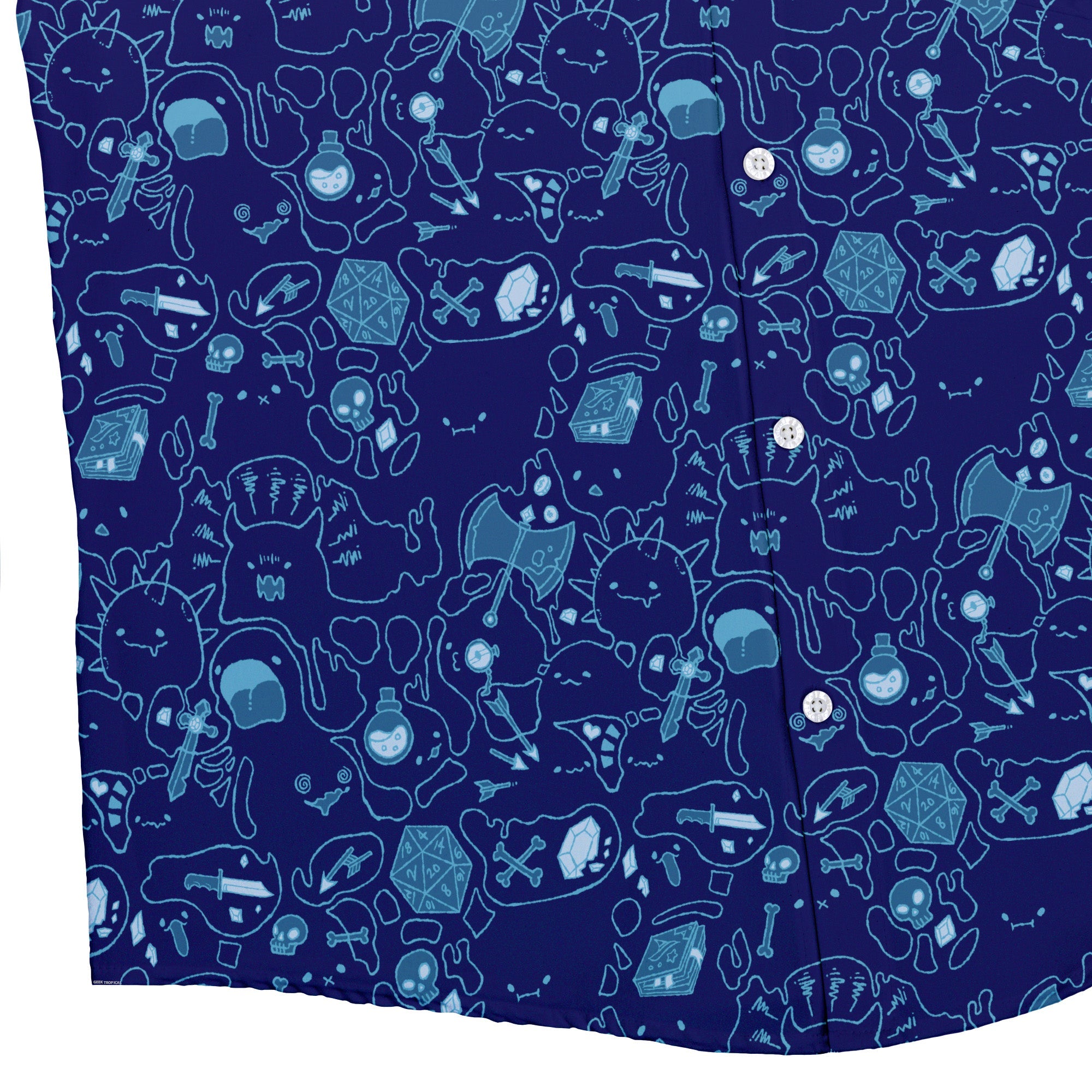 The Slime Cube Bioluminescence Button Up Shirt channels dungeon-crawl vibes into crisp, everyday wear. Translucent slime cubes glow in neon teals and ocean blues over a deep, inky backdrop, with soft gradients, suspended bubbles, and a subtle starfield shimmer. A confident nod to Dnd nights without shouting about it. Designed by Ardi Tong—artist-made, geek-approved, and ready for adult sizing adventures.