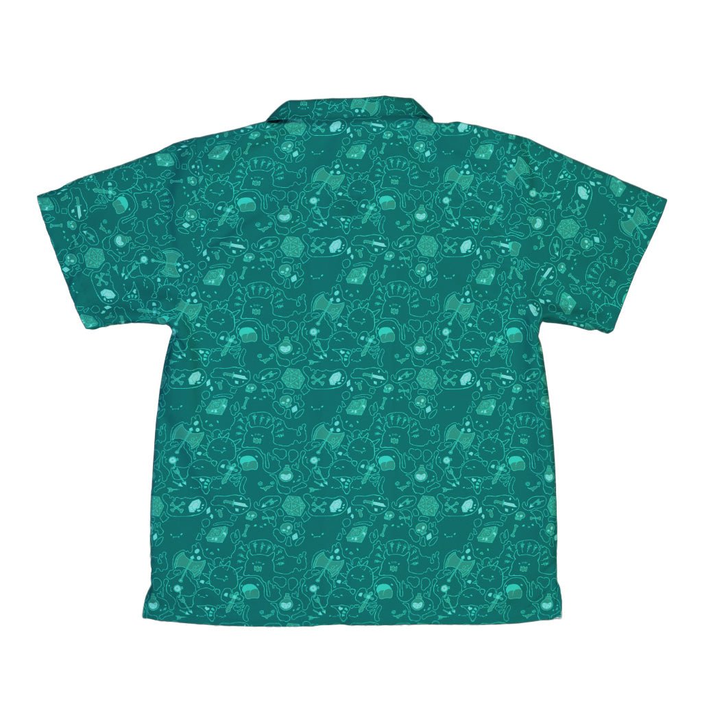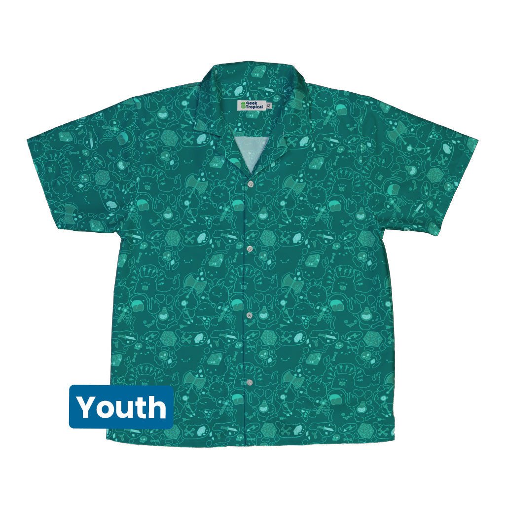Slime Cube Toxic Green Youth Hawaiian Shirt brings gooey dungeon vibes to island style. Designed by Ardi Tong, the print swarms with toxic-green slime cubes—sharp-edged, glossy, and bubbling—marching across a dark backdrop with subtle highlights and drip details. Built for young adventurers, it keeps the look playful yet bold. Artist-backed and eco-minded, each purchase supports the creator and the geeky art you love.