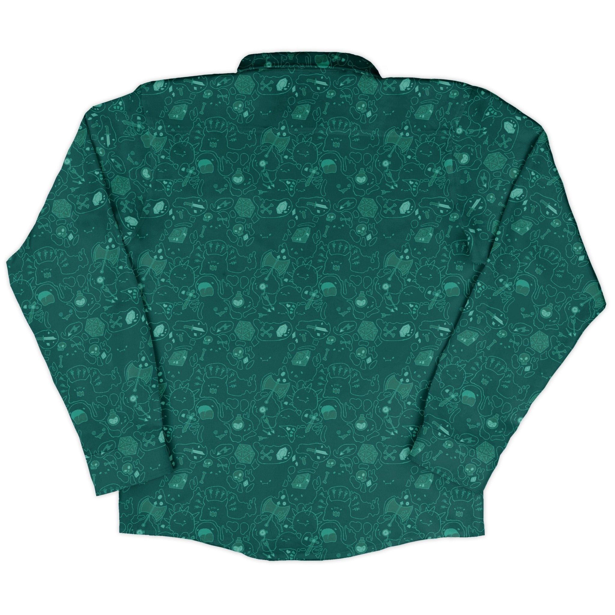 Meet the Slime Cube Toxic Green Long Sleeve Button Up Shirt, a slick ode to Dnd’s most notorious ooze. Luminous toxic-green slime cubes drift across a rich dark backdrop, outlined in inky shadows with bubbly highlights, while the pocket pattern lines up for a seamless look. Built for all-day quests with a soft, easy drape. Designed by Ardi Tong and printed with eco‑minded inks—artist-powered, geek-approved.
