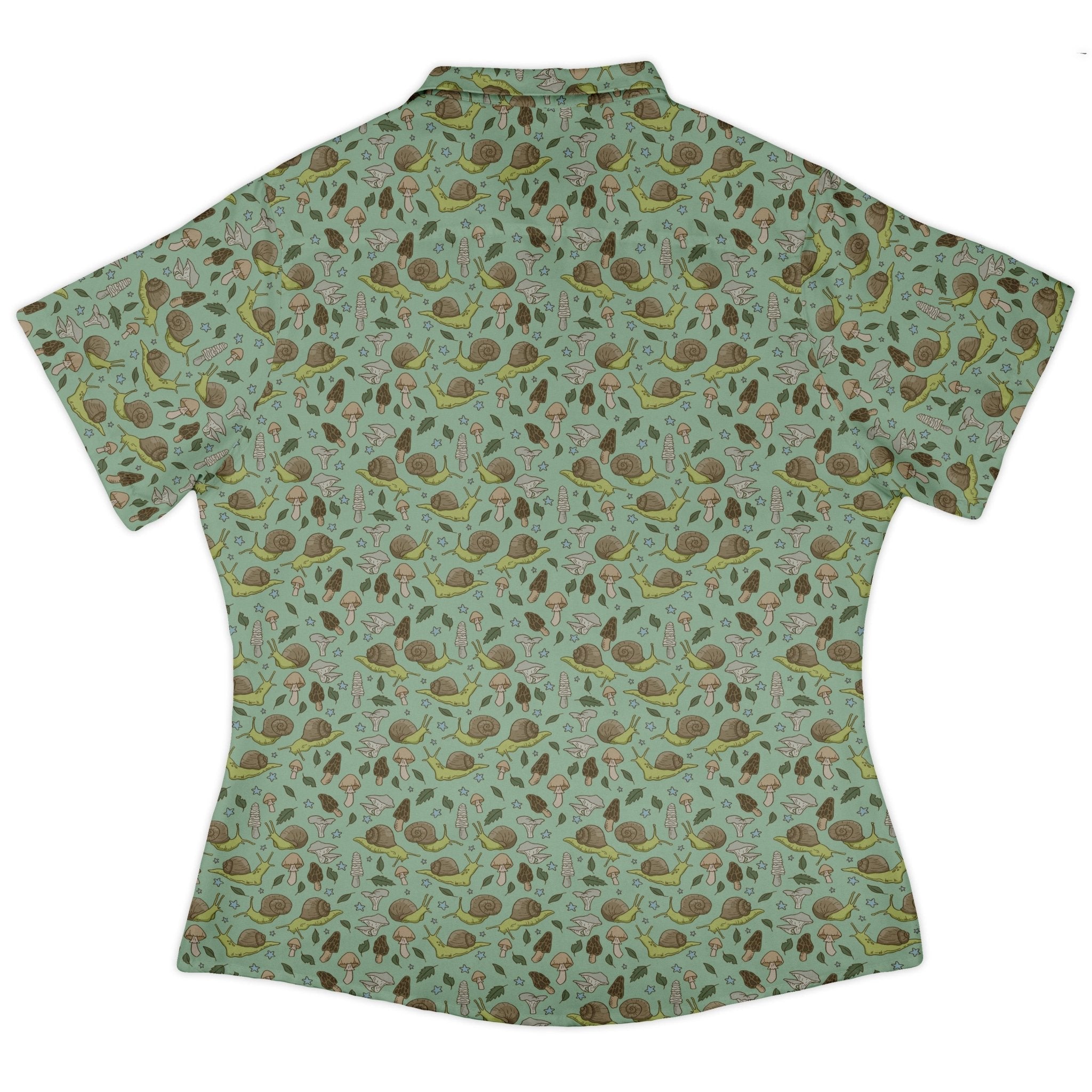 Meet the Slow Spore Trail Curvy Button Up Shirt, a mycology-meets-style piece that turns a field guide into wearable art. Designed by Julie Kitzes, its print drifts with mushroom caps and airy spore trails that align across seams and pocket for a seamless look. Curvy cut flatters and moves, with a neat rounded hem and versatile sleeves. Soft, breathable comfort goes from work to weekend. Printed with eco-conscious inks and finished with distinctive buttons. Every purchase supports licensed artists.