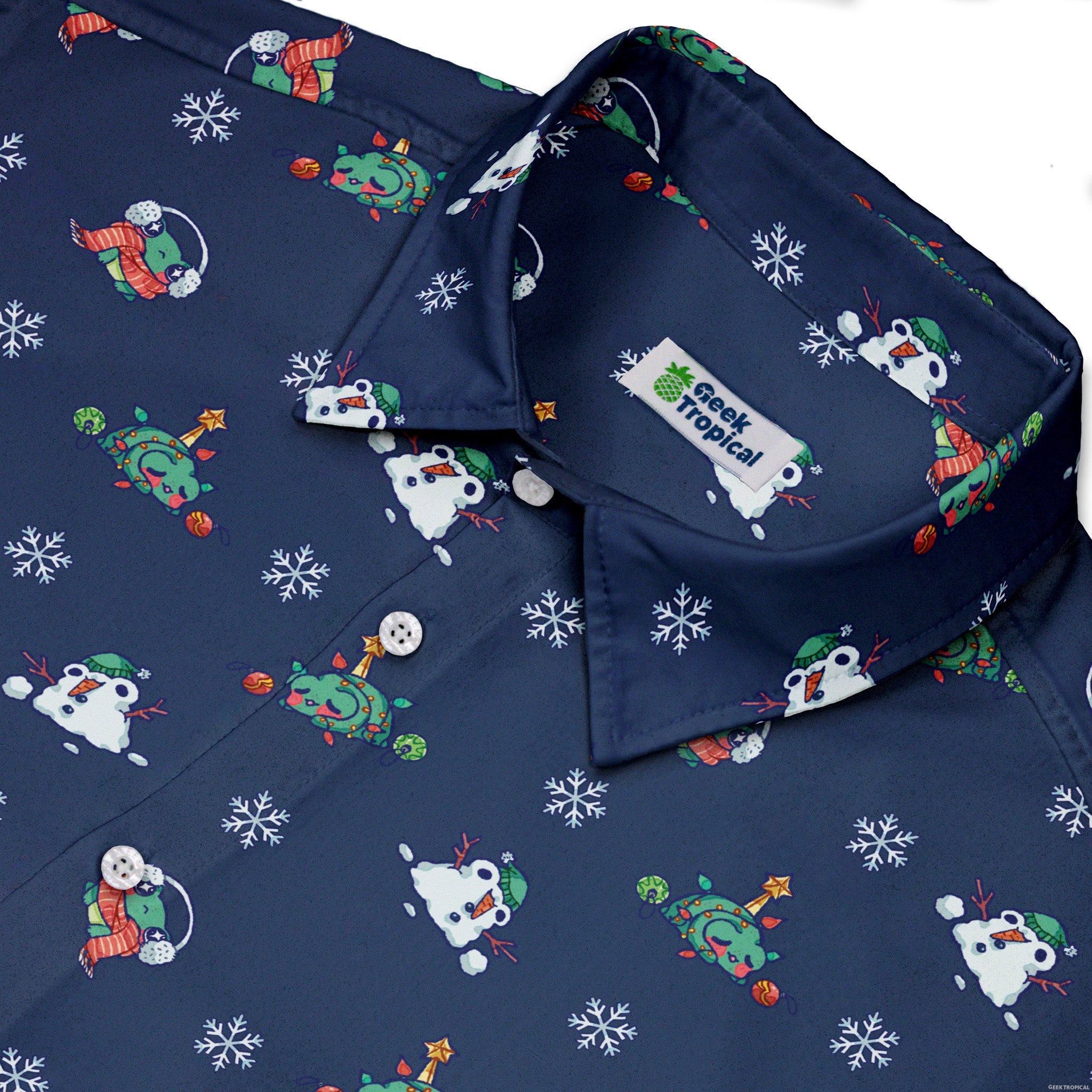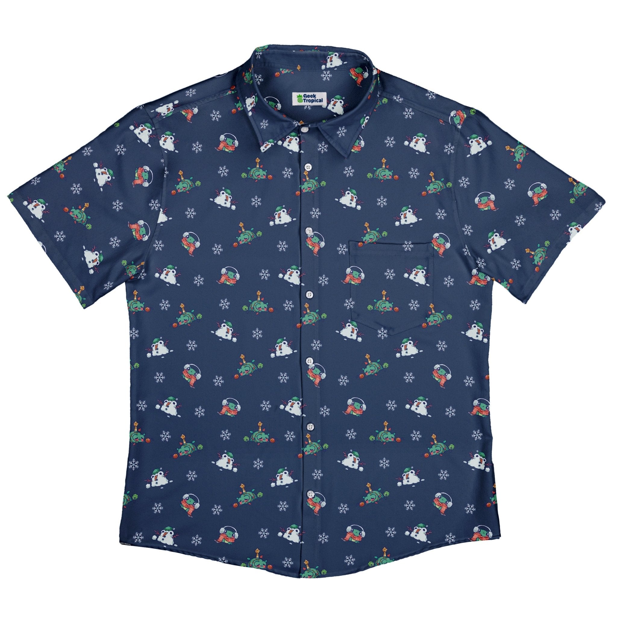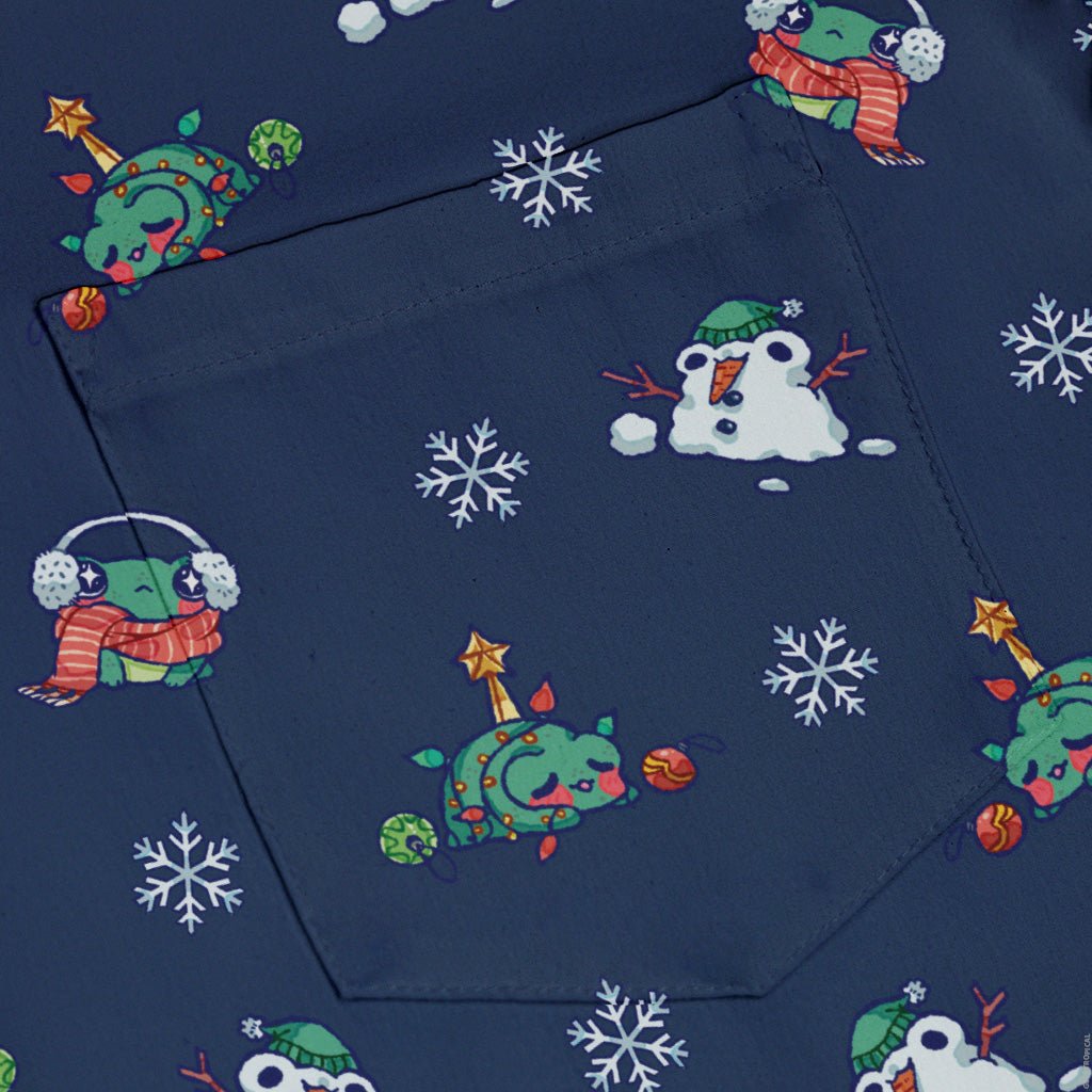 Snowing Frogs Chilly Night Button Up Shirt flips the forecast—tonight it’s frogs. On a dusky winter backdrop, anime-cute green frogs tumble among bright snowflakes, a playful blizzard rendered as a crisp, seamless allover print that flows cleanly across the placket and pocket. Designed by Ardi Tong, this artist-backed piece brings cozy-season whimsy to grown-up wardrobes, printed with eco-conscious inks and ready for holiday mischief.