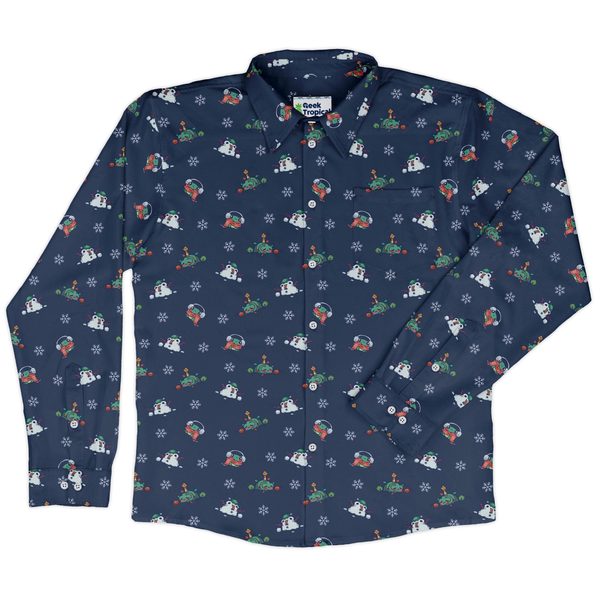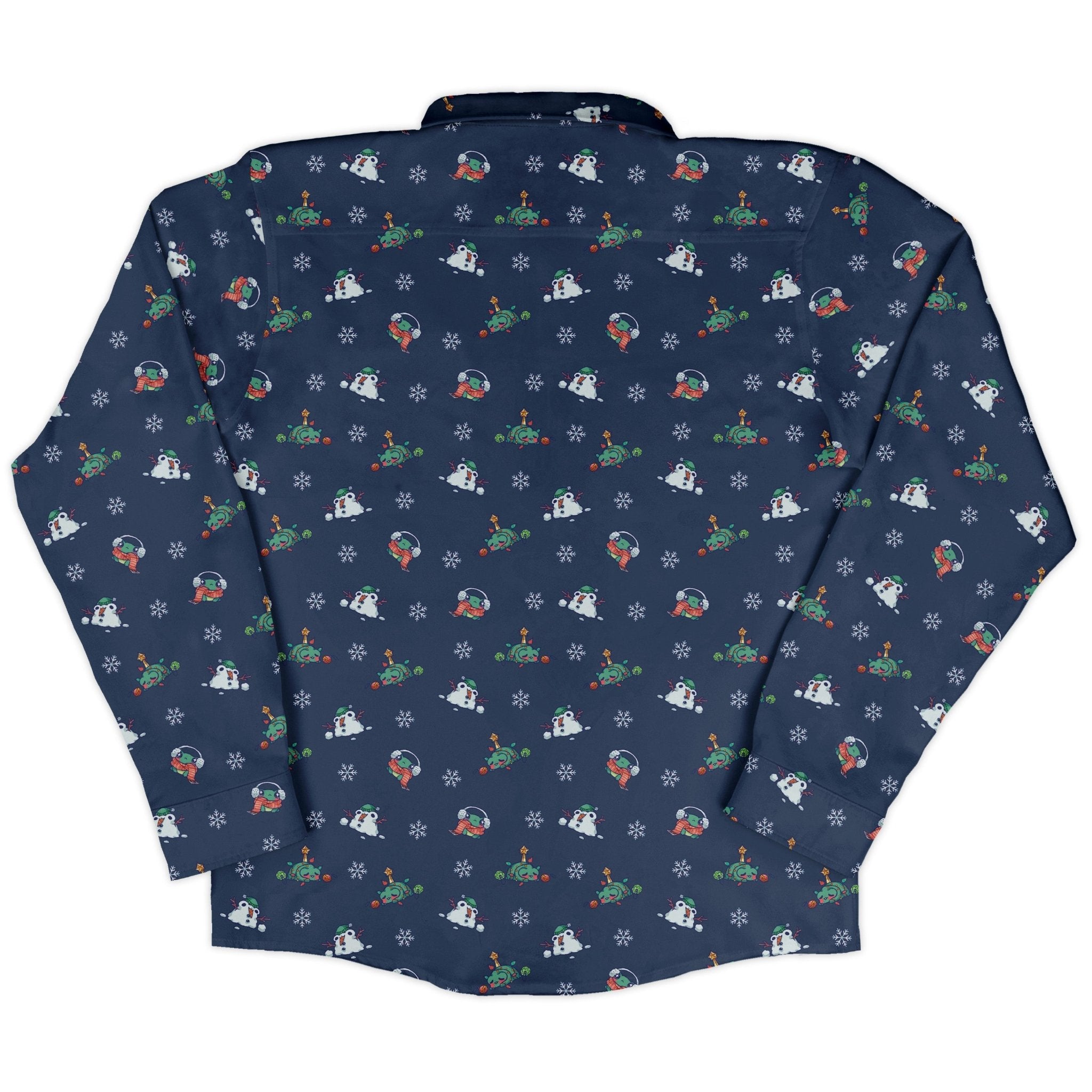 Snowing Frogs Chilly Night Long Sleeve Button Up Shirt takes cozy winter vibes into delightfully odd territory. On a deep night sky, anime-styled green frogs tumble among softly falling snow, turning every glance into a smile. The artwork flows cleanly across the chest pocket for a polished look, with crisp sleeves and clean buttons to finish the fit. Designed by Ardi Tong and printed with eco-conscious inks.