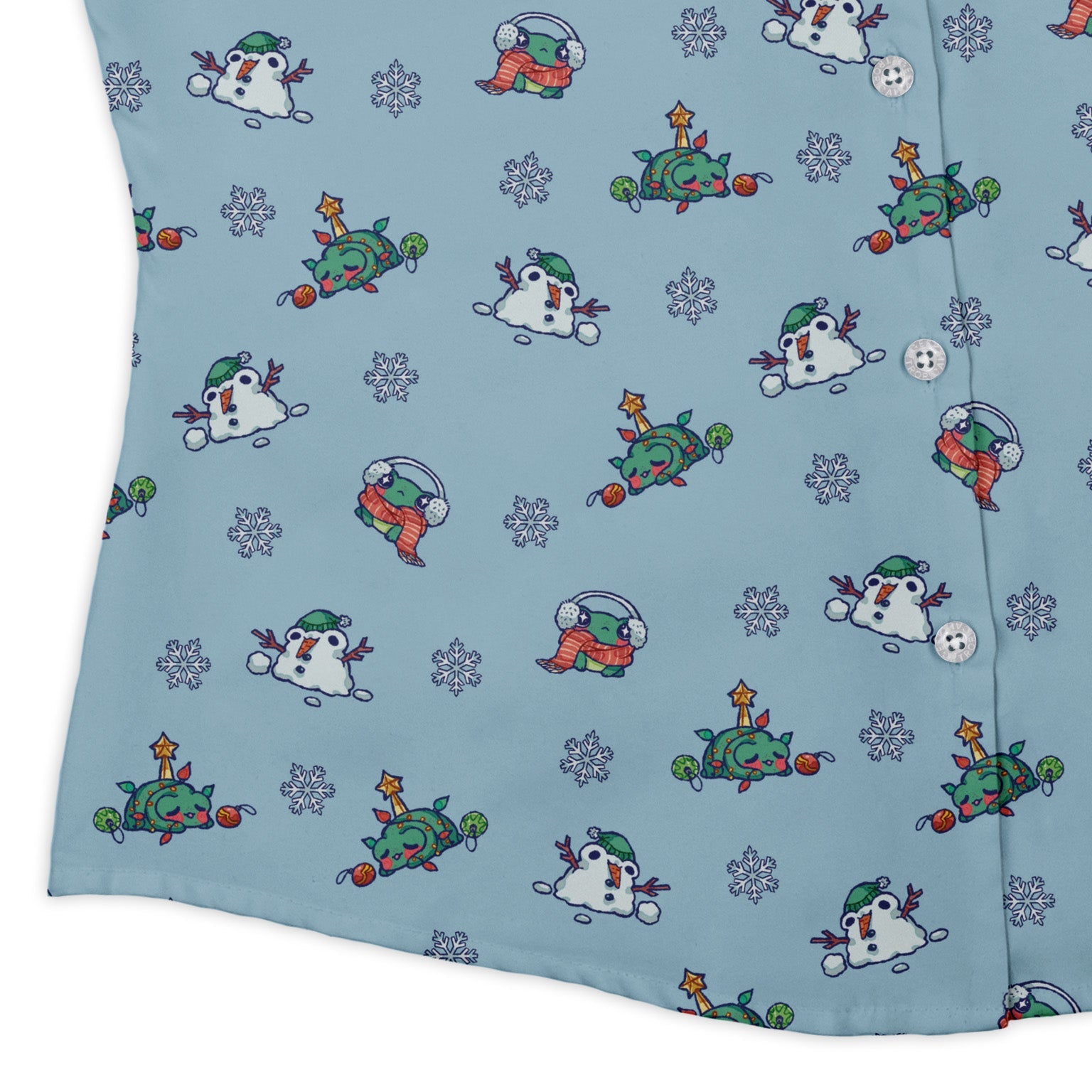 Snowing Frogs Curvy Button Up Shirt brings cheeky holiday whimsy to your wardrobe, with anime-cute frogs drifting like flurries across a snowy scene, designed by Ardi Tong. A curvy cut hugs in the right places with a rounded hem you can wear untucked, plus adjustable sleeves for dialed-in comfort. Soft and light for all-day wear, and printed with eco-conscious inks. Artist-backed, so your style supports creators.