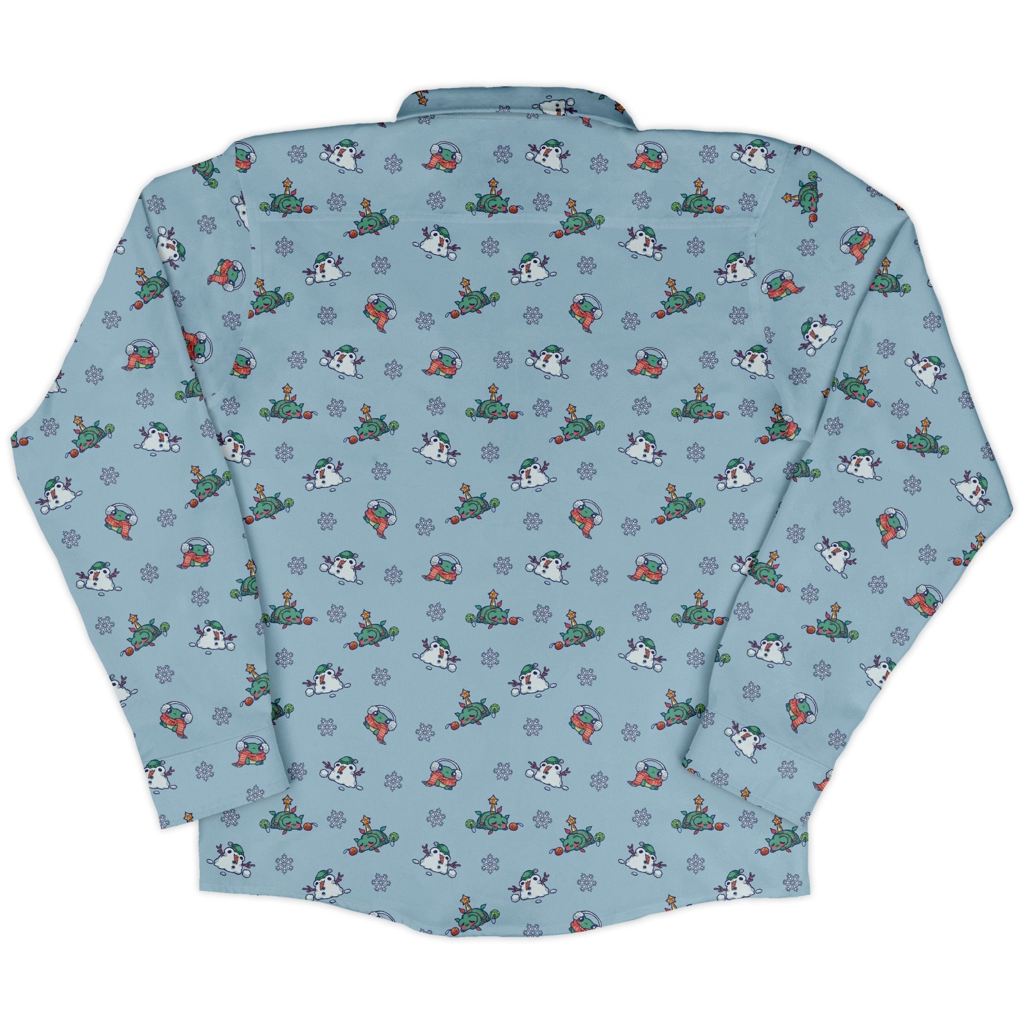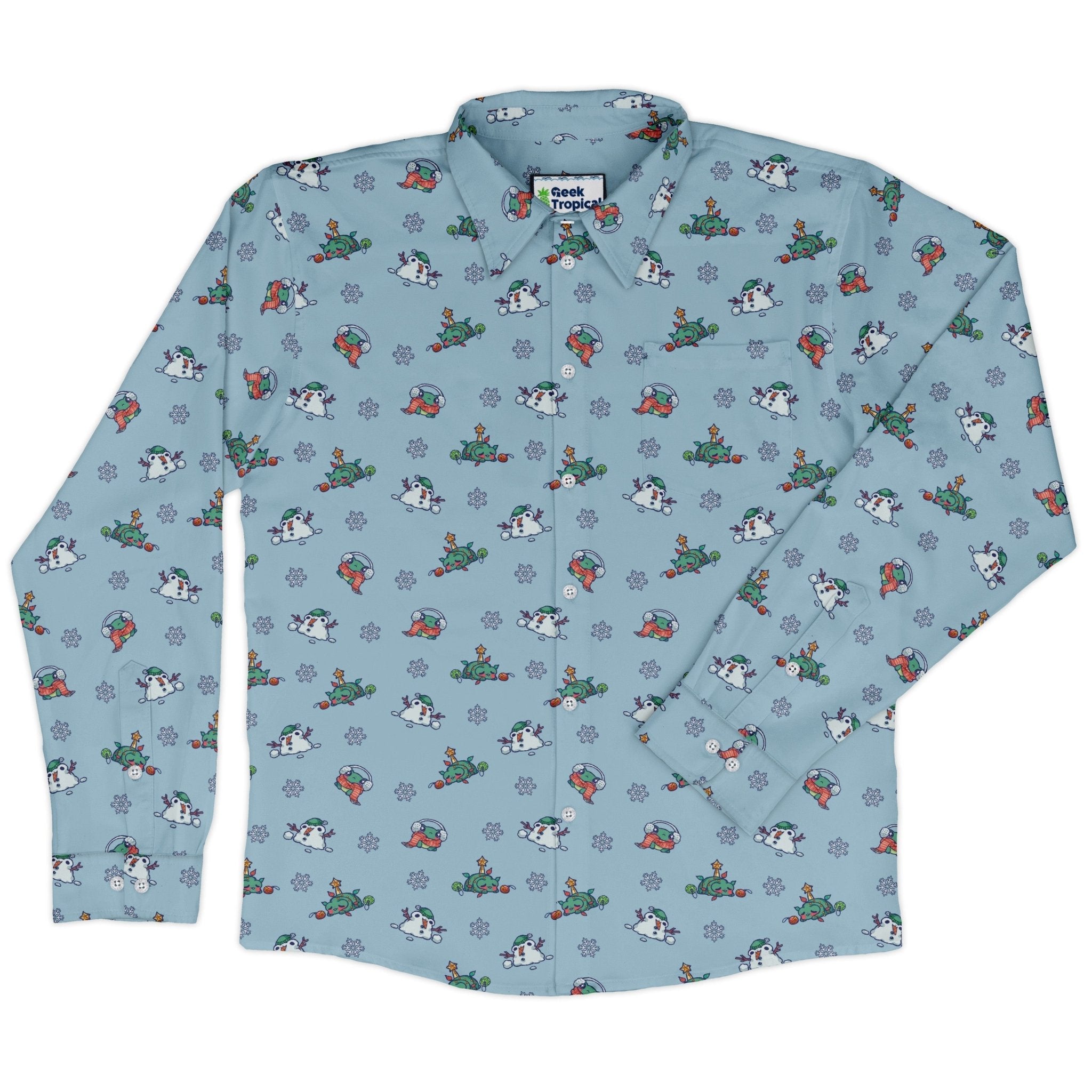 The Snowing Frogs Long Sleeve Button Up Shirt forecasts pure geek joy: a blizzard of anime‑cute amphibians drifting like snow across the print, with crisp detail that pops from any angle. Playfully festive without screaming holiday, it slides from office party to casual quest with ease. Designed by Ardi Tong and artist-backed by Geek Tropical, so your style flex also supports the creator.