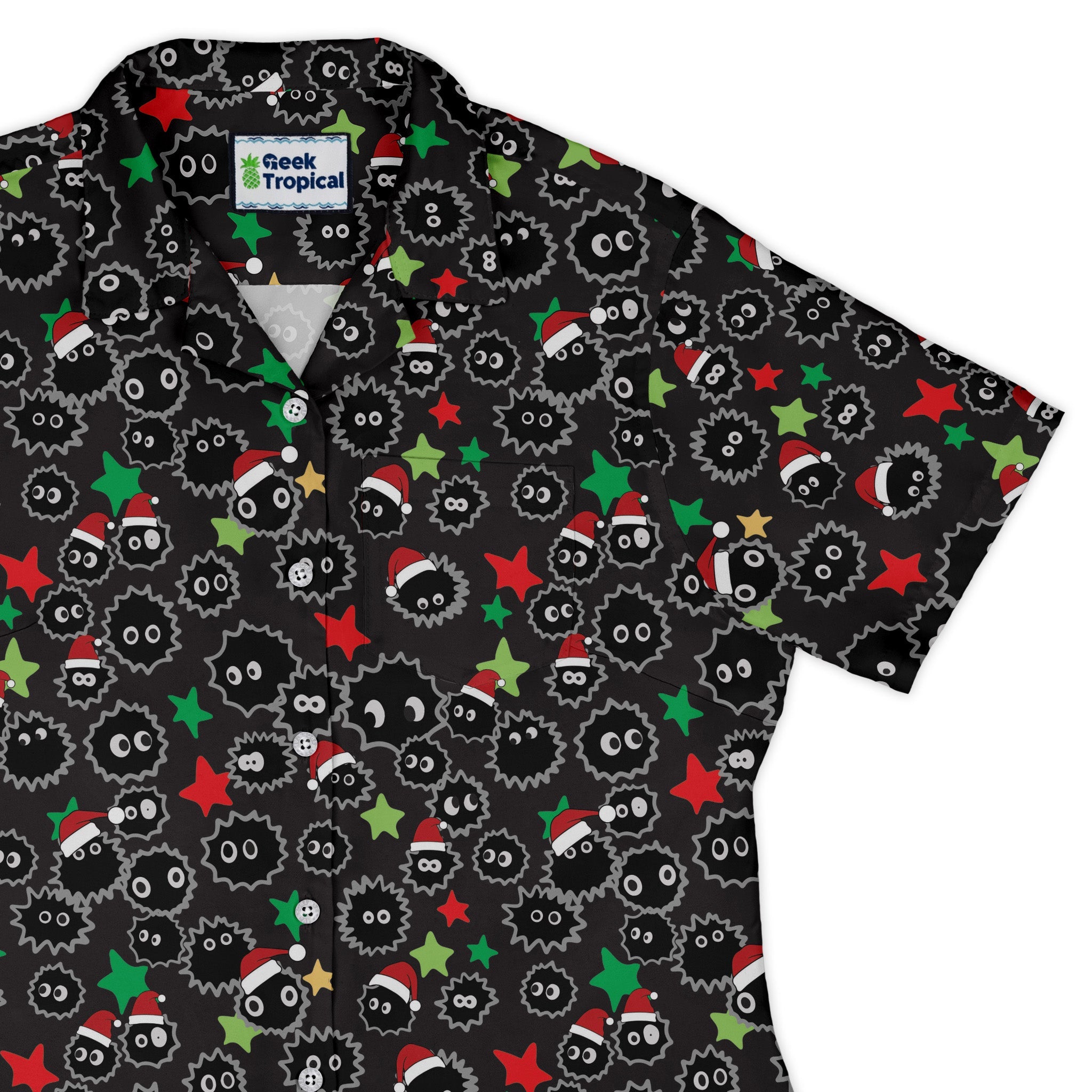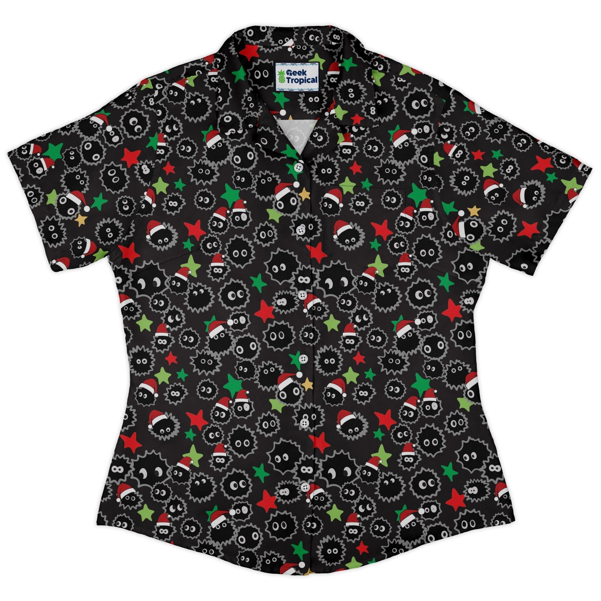 Meet the Sootsprite Santas Curvy Button Up Shirt, a festive flex for anime fans who like their cheer a bit mischievous. Inky soot sprites in red Santa hats pop on a deep charcoal ground, with the print matched across the pocket for a clean flow. Designed by Heather Davenport, the curve-loving fit skims and shapes with adjustable sleeves and an easy curved hem. Soft, breathable, moisture-wicking comfort, quality buttons, and eco-friendly inks, all while supporting the artist.