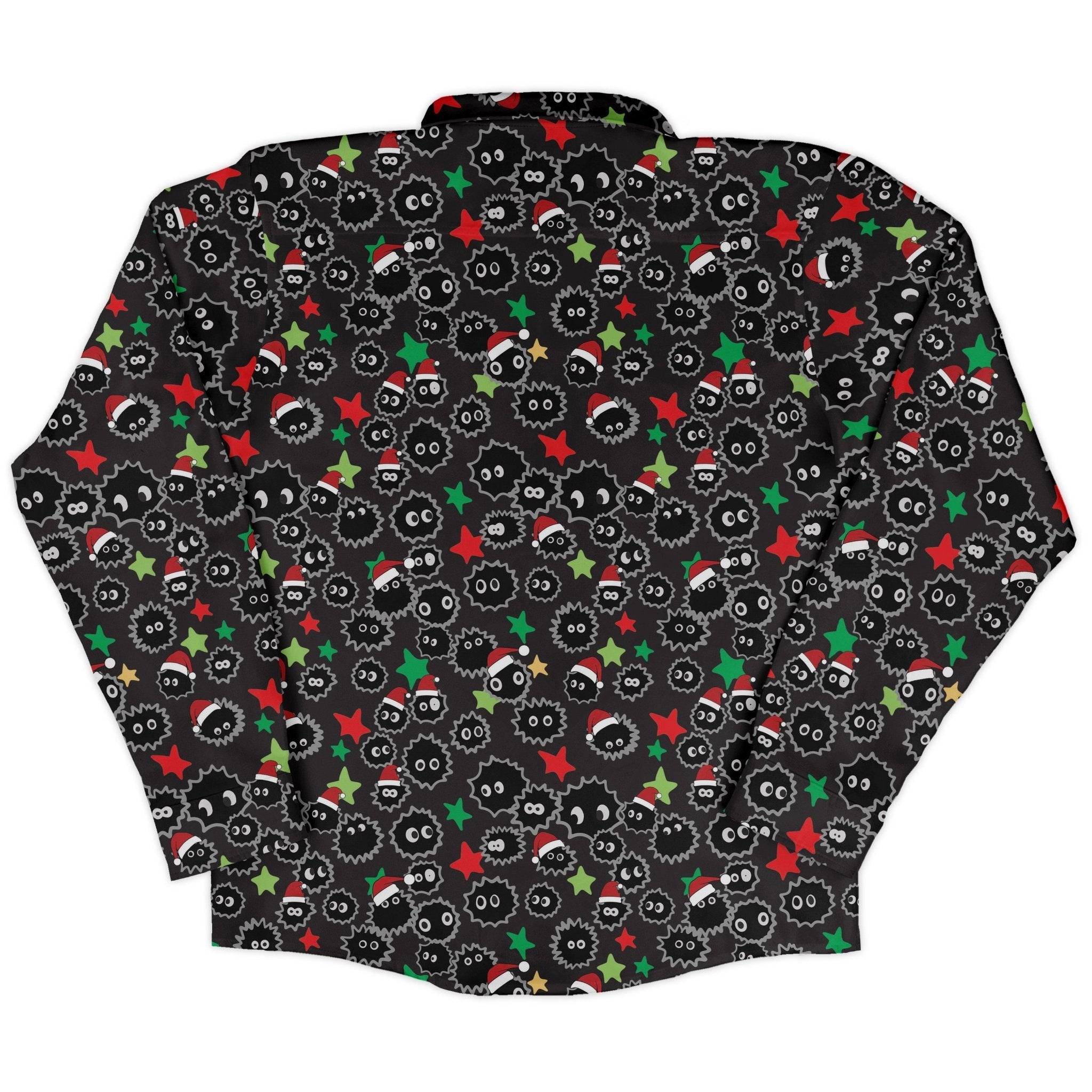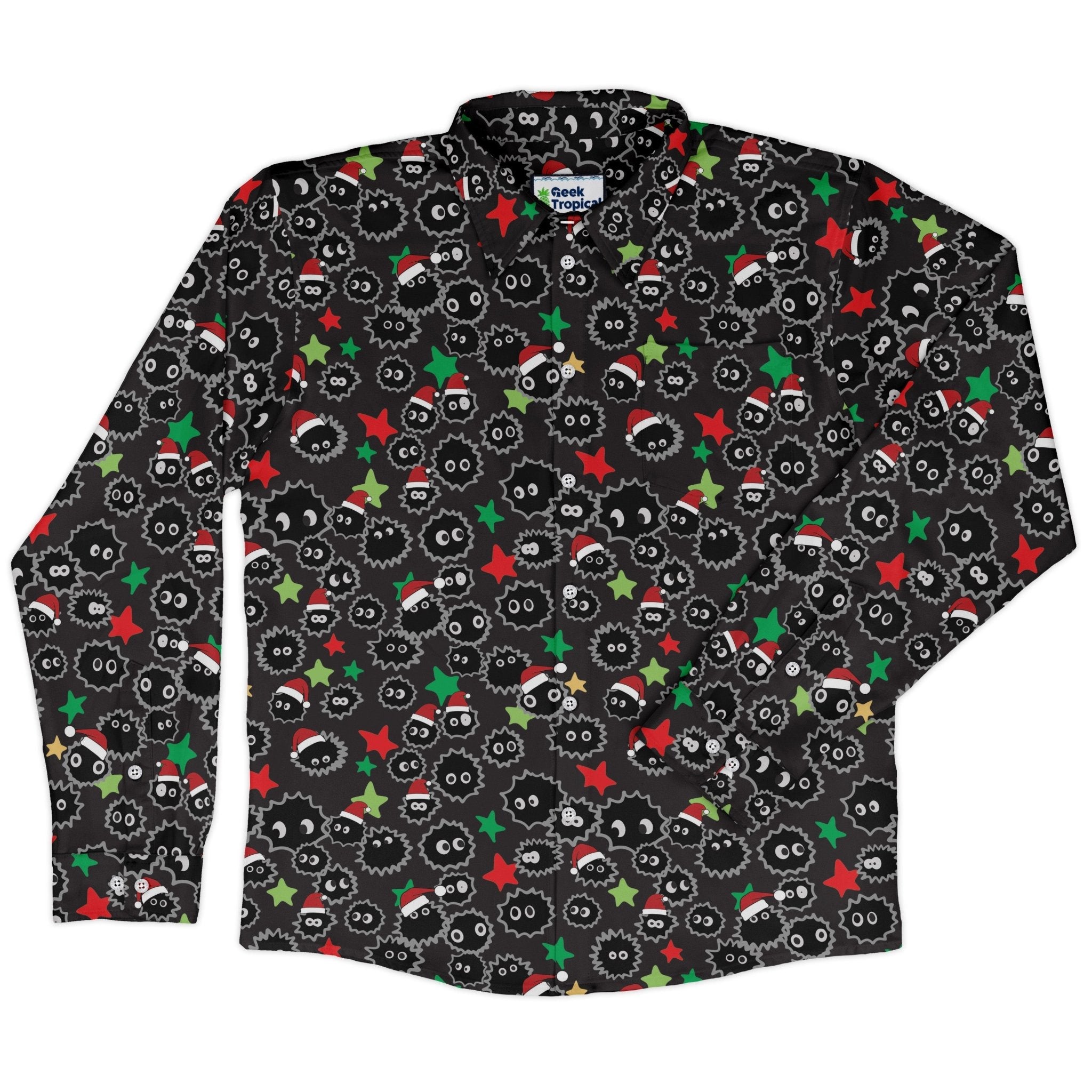 Sootsprite Santas Long Sleeve Button Up Shirt is your festive crossover between cozy and cosplay. A swarm of mischievous soot sprites don tiny Santa hats across an allover holiday pattern for peak anime cheer, with the print flowing cleanly across the placket and pocket for a polished look. Soft, breathable, and ready for marathon movie nights, it’s artist-designed by Heather Davenport and printed with eco-conscious inks to support licensed creators.