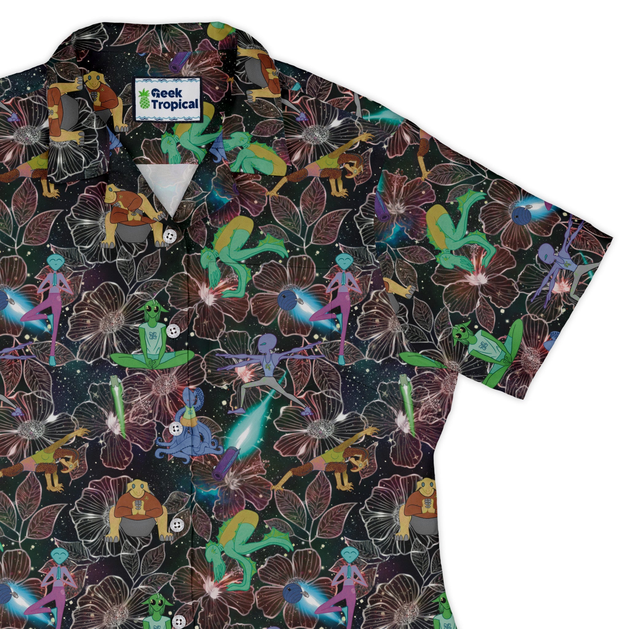 Meet the Space Alien Yoga Red Curvy Button Up Shirt, your playful portal to zen in zero-g. A bold red canvas features calm little space aliens in yoga poses, in an allover print that even aligns across the pocket. Cut for curves with a polished drape, it stays comfy all day. Designed by Nathan with distinctive branded buttons and eco-conscious inks to support licensed artists.
