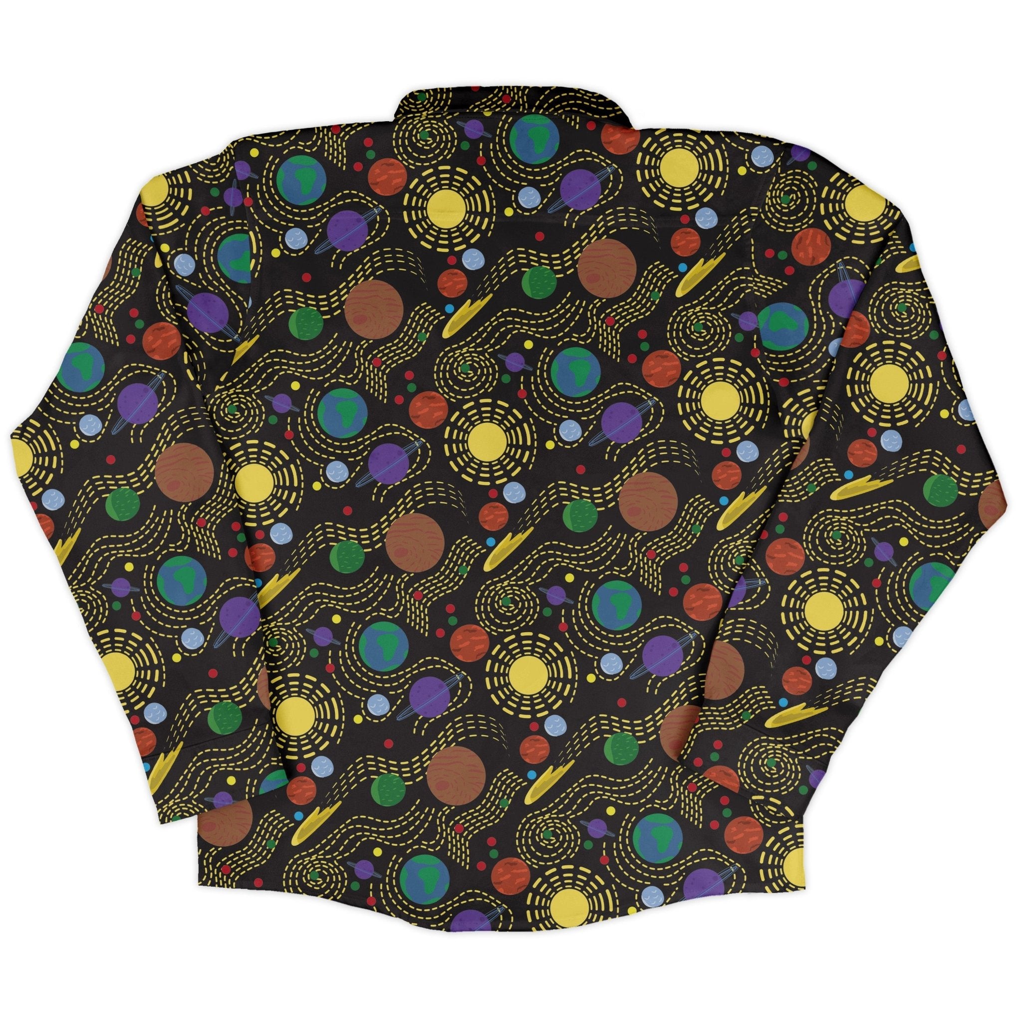 The Space Explorers Long Sleeve Button Up Shirt levels up your wardrobe with a celestial print of astronauts, planets, and twinkling stars, illustrated by Heather Davenport. The artwork lines up cleanly across the front and pocket for a polished look you can wear all day. Easy to style under a blazer or over a tee. Printed with eco‑conscious inks, it’s ready for orbit—from office hours to telescope nights.