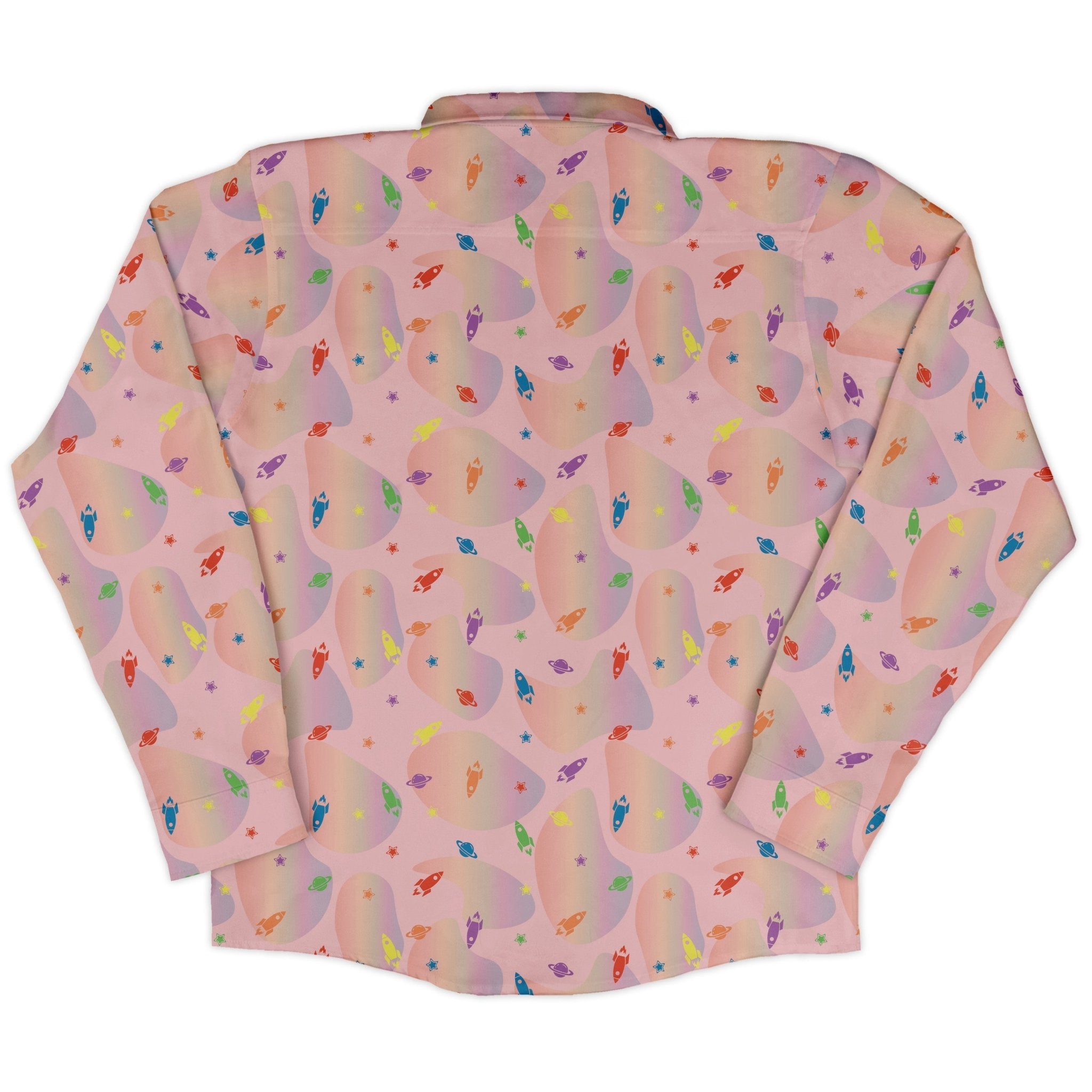 Space Pride Pink Long Sleeve Button Up Shirt paints a soft-rose cosmos with astronauts floating amid pride-rich rainbow accents. The print lines up cleanly across the chest and pocket for a polished look, while tuneable cuffs and signature buttons keep it smart. Soft on skin and easy from con to cocktail. Printed with eco-conscious inks and proudly artist-backed, because your style should support the creators behind the stars.
