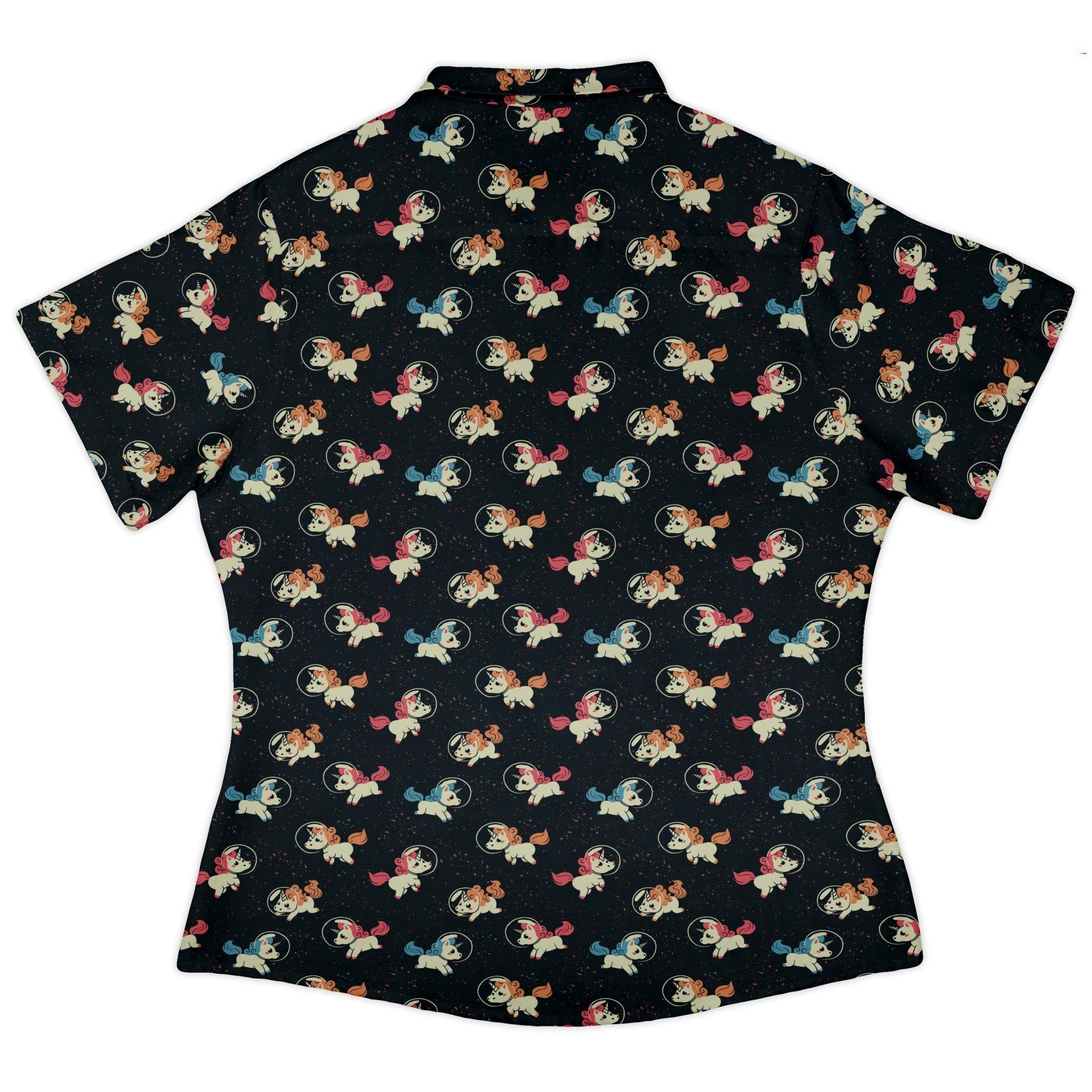 Space Unicorns Curvy Button Up Shirt takes mythic creatures on a cosmic stroll, scattering unicorns across a star‑strewn sky in a bold, maximalist all‑over print designed by Tobe Fonseca. Tailored for curves with a shapely silhouette that flatters untucked, it moves easy from office to con. A pattern‑matched pocket and crisp branded buttons keep the look polished. Artist-backed and sustainably printed for everyday stargazing.