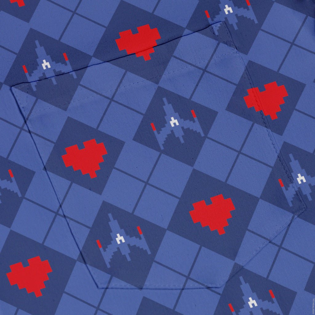 Space Fighter Heart Button Up Shirt launches retro-arcade swagger into your wardrobe, with an all-over pattern of space fighters and heart icons arranged in playful, repeating formations. Crisp collar, easy silhouette, and nerd-chic energy make it ready for office casual or con floor. Designed by Heather Davenport and artist-backed, it levels up your look while keeping the vibe smart, bold, and unmistakably gamer. All the nostalgia, none of the quarters.