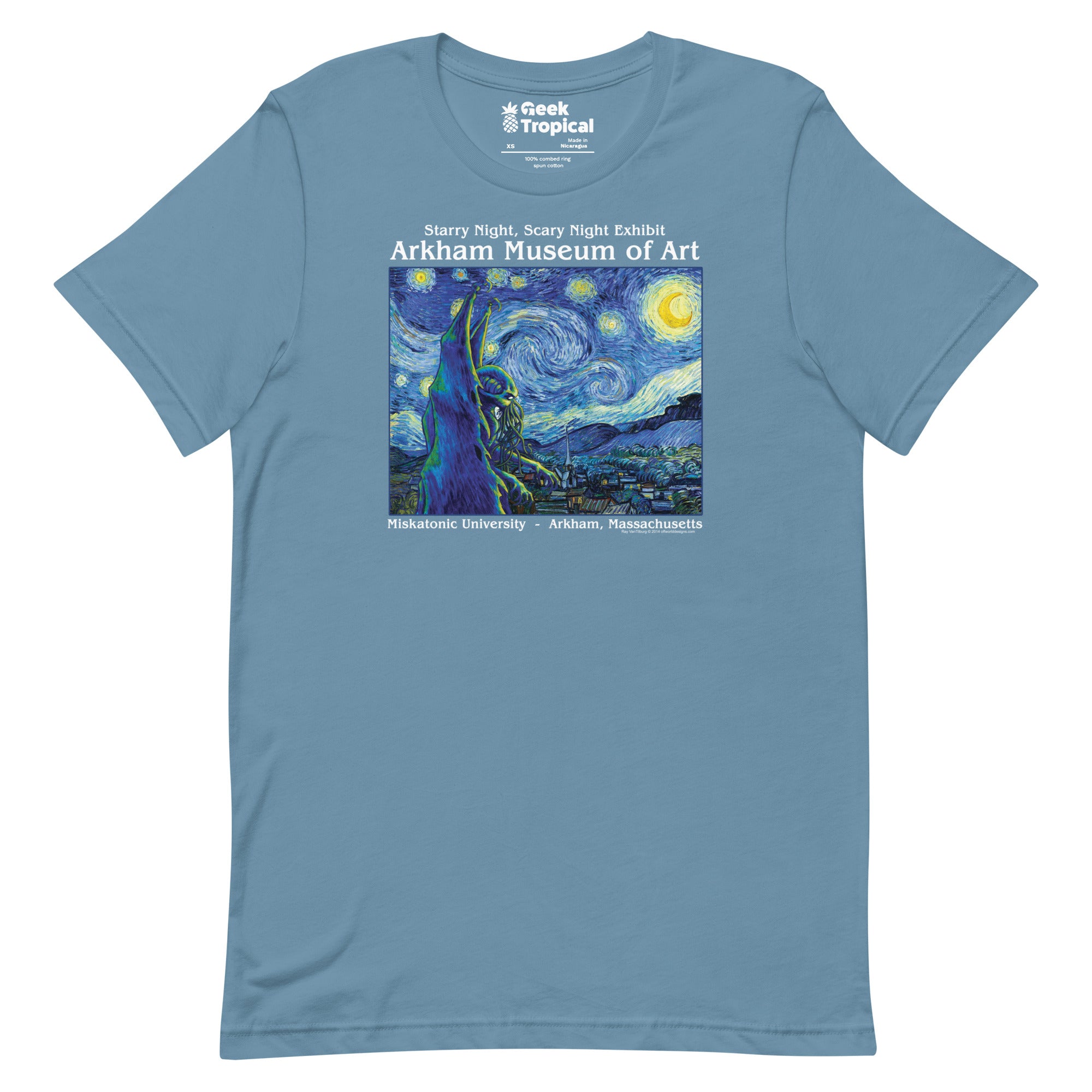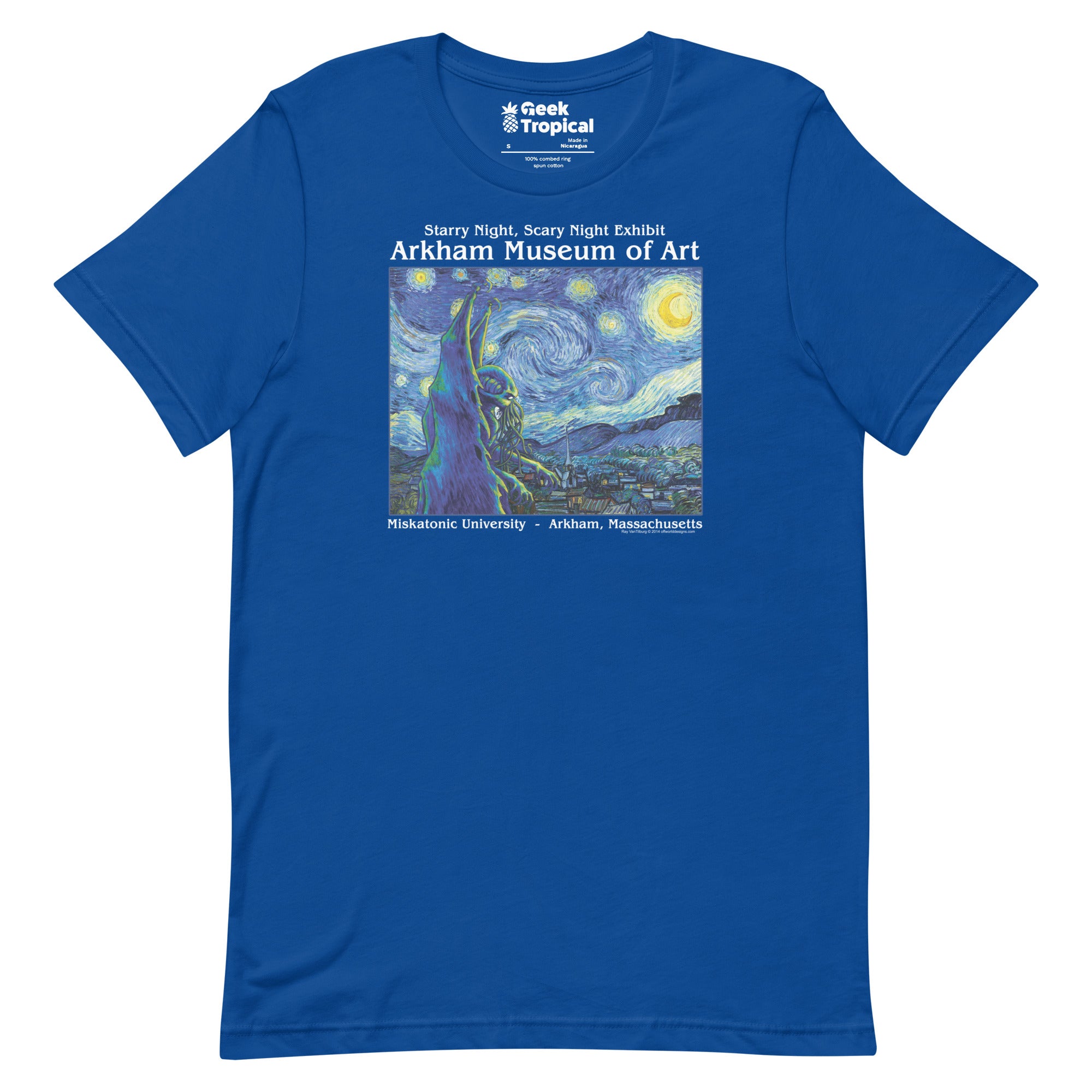 Starry Night Cthulhu T-Shirt merges classic art vibes with cosmic horror. In the print, a tentacled elder rises from swirling, Starry Night–style brushstrokes—bright, orbiting stars and rippling sky contours sketch the ancient shape in luminous contrast. Designed by Off World Designs and artist-backed, it’s an easy flex for Dnd sessions, spooky season, and anyone who loves their space beautifully unsettling.