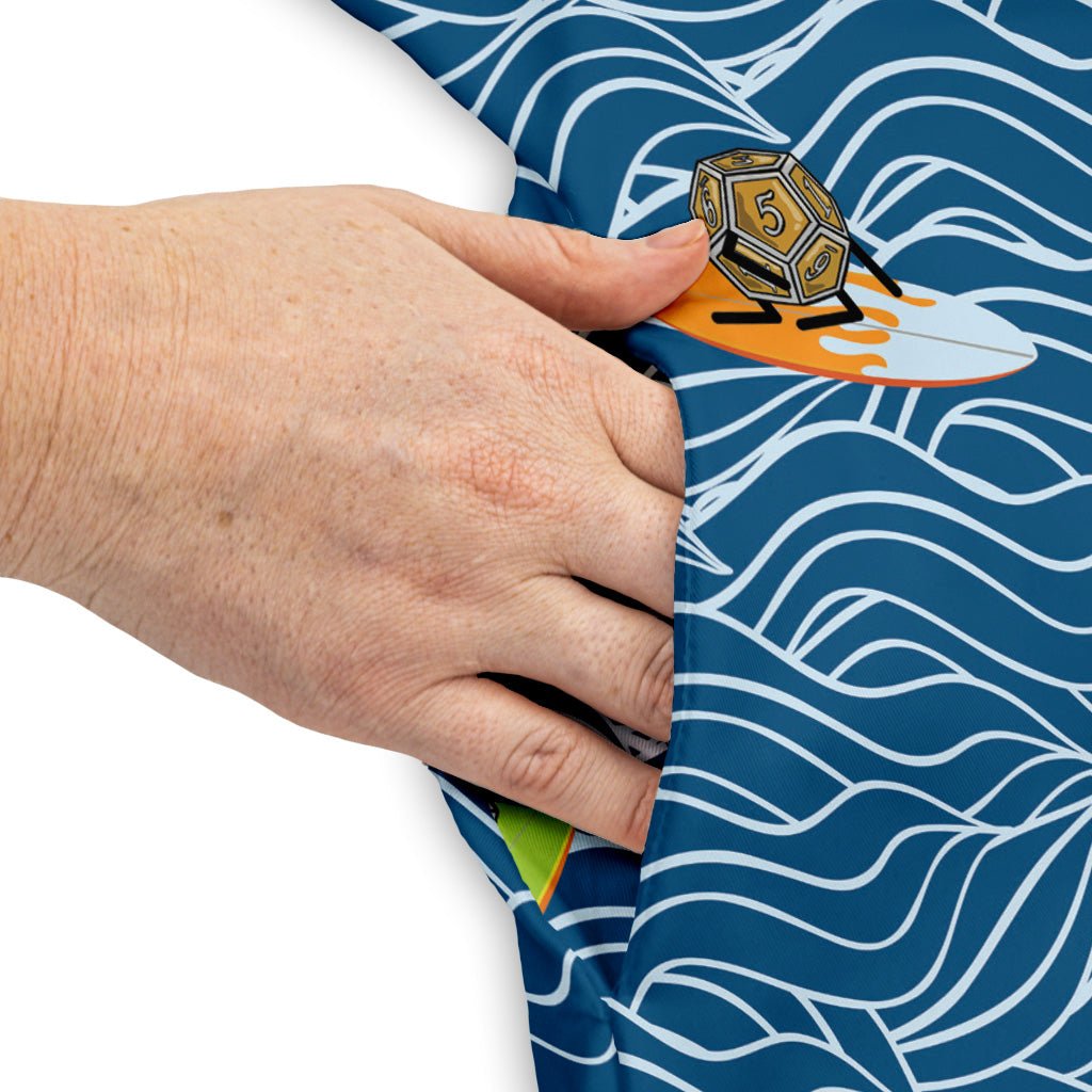Surf And Roll Dnd Dice Dress brings beach energy to game night, pairing surfy wavework with rolling dice in an all-over print. The design pops without being loud, and the smooth, breathable fabric moves with you while staying confidently opaque. Practical too: real side pockets for your essentials. Designed by Dunking Toast and proudly artist-backed—ready to roll from seaside strolls to session zero.