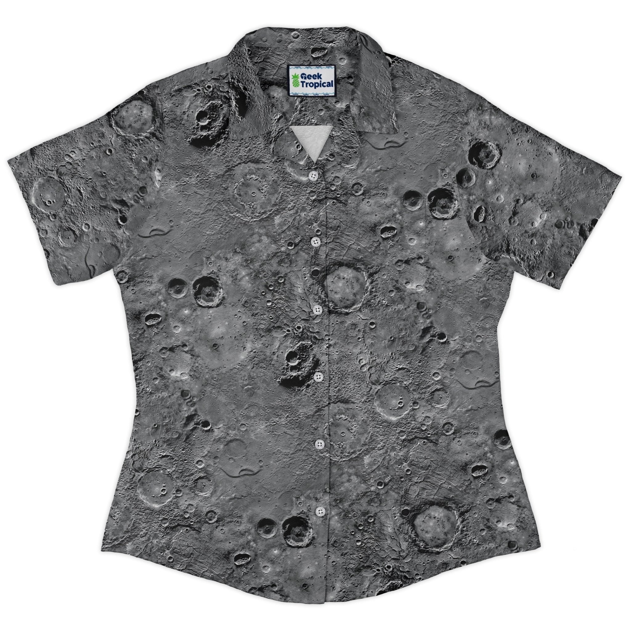 Surface of Mercury Curvy Button Up Shirt maps the innermost planet onto a sleek, curve-loving silhouette. The all-over print showcases cratered terrain and impact basins in crisp detail, flowing uninterrupted across the front for a clean, gallery-grade vibe. Tailored for women with an untucked-friendly hem and adjustable sleeves, finished with distinctive buttons. Designed by Nathan, printed with eco-conscious inks, and your purchase supports the artist.